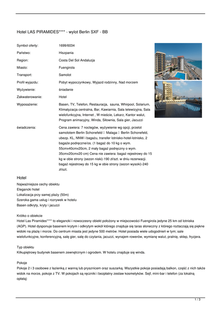 Hotel LAS PIRAMIDES**** - wylot Berlin SXF - BB Symbol oferty: 1699/6034 Państwo: Hiszpania Region: Costa Del Sol Andaluzja Miasto: Fuengirola Transport: Samolot Profil wyjazdu: Pobyt wypoczynkowy, Wyjazd rodzinny, Nad morzem Wyżywienie: śniadanie Zakwaterowanie: Hotel Wyposażenie: Basen, TV, Telefon, Restauracja, sauna, Whirpool, Solarium, Klimatyzacja centralna, Bar, Kawiarnia, Sala telewizyjna, Sala wielofunkcyjna, Internet , W mieście, Lekarz, Kantor walut, Program animacyjny, Winda, Siłownia, Sala gier, Jacuzzi świadczenia: Cena zawiera: 7 noclegów, wyżywienie wg opcji, przelot samolotem Berlin Schonefeld Malaga Berlin Schonefeld, ubezp. KL, NNW i bagażu, transfer lotniskohotellotnisko, 2 bagaże podręczne/os. (1 bagaż do 10 kg o wym. 55cmx40cmx20cm, 2 mały bagaż podręczny o wym. 35cmx20cmx20 cm) Cena nie zawiera: bagaż rejestrowy do 15 kg w obie strony (sezon niski)-190 zł/szt. w dniu rezerwacji. bagaż rejestrowy do 15 kg w obie strony (sezon wysoki)-240 zł/szt. Hotel Najważniejsze cechy obiektu Elegancki hotel Lokalizacja przy samej plaży (50m) Szeroka gama usług i rozrywek w hotelu Basen odkryty, kryty i jacuzzi Krótko o obiekcie Hotel Las Piramides**** to elegancki i nowoczesny obiekt położony w miejscowości Fuengirola jedyne 25 km od lotniska (AGP). Hotel dysponuje basenem krytym i odkrytym wokół którego znajduje się taras słoneczny z którego roztaczają się piękne widoki na plażę i morze. Do centrum miasta jest jedyne 500 metrów. Hotel posiada wiele udogodnień w tym; sale wielofunkcyjne, konferencyjną, salę gier, salę do czytania, jacuzzi, wynajem rowerów, wymianę walut, pralnię, sklep, fryzjera. Typ obiektu Kilkupiętrowy budynek basenem zewnętrznym i ogrodem. W hotelu znajduje się winda. Pokoje Pokoje 2 i 3 osobowe z łazienką z wanną lub prysznicem oraz suszarką. Wszystkie pokoje posiadają balkon, część z nich także widok na morze, pokoje z TV. W pokojach są ręczniki i bezpłatny zestaw kosmetyków. Sejf, mini-bar i telefon (za lokalną opłatą) 1/3 Do dyspozycji Do dyzpozycji gości recepcja, przechowalnia bagażu, winda, restauracja, kawiarnia i bar. W hotelu można korzystać z basenu zewnętrznego oraz wewnętrznego, tarasu słonecznego i leżaków oraz parasoli. Na terenie obiektu także sklep oraz wymina walut, sauna, solarium oraz sala gimnastyczna. Bezpłatny internet bezprzewodowy w pomieszczeniach ogólnodostępnych. Można także skorzystać z usług opieki nad dziećmi, usług medycznych oraz usług pralni. Plaża Publiczna piaszczysta plaża obok hotelu (po drugiej stronie ulicy) Wyżywienie Oferta z następującymi opcjami wyżywienia: BB: śniadania w formie bufetu HB: śniadania i obiadokolacje w formie bufetu Program ramowy: Dzień 1 - wylot z Polski, przylot, transfer do hotelu, zakwaterowanie w hotelu Dzień 1-8 - pobyt i aktywność własna Dzień 8 - opuszczanie pokoi, oczekiwanie na transfer, transfer na lotnisko, przylot do Polski Godziny odlotu i przylotu: Godziny odlotu i przylotu: Berlin Schonefeld › Malaga do 23.03 tam CZW 20:05 - 23:35 od 30.03 tam CZW. 11:10 - 14:35 Malaga › Berlin Schonefeld do 23.03 pow. CZW 15:55 - 19:35 od 30.03 pow. CZW 07:10 - 10:45 Cena zawiera: 7 noclegów wyżywienie wg wybranej opcji przelot samolotem Berlin Schonefeld - Malaga - Berlin Schonefeld ubezpieczenie KL, NNW i bagażu transfer lotnisko-hotel-lotnisko 2 bagaże podręczne (1 bagaż do 10 kg o wymiarach 55cm x 40cm x 20cm, 2 mały bagaż podręczny o wymiarach 35cm x 20cm x 20 cm) Cena nie zawiera: bagaż rejestrowy do 15 kg w obie strony (sezon niski) - dopłata 190 zł/szt. Cena obowiązuje w dniu rezerwacji. Sezon niski obejmuje daty w okresie: 01/10/16 - 20/12/16 05/01/17 - 31/05/17 bagaż rejestrowy do 15 kg w obie strony (sezon wysoki) - dopłata 240 zł/szt. Cena obowiązuje w dniu rezerwacji. Sezon wysoki obejmuje daty w okresie: 21/12/16 - 04/01/17 01/06/17 - 30/09/17 Dzieci/ulgi: 1 i 2 dziecko do 11,99 lat na łóżku pomocniczym - zniżka 20% dzieci do lat 1,99 przy 2 osobach dorosłych - stała cena 380 zł 2/3 Suplementy/pozostałe: pokój 1-osobowy - dopłata 40% ubezpieczenie KR 5% wartości rezerwacji Uwagi: zaliczka 30% wartości rezerwacji dla ofert opartych na transporcie lotniczym rejsowym przed zakupem prosimy o sprawdzenie dostępności terminów i obiektów TERMINY: od: 2017-03-16 do: 2017-03-23 (8 dni), miejsca: sprawdź miejsca cena od: 1249 PLN od: 2017-03-23 do: 2017-03-30 (8 dni), miejsca: sprawdź miejsca cena od: 1249 PLN od: 2017-03-30 do: 2017-04-06 (8 dni), miejsca: sprawdź miejsca cena od: 1599 PLN CENNIK: Długość pobytu: 8 dni 8 dni Grupa cenowa: A E (-) (-) (-) (-) (-) (-) (-) (-) 640 500 (-) (-) (-) (-) 240 240 190 190 1599 1249 1279 999 (-) (-) 5% 5% Transport (do wyboru) (*) samolot Pobyt w obiekcie (do wyboru) DBL + dostawka standardowo dla osób: 3 (*) pokój 2 os. standardowo dla osób: 2 pokój 3 os. SGL Transport - wyjazd (do wyboru) (*) przelot Berlin Schonefeld - Malaga Transport - przyjazd (do wyboru) (*) przelot Malaga - Berlin Schonefeld Inne (opcjonalne) Bagaż rejestrowy do 15kg - wysoki sezon Bagaż rejestrowy do 15kg - sezon niski Rodzaj osoby (do wyboru) (*) Osoba dorosła Dziecko 2-12 lat przy 2 osobach dorosłych Ubezpieczenie (do wyboru) (*) ubezpieczenie KL, NNW i bagażu Ubezpieczenie (opcjonalne) Koszty rezygnacji 5% Waluta: PLN Aktualne ceny z systemu S.A.R.T. (-) - cena usługi, podatku kalkulowana przy osobie lub gratis (*) - kwota wliczona w cenę standardową 3/3