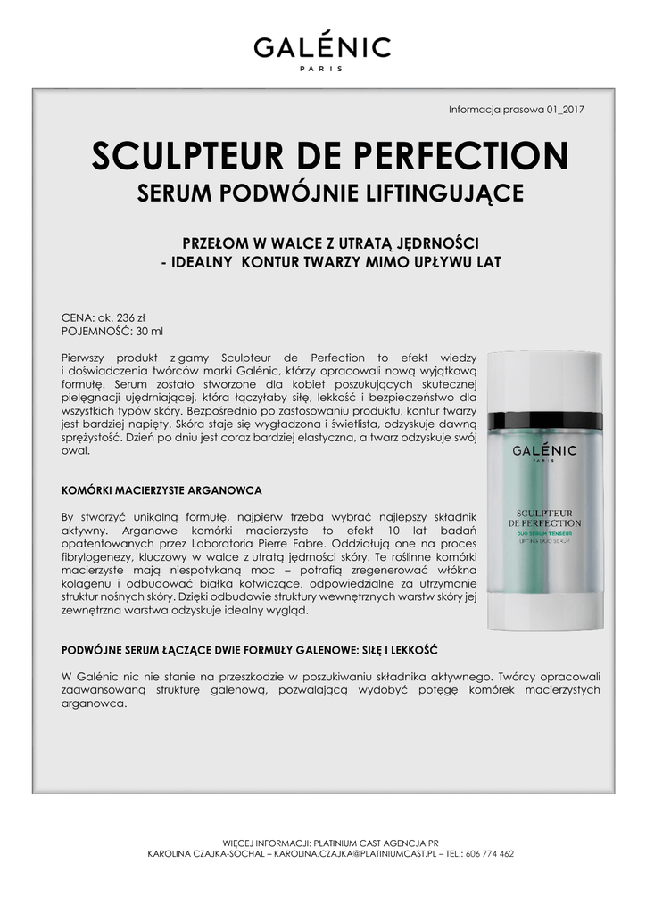 Informacja prasowa 01_2017 SCULPTEUR DE PERFECTION SERUM PODWÓJNIE LIFTINGUJĄCE PRZEŁOM W WALCE Z UTRATĄ JĘDRNOŚCI - IDEALNY KONTUR TWARZY MIMO UPŁYWU LAT CENA: ok. 236 zł POJEMNOŚĆ: 30 ml Pierwszy produkt z gamy Sculpteur de Perfection to efekt wiedzy i doświadczenia twórców marki Galénic, którzy opracowali nową wyjątkową formułę. Serum zostało stworzone dla kobiet poszukujących skutecznej pielęgnacji ujędrniającej, która łączyłaby siłę, lekkość i bezpieczeństwo dla wszystkich typów skóry. Bezpośrednio po zastosowaniu produktu, kontur twarzy jest bardziej napięty. Skóra staje się wygładzona i świetlista, odzyskuje dawną sprężystość. Dzień po dniu jest coraz bardziej elastyczna, a twarz odzyskuje swój owal. KOMÓRKI MACIERZYSTE ARGANOWCA By stworzyć unikalną formułę, najpierw trzeba wybrać najlepszy składnik aktywny. Arganowe komórki macierzyste to efekt 10 lat badań opatentowanych przez Laboratoria Pierre Fabre. Oddziałują one na proces fibrylogenezy, kluczowy w walce z utratą jędrności skóry. Te roślinne komórki macierzyste mają niespotykaną moc – potrafią zregenerować włókna kolagenu i odbudować białka kotwiczące, odpowiedzialne za utrzymanie struktur nośnych skóry. Dzięki odbudowie struktury wewnętrznych warstw skóry jej zewnętrzna warstwa odzyskuje idealny wygląd. PODWÓJNE SERUM ŁĄCZĄCE DWIE FORMUŁY GALENOWE: SIŁĘ I LEKKOŚĆ W Galénic nic nie stanie na przeszkodzie w poszukiwaniu składnika aktywnego. Twórcy opracowali zaawansowaną strukturę galenową, pozwalającą wydobyć potęgę komórek macierzystych arganowca. WIĘCEJ INFORMACJI: PLATINIUM CAST AGENCJA PR KAROLINA CZAJKA-SOCHAL – [email protected] – TEL.: 606 774 462 SERUM ZIELONE – „EFEKT NAPINAJĄCY“ Zawiera komórki macierzyste arganowca o głębokim działaniu przeciwstarzeniowym oraz mikrowłókna polimerowe zamknięte w hydro-alkoholowym żelu, który wyparowując, daje efekt napinający. Ten mechanizm zapewnia natychmiastowe napięcie skóry, od którego można się uzależnić SERUM MLECZNE „EFEKT DRUGIEJ SKÓRY“ Precyzyjny dobór i doskonałe proporcje składników odżywczych zapewniają uczucie komfortu. Doskonałe wykończenie zapewniają posrebrzane perłowe drobinki rozświetlające cerę, pigmenty korygujące i maskujące niedoskonałości. DLACZEGO SERUM JEST PODWÓJNE? Gdy twórcy Galénic połączyli te dwie formuły w jedną, okazało się, że są one niekompatybilne. Stworzenie podwójnego serum okazało się rozwiązaniem idealnym. POŁĄCZENIE DWÓCH SERUM NA SKÓRZE ETAP 1: Skórę otula serum zielone. Dzięki wyparowaniu żelu hydro-alkoholowego mikrowłókna dają maksymalny efekt napinający. ETAP 2: Do działania przystępuje lekkie serum mleczne dające efekt „drugiej skóry“. Delikatnie pokrywa serum zielone, zapewniając natychmiastowe uczucie komfortu. SCULPTEUR DE PERFECTION SERUM PODWÓJNIE LIFTINGUJĄCE TO: 1. ZAAWANSOWANA PIELĘGNACJA Podwójne serum o unikalnym działaniu ujędrniającym wnika w głębsze warstwy skóry, przywracając im odpowiedni poziom napięcia. Dzięki temu skóra natychmiast staje się bardziej jędrna. 2. NIEPOWTARZALNA FORMUŁA GALENOWA Wyjątkowa pielęgnacja złożona z dwóch uzupełniających się formuł galenowych - serum zielone o głębokim działaniu biologicznym dzięki zawartości arganowych komórek macierzystych oraz mechanicznym działaniu napinającym - serum mleczne zawierające precyzyjnie dobrane składniki odżywcze dające natychmiastwe uczucie komfortu 3. IDEALNE WYKOŃCZENIE Doskonałe połączenie siły serum zielonego o działaniu napinającym i tonizującym i lekkości serum mlecznego zapewniającego skórze niepowtarzalne uczucie komfortu. Całość dopełniają delikatne i intrygujące zarazem nuty zapachowe mrożonej herbaty. 4. UJĘDRNIAJĄCA APLIKACJA Specjalnie opracowana technika aplikacji pomaga ujędrnić i poprawić owal twarzy. WIĘCEJ INFORMACJI: PLATINIUM CAST AGENCJA PR KAROLINA CZAJKA-SOCHAL – [email protected] – TEL.: 606 774 462