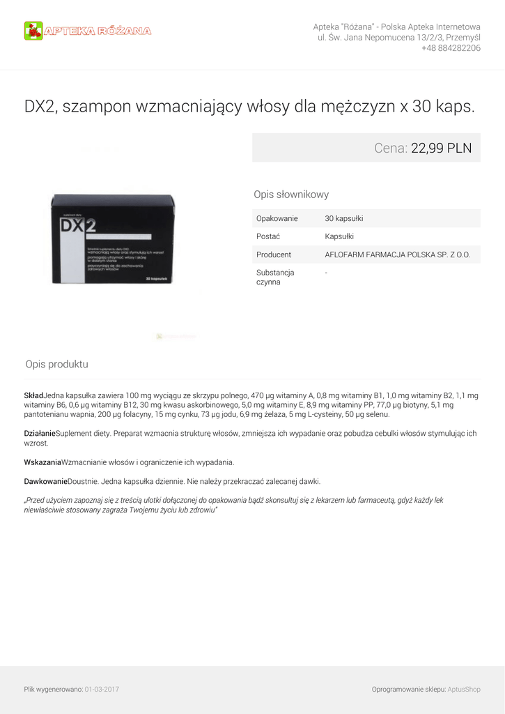 Apteka "Różana" - Polska Apteka Internetowa ul. Św. Jana Nepomucena 13/2/3, Przemyśl +48 884282206 DX2, szampon wzmacniający włosy dla mężczyzn x 30 kaps. Cena: 22,99 PLN Opis słownikowy Opakowanie 30 kapsułki Postać Kapsułki Producent AFLOFARM FARMACJA POLSKA SP. Z O.O. Substancja czynna - Opis produktu SkładJedna kapsułka zawiera 100 mg wyciągu ze skrzypu polnego, 470 µg witaminy A, 0,8 mg witaminy B1, 1,0 mg witaminy B2, 1,1 mg witaminy B6, 0,6 µg witaminy B12, 30 mg kwasu askorbinowego, 5,0 mg witaminy E, 8,9 mg witaminy PP, 77,0 µg biotyny, 5,1 mg pantotenianu wapnia, 200 µg folacyny, 15 mg cynku, 73 µg jodu, 6,9 mg żelaza, 5 mg L-cysteiny, 50 µg selenu. DziałanieSuplement diety. Preparat wzmacnia strukturę włosów, zmniejsza ich wypadanie oraz pobudza cebulki włosów stymulując ich wzrost. WskazaniaWzmacnianie włosów i ograniczenie ich wypadania. DawkowanieDoustnie. Jedna kapsułka dziennie. Nie należy przekraczać zalecanej dawki. „Przed użyciem zapoznaj się z treścią ulotki dołączonej do opakowania bądź skonsultuj się z lekarzem lub farmaceutą, gdyż każdy lek niewłaściwie stosowany zagraża Twojemu życiu lub zdrowiu” Plik wygenerowano: 01-03-2017 Powered by TCPDF (www.tcpdf.org) Oprogramowanie sklepu: AptusShop