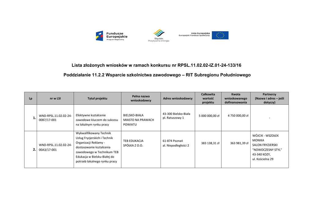 Lista złożonych wniosków w ramach konkursu nr RPSL.11.02.02-IZ.01-24-133/16 Poddziałanie 11.2.2 Wsparcie szkolnictwa zawodowego – RIT Subregionu Południowego Lp 1. nr w LSI Tytuł projektu WND-RPSL.11.02.02-240087/17-001 Efektywne kształcenie zawodowe kluczem do sukcesu na lokalnym rynku pracy WND-RPSL.11.02.02-242. 00A3/17-001 Wykwalifikowany Technik Usług Fryzjerskich i Technik Organizacji Reklamy dostosowanie kształcenia zawodowego w Technikum TEB Edukacja w Bielsku-Białej do potrzeb lokalnego rynku pracy Pełna nazwa wnioskodawcy BIELSKO-BIAŁA MIASTO NA PRAWACH POWIATU TEB EDUKACJA SPÓŁKA Z O.O. Adres wnioskodawcy 43-300 Bielsko-Biała pl. Ratuszowy 1 61-874 Poznań al. Niepodległości 2 Całkowita wartość projektu 5 000 000,00 zł 383 138,31 zł Kwota wnioskowanego dofinansowania 4 750 000,00 zł 363 981,39 zł Partnerzy (Nazwa i adres – jeśli dotyczy) - WÓJCIK - WSZOŁEK MONIKA SALON FRYZJERSKI "NOWOCZESNY STYL" 43-340 KOZY, ul. Kościelna 29