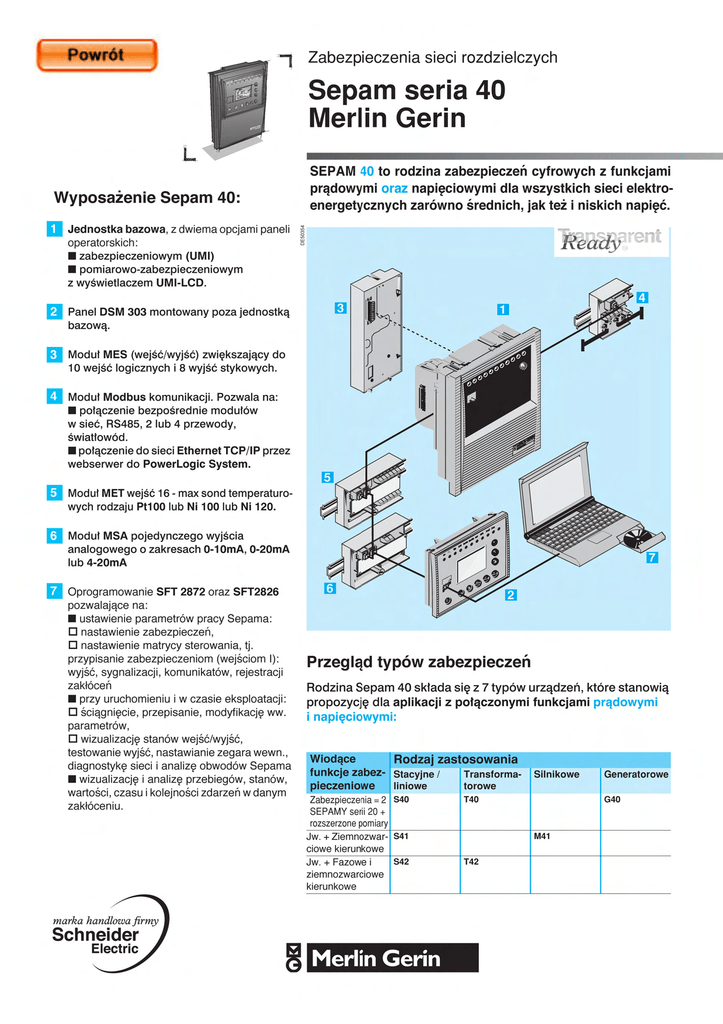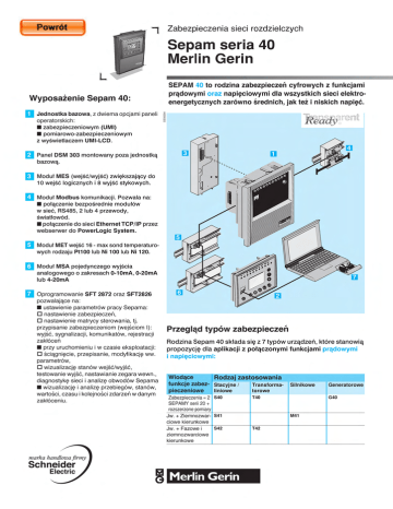 7 typów urządzeń Sepam 40: S40, 41, 42 – zabezpieczenie pól zasilających i odpływowych T40, T42 – zabezpieczenie pól transformatorowych M41 – zabezpieczenie pól silnikowych G40 – zabezpieczenie pól generatorowych kody ANSI S40 S41 S42 T40 T42 M41 G40 50/51 50V/51V 4 4 4 4 4 4 4 1 50N/51N 50G/51G 50BF 46 4 4 4 4 4 4 4 1 2 1 2 1 2 1 2 1 2 1 2 1 2 2 1 2 2 1 Zabezpieczenia Przeciążeniowe i przetężeniowe Przeciążeniowe i przetężeniowe skorygowane napięciem Ziemnozwarciowe Ziemnozwarciowe – obniżony zakres LRW - niezadziałania wyłącznika w polu Asymetryczne DE50352 Kierunkowe nadprądowe If Kierunkowe ziemnozwarciowe Czynnomocowe i zwrotnomocowe Biernomocowe i zwrotnomocowe Cieplne wg modelu cieplnego Podprądowe If Wydłużony rozruch / blokada wirnika Ilości rozruchów Podnapięciowe składowej zgodnej napięcia Podnapięciowe 1 f napięcia resztkowego Podnapięciowe 3 f międzyfazowe i fazowe Nadnapięciowe 3 f międzyfazowe Nadnapięciowe składowej zerowej Nadnapięciowe składowej przeciwnej Nadczęstotliwościowe Podczęstotliwościowe SPZ 4-krotny Cieplne z sond temperaturowych ( 8 lub 16 sond, 2 nastawy na sondę) Cieplne z przekaźników zewn. np. trafo 67 67N/67NC 32P 32Q/40 49 RMS 37 48/51LR/14 66 27D 27R 27/27S 59 59N 47 81H 81L 79 38/49T 2 2 2 1 2 4 2 2 2 1 2 4 2 2 2 1 2 4 6 6 6 2 2 2 2 2 2 2 1 2 4 2 2 2 1 2 4 2 1 1 2 1 1 1 2 1 2 2 2 1 2 4 6 6 6 6 6 6 1 1 2 2 2 2 1 2 4 Pomiary Prądów fazowych, prądu doziemnego - wart. skut. Prądów średn. i maksym. wart. skut. w czasie (np.15min) Napięć międzyfazowych, fazowych, doziemienia Składowej zerowej, zgodnej napięcia i kierunek wirowania Częstotliwości Mocy czynnej P, biernej Q, pozornej S, mocy szczytowej czynnej PM, biernej QM, współczynnika mocy Energii czynnej i biernej (±W*h, ±var*h) z wbudowanych liczników y y y y y y y y y y y y y y y y y y y y y y y y y y y y y y y y y y y y y y y y y y y y y y y y y 6 6 6 6 6 6 6 6 6 6 6 Schemat połączeń Sepam 40 DE50472 Energii czynnej i biernej (±W*h, ±var*h) z zewnętrznych liczników impulsowych Temperatury Diagnostyka odbioru Prądy wyłączeń – tripI1, I2, I3 tripI0 Wielkości towarzyszące wyłączeniu Współczynnik asymetrii (skł. przeciwnej) Przesunięcia fazowe ϕ0, ϕ1, ϕ2, ϕ3 Zapis zakłóceń Stopień nagrzania silnika/transformatora Czas dop. przeciążenia odliczany do wyłączenia przez zab. cieplne Czas obowiązkowego postoju po wyłączeniu przez zab. cieplne Licznik czasu pracy (godz. przy I>0.1Ib) Prąd i czas rozruchu / przeciążenia silnika Czas obowiązkowego postoju lub liczba dopuszczalnych rozruchów silnika y y y y y y y y y y y y y y y y y y y y y y y y y y y y y y y y y y y y y y y y y y y y y y y y y y y y y Diagnostyka wyłącznika i przekładników Skumulowany prąd wyłączeń (ΣI2*t) Kontrola ciągłości obwodu otwierającego Liczba przestawień, czas wyłączania, czas zbrojenia Kontrola obwodów przekładników prądowych i napięciowych Sterowanie i nadzór Rozmieszczenie elementów na tylnej ścianie zabezpieczenia Sepam 40: 1 Jednostka bazowa A Złącze bazowe (zasilanie, wyjścia, przekładnik składowej zerowej) B Złącze z przekładników prądowych C Port komunikacyjny D Gniazdo przyłączeniowe zewnętrznych modułów E Złącze z przekładników napięciowych 2 Moduł MES wejścia / wyjścia ze złączami K, L, M. Wybór rodzajów wyzwalaczy wyłącznika/ stycznika breaker / contactor control Podtrzymanie wyjść do potwierdzenia Selektywność logiczna (patent MERLIN GERIN) Zdalne przełączanie grup zabezpieczeń Edytor równań logicznych y y y y y y y 6 6 6 6 6 6 6 6 6 6 6 6 6 6 y y y y y y y 94/69 y y y y y y y 86 68 y y y y y y y 6 6 6 6 6 6 6 y y y y y y y y y y y y y y kody ANSI Komunikacja w protokole MODBUS Zdalny odczyt pomiarów Zdalna sygnalizacja oraz odczyt czasu zdarzeń Zdalne polecenia manewrowe Zdalne nastawy zabezpieczeń Przesył zapisów z analizatora zakłóceń 6 6 6 6 6 6 6 6 6 6 6 6 6 6 6 6 6 6 6 6 6 6 6 6 6 6 6 6 6 6 6 6 6 6 6 y y y y y y y 6 6 6 6 6 6 6 Auto-diagnostyka zabezpieczenia Przekaźnik autokontroli WDG Test przekaźników wyjściowych Liczby – ilość nastawialnych charakterystyk / cykli, y - funkcja zawsze dostępna w jednostce bazowej Sepama 6 - opcja osiągalna po podłączeniu modułu (lub sygnału), lub/i po parametryzacji Sapama. Schneider Electric Polska Sp. z o.o. ul. ¸ubinowa 4a, 03-878 Warszawa Centrum Obs∏ugi Klienta: (0 prefiks 22) 511 84 64; 0 801 171 500, Poniewa˝ normy, dane techniczne oraz sposób funkcjonowania i u˝ytkowania naszych urzàdzeƒ podlegajà ciàg∏ym modyfikacjom, dane zawarte w niniejszej publikacji s∏u˝à jedynie celom informacyjnym i nie mogà byç podstawà roszczeƒ prawnych. http://www.schneider-electric.pl KATKK10012 sierpieƒ 2005