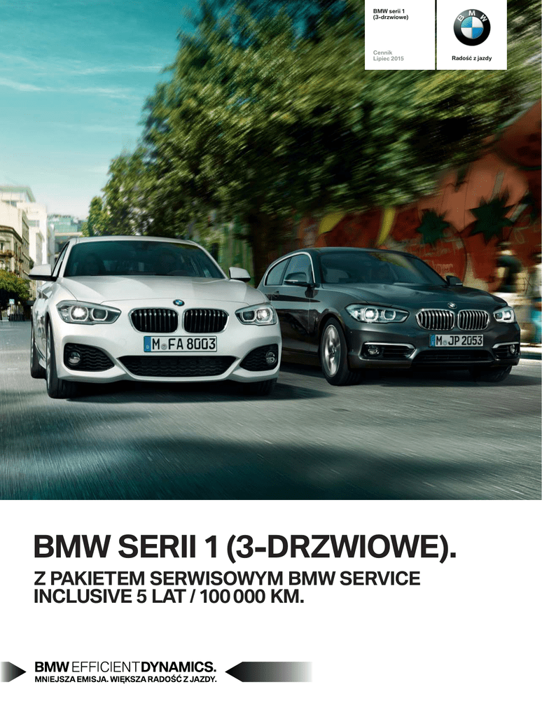 BMW serii (-drzwiowe) Cennik Lipiec Radość z jazdy BMW SERII (-DRZWIOWE). Z PAKIETEM SERWISOWYM BMW SERVICE INCLUSIVE LAT / KM. SPIS TREŚCI Ceny BMW serii 1 . . . . . . . . . . . . . . . . . . . . . . . . . . . . . . . . . . . . . . . . . . . 3 Wyposażenie standardowe . . . . . . . . . . . . . . . . . . . . . . . . . . . . . . . . . . . 6 Wersje wyposażenia . . . . . . . . . . . . . . . . . . . . . . . . . . . . . . . . . . . . . . . . . 9 Wyposażenie dodatkowe . . . . . . . . . . . . . . . . . . . . . . . . . . . . . . . . . . . 11 Bezpieczeństwo Lakier Stylistyka zewnętrzna Pakiety wyposażenia dodatkowego Koła / opony Tapicerki Stylistyka wnętrza Zawieszenie / układ jezdny Skrzynia biegów Systemy asystujące Światła i oświetlenie 11 11 11 12 14 15 16 17 17 18 19 Fotele / komfort siedzeń Kierownice Kontrola klimatu Funkcjonalne wyposażenie zewnętrzne i wewnętrzne Radio / nawigacja Komunikacja oraz informacja Systemy HiFi oraz zestawy rozrywki Serwis Kontrola wewnętrzna 20 20 20 21 22 23 24 24 24 BMW Service Inclusive . . . . . . . . . . . . . . . . . . . . . . . . . . . . . . . . . . . . . . 25 BMW Financial Services . . . . . . . . . . . . . . . . . . . . . . . . . . . . . . . . . . . . 27 2 wyposażenie standardowe wyposażenie dodatkowe za dopłatą CENY BMW SERII 1 Model Układ skrzyni biegów Silnik Układ /cylindry Pojemność Moc cm3 kW (KM) Zużycie paliwa wg normy ECE cykl mieszany l / 100km Emisja CO2 g/km Cena netto (bez VAT) Cena brutto w PLN w PLN* MODEL PODSTAWOWY 116i 6-man R3 / 1499 80 (109) 5,3 123 73 821 90 800 118i 6-man R3 / 1499 100 (136) 5,0 116 76 992 94 700 120i 6-man R4 / 1598 130 (177) 5,8 136 88 374 108 700 125i 6-man R4 / 1997 160 (218) 6,6 154 102 602 126 200 M135i 6-man R6 / 2979 240 (326) 8,0 188 150 000 184 500 M135i xDrive 8-aut R6 / 2979 240 (326) 7,8 182 165 691 203 800 114d 6-man R3 / 1496 70 (95) 3,6 95 80 325 98 800 116d EfficientDynamics Edition 6-man R3 / 1496 85 (116) 3,4 89 84 146 103 500 116d 6-man R3 / 1496 85 (116) 4,0 104 84 146 103 500 118d 6-man R4 / 1995 110 (150) 4,1 109 89 187 109 700 118d xDrive 6-man R4 / 1995 110 (150) 4,3 113 97 236 119 600 120d 6-man R4 / 1995 140 (190) 4,1 108 97 073 119 400 120d xDrive 8-aut R4 / 1995 140 (190) 4,3 113 112 033 137 800 125d 8-aut R4 / 1995 165 (224) 4,3 114 118 130 145 300 Data wydania cennika: 01.07.2015. * Powyższe ceny zawierają pakiet serwisowy BMW Service Inclusive 5 lat / 100 000 km pokrywający koszty serwisowania samochodu oraz przeglądów, wliczając w to oryginalne części BMW, olej oraz robociznę. Pakiet obejmuje następujące czynności: wymiana oleju (bez uzupełniania), serwis/wymiana filtra powietrza, filtra przeciwpyłkowego, świec zapłonowych, płynu hamulcowego, kontrola pojazdu i przegląd standardowy zgodnie z książką serwisową. Więciej informacji na temat BMW Service Inclusive oraz dodatkowych pakietów znajdą Państwo u Dealera BMW. W przypadku rezygnacji z pakietu cena samochodu będzie niższa o 1 359 PLN brutto dla modelu 116i oraz 116d EfficientDynamics i 116d, 1 328 PLN brutto dla modeli 118i, 120i, 125i, 114d, 118d, 118d xDrive, 120d, 120d xDrive, 125d i 2 362 PLN brutto dla modeli z silnikiem 6-cylindrowym. Podane ceny są zalecanymi cenami detalicznymi, zawierającymi podatek VAT oraz podatek akcyzowy. Zalecane ceny detaliczne dotyczące wyposażenia dodatkowego są ważne jedynie, jeśli wyposażenie to zostanie zamówione jednocześnie z danym modelem pojazdu. Podane ceny samochodów obowiązują dla modeli w kolorach podstawowych, a lakiery metalizowane są dostępne za dopłatą. Powyższe ceny mogą ulec zmianom bez uprzedzenia w zależności od zmiany cen wprowadzonych przez producenta, jak również zmian w podatkach, opłatach i przepisach celnych. Przedstawione informacje są aktualne w chwili ukazania się niniejszej publikacji. BMW Vertriebs GmbH zastrzega sobie prawo do zmian w ofercie w każdej chwili i to zarówno w zakresie oferowanych modeli jak i ich budowy oraz wyposażenia. Niniejszy cennik nie stanowi oferty w rozumieniu prawa i publikowany jest jedynie dla celów informacyjnych bez żadnej odpowiedzialności. Informacji dotyczących dostępności prezentowanych modeli i wyposażenia, jak również aktualnych cen detalicznych prosimy zasięgnąć u Dealera BMW. 3 CENY BMW SERII 1 Model Układ skrzyni biegów Silnik Układ /cylindry Pojemność Moc cm3 kW (KM) Zużycie paliwa wg normy ECE cykl mieszany l / 100km Emisja CO2 g/km Cena netto (bez VAT) Cena brutto w PLN w PLN* MODEL ADVANTAGE 116i 6-man R3 / 1499 80 (109) 5,3 123 78 293 96 300 118i 6-man R3 / 1499 100 (136) 5,0 116 81 463 100 200 120i 6-man R4 / 1598 130 (177) 5,8 136 92 846 114 200 125i 6-man R4 / 1997 160 (218) 6,6 154 106 504 131 000 114d 6-man R3 / 1496 70 (95) 3,6 95 84 797 104 300 116d EfficientDynamics Edition 6-man R3 / 1496 85 (116) 3,4 89 88 618 109 000 116d 6-man R3 / 1496 85 (116) 4,0 104 88 618 109 000 118d 6-man R4 / 1995 110 (150) 4,1 109 93 659 115 200 118d xDrive 6-man R4 / 1995 110 (150) 4,3 113 101 707 125 100 120d 6-man R4 / 1995 140 (190) 4,1 108 101 545 124 900 120d xDrive 8-aut R4 / 1995 140 (190) 4,3 113 116 504 143 300 125d 8-aut R4 / 1995 165 (224) 4,3 114 122 114 150 200 MODEL SPORT LINE 116i 6-man R3 / 1499 80 (109) 5,0 116 83 821 103 100 118i 6-man R3 / 1499 100 (136) 5,0 116 86 992 107 000 120i 6-man R4 / 1598 130 (177) 5,7 132 98 374 121 000 125i 6-man R4 / 1997 160 (218) 6,7 157 110 000 135 300 114d 6-man R3 / 1496 70 (95) 3,6 95 90 325 111 100 116d EfficientDynamics Edition 6-man R3 / 1496 85 (116) 3,4 89 94 146 115 800 116d 6-man R3 / 1496 85 (116) 3,7 97 94 146 115 800 118d 6-man R4 / 1995 110 (150) 4,0 104 99 187 122 000 118d xDrive 6-man R4 / 1995 110 (150) 4,3 113 107 236 131 900 120d 6-man R4 / 1995 140 (190) 4,1 108 107 073 131 700 120d xDrive 8-aut R4 / 1995 140 (190) 4,3 113 122 033 150 100 125d 8-aut R4 / 1995 165 (224) 4,6 121 125 610 154 500 Data wydania cennika: 01.07.2015. * Powyższe ceny zawierają pakiet