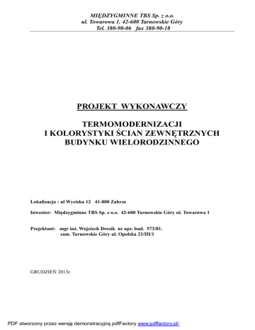 MIĘDZYGMINNE TBS Sp. z o.o. ul. Towarowa 1. 42-600 Tarnowskie Góry Tel. 380-90-06 fax 380-90-18 PROJEKT WYKONAWCZY TERMOMODERNIZACJI I KOLORYSTYKI ŚCIAN ZEWNĘTRZNYCH BUDYNKU WIELORODZINNEGO Lokalizacja : ul Wyciska 12 41-800 Zabrze Inwestor: Międzygminne TBS Sp. z o.o. 42-600 Tarnowskie Góry ul. Towarowa 1 Projektant: mgr inż. Wojciech Drosik nr upr. bud. 573/81. zam. Tarnowskie Góry ul. Opolska 23/III/1 GRUDZIEŃ 2013r. PDF stworzony przez wersję demonstracyjną pdfFactory www.pdffactory.pl/ B. Zawartość opracowania Strony tytułowe A Metryka projektu B Zawartość opracowania C Wykaz dokumentów Kopia odpisu uprawnień Kopia wpisu do Śląskiej Okręgowej Izby Inżynierów Oświadczenie o posiadanym prawie do dysponowania nieruchomością na cele budowlane Oświadczenie projektanta 2 PDF stworzony przez wersję demonstracyjną pdfFactory www.pdffactory.pl/ Część opisowa1. 1. Podstawa opracowania 2. Dane ogólne 3. Warunki lokalizacyjne 4. Zakres opracowania 5. Dane techniczne 6. Opis stanu istniejącego 7. Dokumentacja zdjęciowa 8 Usprawnienia termomodernizacyjne. 9 Kolorystyka elewacji 10. Technologia wykonania cokołu 11. Dodatkowe roboty remontowe 9. Uwagi końcowe Informacja dotycząca bezpieczeństwa i ochrony zdrowia. Część rysunkowa 1. Sytuacja 2. inwentaryzacja – rzut parteru 3. inwentaryzacja – rzut kondygnacji powtarzalnej 4. inwentaryzacja – przekrój A-A 5. inwentaryzacja - elewacja frontowa 6. inwentaryzacja – elewacja tylna 7. inwentaryzacja elewacji – elewacje boczne 8. projekt – rzut parteru 9. projekt – rzut kondygnacji powtarzalnej 10.projekt – przekrój A-A 11.przekrój przez kl. schodową 12.projekt – elewacja frontowa 13.projekt – elewacje boczne 3 PDF stworzony przez wersję demonstracyjną pdfFactory www.pdffactory.pl/ 14.projekt – elewacja tylna 15.projekt - zestawienie kolorów 16. Detal obróbki parapetu 17. Detal ocieplenia naroża wypukłego 18. Detal dolnej krawędzi docieplenia 19. Detal ocieplenia naroża wklęsłego 20. Detal ocieplenia ościeża 21. Detal przerwy dylatacyjnej 22. Detal ocieplenia attyki 23. Detal ocieplenia ściany przy okapie 4 PDF stworzony przez wersję demonstracyjną pdfFactory www.pdffactory.pl/ 0PIS TECHNICZNY do termomomodernizacji budynku 1. Podstawa opracowania. 1.1 Inwentaryzacja budynku 1.2 Projekt techniczny architektury segment DOMINO 68/SG/V-434 1.3 Audyt energetyczny budynku przy ul.Wyciska 12 1.4 Instrukcja ITB 334/2002 Bezspoinowe systemy dociepleń ścian zewnętrznych 1.5 Wytyczne wykonawstwa, oceny i odbioru robót elewacyjnych z zastosowaniem zewnętrznych zespolonych systemów ocieplania ścian 1.6 Instrukcja BOLIX nr IB/01/2001 1.7 Systemy ocieplań Caparol. Warunki techniczne wykonawstwa 1.8 Obowiązujące normy i przepisy. 1. Dane ogólne. Budynek przy ul. Wyciska 12 wybudowany został w 1977r. Budynek pięciokondygnacyjny, czterosegmentowy całkowicie podpiwniczony, zrealizowany w technologii wielkopłytowej Domino 68. W latach osiemdziesiątych ocieplony wełną mineralną i obłożony płytami acekol na ruszcie drewnianym. 3. Warunki lokalizacyjne. Obiekt znajduje się przy ul. Wyciska 12 w Zabrzu na działce 4026/325 4. Zakres opracowania. Celem opracowania jest termomodernizacja budynków przy ul. Wyciska 12 w Zabrzu. Zakres prac obejmuje ocieplenie ścian zewnętrznych, ocieplenie stropu nad piwnicą, ocieplenie stropu nad ostatnią kondygnacją, wymianę pozostałych okien drewnianych na okna PCV z nawiewnikami higrosterowanymi w mieszkaniach, częściowe zamurowanie okien na klatce schodowej i wymianę pozostałych stalowych z pojedynczą szybą na okna PCV oraz kolorystykę ścian zewnętrznych budynku. 5. Dane techniczne Kubatura części ogrzewanej budynku Powierzchnia netto Pow. użytkowa części mieszkalnej Pow. użytkowa pomieszczeń niemieszkalnych - 7.252,16 m³ - 2.987,92 m2 - 2.746,00 m2 - 241,92 m2 6. Opis stanu istniejącego Budynek zrealizowany w technologii wielkopłytowej Domino 68. W latach osiemdziesiątych ocieplony wełną mineralną gr. 3 cm i obłożony płytami acekol na ruszcie drewnianym. Ściany piwnic betonowe monolityczne. Strop nad piwnicami DZ. Ściany nośne części nadziemnej prefabrykowane wielkopłytowe gr. 10cm. w segmentach skrajnych osłonięte ścianą z bloczków PGS gr. 24. cm. Ściany osłonowe (podłużne) z bloczków PGS. Stropy nad parterem i piętrami prefabrykowane żelbetowe. Schody do piwnicy żelbetowe monolityczne, schody w części nadziemnej prefabrykowane. Stropodach z płyt prefabrykowanych dwudzielny. 6.1 Ściany piwnic betonowe U = 3,23 W/m2 K 5 PDF stworzony przez wersję demonstracyjną pdfFactory www.pdffactory.pl/ Ściany zewnętrzne osłonowe z bloczków PGS odmiany 07 ocieplone wełną mineralną gr. 3cm. U = 0,67 W/m2 K . Ściany zewnętrzne szczytowe żelbetowe gr. 10m ocieplone bloczkami PGS I wełną mineralną U= 0,65 W/ m2 K. 6.3. Strop nad piwnicą U = 1,04 W/m2 K 6.4 Strop nad ostatnią kondygnacją U= 2,70 W/m2K 6.6 Stolarka okienna w mieszkaniach PCV U= 1.32W/m2K drewniana U = 2,94 W/m2 K Okna klatki schodowej metalowe U= 5,28 W/m2 K 6.7 Stolarka drzwiowa. Drzwi wewnętrzne drewniane. Drzwi wejściowe do budynku metalowe 6.8 Wentylacja grawitacyjna 6.2 7. Dokumentacja zdjęciowa 8. Usprawnienia termomodernizacyjne. Przed rozpoczęciem prac ocieplających należy zdemontować płyty acekol przez firmę posiadającą uprawnienia do demontażu i utylizacji azbestu. Wymagania dotyczące robót związanych z rozbiórką wyrobów zawierających azbest 1. Wykonawca zobowiązany jest zabezpieczyć teren wokół rozbieranego obiektu przed dostępem niepowołanych osób. 2. Przed przystąpieniem do prac należy z inspektorem nadzoru uzgodnić komunikację pracowników oraz miejsce składowania zdemontowanych materiałów przed wywiezieniem, gruzu i azbestu. 3. Całość robót rozbiórkowych należy prowadzić zgodnie ze sztuką budowlaną, obowiązującymi przepisami i normami oraz zawartą umową. 4.