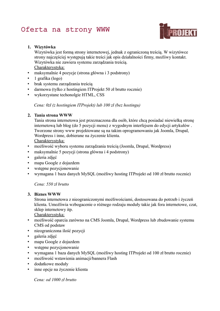 Oferta na strony WWW 1. Wizytówka Wizytówka jest formą strony internetowej, jednak z ograniczoną treścią. W wizytówce strony najczęściej występują takie treści jak opis działalności firmy, możliwy kontakt. Wizytówka nie zawiera systemu zarządzania treścią. Charakterystyka: • maksymalnie 4 pozycje (strona główna i 3 podstrony) • 1 grafika (logo) • brak systemu zarządzania treścią • darmowa (tylko z hostingiem ITProjekt 50 zł brutto rocznie) • wykorzystane techonolgie HTML, CSS Cena: 0zł (z hostingiem ITProjekt) lub 100 zł (bez hostingu) 2. Tania strona WWW Tania strona internetowa jest przeznaczona dla osób, które chcą posiadać niewielką stronę internetową lub blog (do 5 pozycji menu) z wygodnym interfejsem do edycji artykułów . Tworzone strony www projektowane są na takim oprogramowaniu jak Joomla, Drupal, Wordpress i inne, dobierane na życzenie klienta. Charakterystyka: • możliwość wyboru systemu zarządzania treścią (Joomla, Drupal, Wordpress) • maksymalnie 5 pozycji (strona główna i 4 podstrony) • galeria zdjęć • mapa Google z dojazdem • wstępne pozycjonowanie • wymagana 1 baza danych MySQL (możliwy hosting ITProjekt od 100 zł brutto rocznie) Cena: 550 zł brutto 3. Biznes WWW Strona internetowa z nieograniczonymi możliwościami, dostosowana do potrzeb i życzeń klienta. Umożliwia wzbogacenie o różnego rodzaju moduły takie jak fora internetowe, czat, sklep internetowy itp. Charakterystyka: • możliwość oparcia zarówno na CMS Joomla, Drupal, Wordpress lub zbudowanie systemu CMS od podstaw • nieograniczona ilość pozycji • galeria zdjęć • mapa Google z dojazdem • wstępne pozycjonowanie • wymagana 1 baza danych MySQL (możliwy hosting ITProjekt od 100 zł brutto rocznie) • możliwość wstawienia animacji/bannera Flash • dodatkowe moduły • inne opcje na życzenie klienta Cena: od 1000 zł brutto