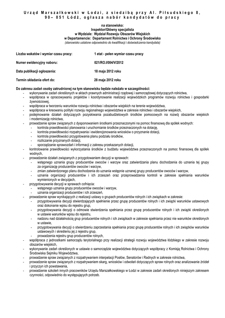 Urząd Marszałkowski w Łodzi, z siedzibą przy Al. Piłsudskiego 8, 90– 051 Łódź, ogłasza nabór kandydatów do pracy na stanowisko: Inspektor/Główny specjalista w Wydziale: Wydział Rozwoju Obszarów Wiejskich w Departamencie: Departament Rolnictwa i Ochrony Środowiska (stanowisko ustalone odpowiednio do kwalifikacji i doświadczenia kandydata) Liczba wakatów i wymiar czasu pracy: 1 etat - pełen wymiar czasu pracy Numer ewidencyjny naboru: 021/RO.I/004/V/2012 Data publikacji ogłoszenia: 18 maja 2012 roku Termin składania ofert do: 28 maja 2012 roku Do zakresu zadań osoby zatrudnionej na tym stanowisku będzie naleŜało w szczególności: - wykonywanie zadań określonych w aktach prawnych administracji rządowej i samorządowej dotyczących rolnictwa, - współpraca w opracowywaniu projektów i koordynowanie realizacji wojewódzkich programów rozwoju rolnictwa i gospodarki Ŝywnościowej, - współpraca w tworzeniu warunków rozwoju rolnictwa i obszarów wiejskich na terenie województwa, - współpraca w kreowaniu polityki rozwoju regionalnego województwa w zakresie rolnictwa i obszarów wiejskich, - podejmowanie działań dotyczących pozyskiwania pozabudŜetowych środków pomocowych na rozwój obszarów wiejskich i modernizację rolnictwa, - prowadzenie spraw związanych z dysponowaniem środkami przeznaczonymi na pomoc finansową dla spółek wodnych: - kontrola prawidłowości planowania i uruchomianie środków przeznaczonych na dotację, - kontrola prawidłowości rozpatrywania i ewidencjonowania wniosków o przyznanie dotacji, - kontrola prawidłowości przygotowania planu podziału środków, - rozliczanie przyznanych dotacji, - sporządzanie sprawozdań i informacji z zakresu przekazanych dotacji, - kontrolowanie prawidłowości wykorzystania środków z budŜetu województwa przeznaczonych na pomoc finansową dla spółek wodnych, - prowadzenie działań związanych z przygotowaniem decyzji w sprawach: - wstępnego uznania grupy producentów owoców i warzyw oraz zatwierdzania planu dochodzenia do uznania tej grupy za organizację producentów owoców i warzyw, - zmian zatwierdzonego planu dochodzenia do uznania wstępnie uznanej grupy producentów owoców i warzyw, - uznania organizacji producentów i ich zrzeszeń oraz przeprowadzenia kontroli w zakresie spełniania warunków wymienionych w decyzjach, - przygotowywanie decyzji w sprawach cofnięcia: - wstępnego uznania grupy producentów owoców i warzyw, - uznania organizacji producentów i ich zrzeszeń, - prowadzenie spraw wynikających z realizacji ustawy o grupach producentów rolnych i ich związkach w zakresie: - przygotowywania decyzji stwierdzających spełnienie przez grupę producentów rolnych i ich związki warunków ustawowych oraz dokonanie wpisu do rejestru grup, - przygotowywania decyzji o odmowie stwierdzenia spełniania przez grupę producentów rolnych i ich związki określonych w ustawie warunków wpisu do rejestru, - nadzoru nad działalnością grup producentów rolnych i ich związkach w zakresie spełniania przez nie warunków określonych w ustawie, - przygotowywania decyzji o stwierdzeniu zaprzestania spełniania przez grupę producentów rolnych i ich związków warunków ustawowych i skreśleniu jej z rejestru grup, - prowadzenia rejestru grup producentów rolnych, - współpraca z jednostkami samorządu terytorialnego przy realizacji strategii rozwoju województwa łódzkiego w zakresie rozwoju obszarów wiejskich, - wykonywanie zadań określonych w ustawie o samorządzie województwa dotyczących współpracy z Komisją Rolnictwa i Ochrony Środowiska Sejmiku Województwa, - prowadzenie spraw związanych z rozpatrywaniem interpelacji Posłów, Senatorów i Radnych w zakresie rolnictwa, - prowadzenie spraw związanych z rozpatrywaniem skarg, wniosków i odwołań dotyczących spraw rolnych oraz analizowanie źródeł i przyczyn ich powstawania, - prowadzenie szkoleń innych pracowników Urzędu Marszałkowskiego w Łodzi w zakresie zadań określonych niniejszym zakresem czynności, odpowiednio do występujących potrzeb. Wymagania niezbędne (konieczne): - posiadanie obywatelstwa polskiego lub posiadanie obywatelstwa innego niŜ Polska państwa Unii Europejskiej lub innego państwa, którego obywatelom, na podstawie umów międzynarodowych lub przepisów prawa wspólnotowego, przysługuje prawo do podjęcia zatrudnienia na terytorium Rzeczypospolitej Polskiej, - posiadanie pełnej zdolności do czynności prawnych oraz korzystanie z pełni praw publicznych, - niebycie skazanym prawomocnym wyrokiem sądu za umyślne przestępstwo ścigane z oskarŜenia publicznego lub umyślne przestępstwo skarbowe, - posiadanie nieposzlakowanej opinii, - wyraŜenie zgody na przetwarzanie danych osobowych zawartych w dokumentach składanych w związku z naborem, dla potrzeb niezbędnych dla jego realizacji i dokumentacji, zgodnie z ustawą z dnia 29 sierpnia 1997 roku o ochronie danych osobowych (Dz. U. z 2002 r. Nr 101, poz. 926 ze zm.), - oświadczenie o wyraŜeniu zgody na poddanie się procedurze sprawdzającej przewidzianej przy dopuszczeniu do informacji niejawnych, o której mowa w ustawie z dnia 5 sierpnia 2010 roku o ochronie informacji niejawnych (Dz. U. z 2010 r. Nr 182, poz. 1228) - znajomość języka polskiego, - posiadanie wykształcenia wyŜszego magisterskiego z zakresu zespołu kierunków studiów rolniczych, leśnych i weterynaryjnych, - posiadanie pracowniczego staŜu pracy: w przypadku stanowiska inspektora wymagany jest co najmniej 3-letni staŜ pracy, w przypadku stanowiska głównego specjalisty wymagany jest co najmniej 4-letni staŜ pracy, - posiadanie wiedzy z zakresu ustaw: o samorządzie województwa, o finansach publicznych, Prawo zamówień publicznych, o ochronie danych osobowych, Kodeks postępowania administracyjnego, o organizacji rynków owoców i warzyw, rynku chmielu, rynku tytoniu oraz suszu paszowego oraz rynków lnu i konopi uprawianych na włókn