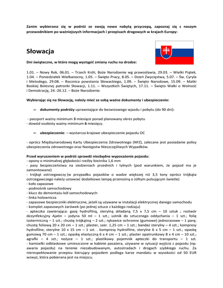 Zanim wybierzesz się w podróż ze swoją nowo nabytą przyczepą, zapoznaj się z naszym przewodnikiem po ważniejszych informacjach i przepisach drogowych w krajach Europy: Słowacja Dni świąteczne, w które mogą wystąpić zmiany ruchu na drodze: 1.01. – Nowy Rok, 06.01. – Trzech Króli, Boże Narodzenie wg prawosławia, 29.03. – Wielki Piątek, 1.04. – Poniedziałek Wielkanocny, 1.05. – Święto Pracy, 8.05. – Dzień Zwycięstwa, 5.07. – Św. Cyryla i Metodego, 29.08. – Rocznica powstania Słowackiego, 1.09. – Święto Narodowe, 15.09. – Matki Boskiej Bolesnej patronki Słowacji, 1.11. – Wszystkich Świętych, 17.11. – Święto Walki o Wolność i Demokrację, 24.-26.12. – Boże Narodzenie. Wybierając się na Słowację, należy mieć ze sobą ważne dokumenty i ubezpieczenie: • dokumenty podróży uprawniające do bezwizowego wjazdu i pobytu (do 90 dni): - paszport ważny minimum 3 miesiące ponad planowany okres pobytu - dowód osobisty ważny minimum 6 miesięcy. • ubezpieczenie: – wystarcza krajowe ubezpieczenie pojazdu OC - oprócz Międzynarodowej Karty Ubezpieczenia Zdrowotnego (NFZ), zalecane jest posiadanie polisy ubezpieczenia zdrowotnego oraz Następstw Nieszczęśliwych Wypadków. Przed wyruszeniem w podróż sprawdź niezbędne wyposażenie pojazdu: - opony o minimalnej głębokości rzeźby bieżnika 1,6 mm - pasy bezpieczeństwa na siedzeniach przednich i tylnych (pod warunkiem, że pojazd ma je zamontowane) - trójkąt ostrzegawczy (w przypadku pojazdów o wadze większej niż 3,5 tony oprócz trójkąta ostrzegawczego należy ustawiać dodatkowo lampę przenośną o żółtym pulsującym świetle) - koło zapasowe - podnośnik samochodowy - klucz do demontażu kół samochodowych - linka holownicza - zapasowe bezpieczniki elektryczne, jeżeli są używane w instalacji elektrycznej danego samochodu - komplet zapasowych żarówek (po jednej sztuce z każdego rodzaju) - apteczka zawierająca: gazę hydrofilną, sterylną składaną 7,5 x 7,5 cm – 10 sztuk ; roztwór dezynfekcyjny Ajatin – jodyna 50 ml – 1 szt.; ustnik do sztucznego oddychania – 1 szt.; folię izotermiczną – 1 szt.; chustę trójkątną – 2 szt.; rękawice ochronne (gumowe) jednorazowe – 1 parę; chustę foliową 20 x 20 cm – 1 szt.; plaster, szer. 1,25 cm – 1 szt.; bandaż sterylny – 4 szt.; kompresy hydrofilne, sterylne 10 x 15 cm – 1 szt. . kompresy hydrofilne, sterylne 6 x 5 cm – 1 szt.; opaskę gumową 70 cm – 1 szt.; opaskę elastyczną 6 x 4 cm – 1 szt.; plaster opatrunkowy 8 x 4 cm – 10 szt.; agrafki – 4 szt.; nożyce – 1 szt.; plastikowy pojemnik apteczki do transportu – 1 szt. - kamizelki odblaskowe umieszczone w kabinie pasażera, używane w sytuacji wyjścia z pojazdu (np. awaria pojazdu) na terenie niezabudowanym, autostradach i drogach szybkiego ruchu. Za nierespektowanie przepisu kierujący pojazdem podlega karze mandatu w wysokości od 50 EUR wzwyż, która pobierana jest na miejscu. Obowiązek używania świateł mijania dotyczy: kierującego pojazdem, który ma obowiązek włączenia świateł mijania zawsze od świtu do zmierzchu w warunkach złej widoczności. W sytuacji, gdy widoczność jest ograniczona do 50 m, można używać również świateł przeciwmgielnych. Zarówno we wszystkich tunelach, jak i poza terenem zabudowanym nakazuje się używania świateł mijania przez cały rok przez 24/h, jednak bez włączonych świateł postojowych. Zespoły jezdne powinny mieć następujące wymiary: - wysokość zewnętrzna – 4,0 m - szerokość zewnętrzna – 2,5 m - długość zewnętrzna zespołu pojazdów (samochód + przyczepa) – 18,0 m. Uprawnienia do prowadzenia pojazdu mają tylko osoby pełnoletnie, które ukończyły 18 lat. Posiadający prawo jazdy kategorii B mogą prowadzić pojazd lub zespoły pojazdów o DMC do 3,5 t (w tym z przyczepą campingową do 750 kg). Zasady przewozu dzieci: Dzieci poniżej 12. roku życia oraz osoby o wzroście poniżej 150 cm (bez względu na wiek) powinny być przewożone w foteliku lub na specjalnie do nich dostosowanym siedzisku na tylnym siedzeniu. W trakcie jazdy obowiązuje całkowity zakaz prowadzenia rozmów przez telefon komórkowy bez przystosowanego w tym celu sprzętu głośnomówiącego oraz zakaz używania urządzeń antyradarowych. Na drodze należy poruszać się zgodnie z tabelą ograniczenia prędkości, km/h: - specjalne ograniczenia prędkości – minimalna prędkość na autostradzie – 50 km/h, - holowanie pojazdu przez inny pojazd – 60 km/h. autostrady autostrady i drogi i drogi pozostałe drogi pozostałe drogi ekspresowe ekspresowe poza terenem na terenie poza terenem w terenie niezabudowanym zabudowanym zabudowanym zabudowanym pojazd osobowy do 3,5 t 130 90 90 50 pojazd osobowy do 3,5 t z przyczepą 90 90 90 50 autokar 100 90 90 50 autokar z przyczepą 90 90 90 50 samochód ciężarowy powyżej 3,5 t 90 80 80 50 Obowiązuje również zakaz ruchu pojazdów handlowych powyżej 7,5 t (z wyjątkiem przewozu produktów łatwo psujących się i żywych zwierząt) oraz samochodów ciężarowych przyczepami powyżej 3,5 t z na autostradach i drogach szybkiego ruchu w okresach: - piątki i dni poprzedzające święta od godz. 15:00 do 20:00 - soboty i pierwszy dzień świąt od godz. 7:00 do 11:00 - niedziele i dni świąteczne od godz. 15:00 do 21:00 Najważniejsze drogowe przejścia graniczne, czynne całodobowo to: z Polską (zach.-wsch.) z Czechami: Skalite – Zwardoń-Myto(do 3,5 t) Oravska Polhora – Korbielów(do 3,5 t) Brodske – Breclav Trstena - Chyżne Horne Srni – Brumov-Bylnice Sucha Hora - Chochołów(do 3,5 t) Cerveny Kamen – Nedasova Lhota Lysa n/Dunajcom - Niedzica(r. osobowy) Holic – Hodonin Javorina - Łysa Polana Lysa nad Makytou – Strelna Mnisek n/Popradom - Piwniczna(r. osobowy) Sudomerice – Skalica Becherov – Konieczna (r. osobowy) Makov – Velke Karlovice Vysny Komarnik – Barwinek Makov – Bila-Bumbulka z