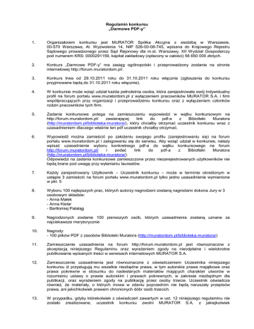 Regulamin konkursu „Darmowe PDF-y” 1. Organizatorem konkursu jest MURATOR Spółka Akcyjna z siedzibą w Warszawie, 00-570 Warszawa, Al. Wyzwolenia 14, NIP 526-00-08-745, wpisana do Krajowego Rejestru Sądowego prowadzonego przez Sąd Rejonowy dla m.st. Warszawy, XII Wydział Gospodarczy pod numerem KRS: 0000291159, kapitał zakładowy (opłacony w całości) 56 650 000 złotych. 2. Konkurs „Darmowe PDF-y” ma zasięg ogólnopolski i przeprowadzony zostanie na stronie internetowej http://forum.muratordom.pl/. 3. Konkurs trwa od 29.10.2011 roku do 31.10.2011 roku włącznie (zgłoszenia do konkursu przyjmowane będą do 31.10.2011 roku włącznie). 4. W konkursie może wziąć udział każda pełnoletnia osoba, która zarejestrowała swój indywidualny profil na forum portalu www.muratordom.pl z wyłączeniem pracowników MURATOR S.A. i firm współpracujących przy organizacji i przeprowadzeniu konkursu oraz z wyłączeniem członków rodzin pracowników tych firm. 5. Zadanie konkursowe polega na zamieszczeniu wypowiedzi w wątku konkursowym na http://forum.muratordom.pl/ zawierającej link do pdf-a z Bibiolteki Muratora (http://muratordom.pl/biblioteka-muratora/), który chciałby otrzymać uczestnik konkursu wraz z uzasadnieniem dlaczego właśnie ten pdf uczestnik chciałby otrzymać. 6. Wypowiedź można zamieścić po założeniu swojego profilu (zarejestrowaniu się) na forum portalu www.muratordom.pl i zalogowaniu się do serwisu. Aby wziąć udział w konkursie, należy wpisać uzasadnienie wyboru konkretnego pdf-a do wątku konkursowego na forum http://forum.muratordom.pl/ i podać link do pdf-a z Bibiolteki Muratora (http://muratordom.pl/biblioteka-muratora/). . Odpowiedzi na zadania konkursowe zamieszczone przez niezarejestrowanych użytkowników nie będą brane pod uwagę przy wyłanianiu laureatów. 7. Każdy zarejestrowany Użytkownik – Uczestnik konkursu – może w terminie określonym w ustępie 3 zamieścić na forum portalu www.muratordom.pl tylko jedno uzasadnienie wymienione w pkt. 5 8. Wyboru 100 najlepszych prac, których autorzy nagrodzeni zostaną nagrodami dokona Jury w 3 osobowym składzie: - Anna Małek - Anna Kielar - Bartłomiej Pataląg 9. Nagrodzonych zostanie 100 pierwszych osób, których uzasadnienia zostaną uznane za najciekawsze merytorycznie 10. Nagrody: - 100 plików PDF z zasobów Biblioteki Muratora (http://muratordom.pl/biblioteka-muratora/) 11. Zamieszczenie uzasadnienia na forum http://forum.muratordom.pl jest równoznaczne z akceptacją niniejszego Regulaminu oraz wyrażeniem zgody na nieodpłatne i wielokrotne publikowanie wpisanych treści w serwisach internetowych MURATOR S.A. 12. Zamieszczenie uzasadnienia jest równoznaczne z oświadczeniem Uczestnika niniejszego konkursu iż przysługują mu wszelkie niezbędne prawa, w tym autorskie prawa majątkowe oraz prawa pokrewne w stosunku do nadesłanych materiałów mających charakter utworów w rozumieniu ustawy o prawie autorskim i prawach pokrewnych, w zakresie niezbędnym dla publikacji, oraz wyrażeniem zgody na publikację przez osoby trzecie. Uczestnik oświadcza również, że materiały, o których mowa w zdaniu poprzednim nie będą naruszały przepisów prawa, ani jakichkolwiek prawem chronionych dóbr osób trzecich. 13. W przypadku, gdyby którekolwiek z oświadczeń zawartych w ust. 12 niniejszego regulaminu nie zostało zrealizowane, uczestnik konkursu zwolni MURATOR S.A. z jakiejkolwiek odpowiedzialności względem osób trzecich. Ponadto, w odniesieniu do treści oświadczenia z ust. 12 niniejszego regulaminu, Uczestnik oświadcza, że MURATOR S.A. nie będzie zobowiązany do ponoszenia jakichkolwiek opłat na rzecz osób trzecich bądź organizacji reprezentujących twórców i uprawnionych z tytułu praw pokrewnych, tak z Polski, jak i z zagranicy. 14. Zamieszczenie wypowiedzi jest równoznaczne z wyrażeniem zgody Uczestnika na przetwarzanie w celach konkursowych przez MURATOR S.A. danych osobowych Uczestnika, które Uczestnik przekazuje dobrowolnie, zastrzegając sobie prawo dostępu do nich oraz ich poprawienia. 15. Lista laureatów konkursu zostanie opublikowana na stronie portalu www.forum.muratordom.pl w dniu 7 listopada 2011 roku. 16. Organizator prześle laureatom nagrody drogą kody jednorazowe za pomocą, których możliwe będzie pobranie artykułu z zasobów Biblioteki Muratora. Wysyłka kodów nastąpi w terminie 7 dni od daty zamieszczenia w portalu listy laureatów. Jeśli nagroda, przesłana zgodnie z niniejszym punktem, nie zostanie odebrana, organizator będzie uprawniony do uznania, że zwycięzca rezygnuje z nagrody. 17. Nagrodzone osoby nie są uprawnione do żądania ekwiwalentu pieniężnego nagrody lub zamiany na inną nagrodę rzeczową. 18. Aktualna wersja regulaminu będzie dostępna w lokalu Organizatora przy ul. Dęblińskiej 6, 04-187 Warszawa oraz na stronie internetowej http://www.muratordom.pl i obowiązuje od momentu jej zamieszczenia. 19. Ewentualne reklamacje związane z konkursem mogą być kierowane do Organizatora wyłącznie w formie pisemnej, na adres Organizatora w terminie 7 dni od daty ogłoszenia rozwiązania i listy nagrodzonych. W przypadku przesłania reklamacji za pośrednictwem poczty decyduje data stempla pocztowego. 20. Reklamacja powinna zawierać imię, nazwisko, dokładny adres i numer telefonu, jak również dokładny opis i powód reklamacji. 21. Złożone przez Uczestników reklamacje będą rozpatrywane przez Komisję Sprawdzającą, powołaną przez Organizatora konkursu, nie później niż w terminie 21 dni od daty otrzymania reklamacji. 22. Zainteresowani Uczestnicy, zostaną powiadomieni o rozpatrzeniu reklamacji listem poleconym najpóźniej w ciągu 21 dni od daty rozpatrzenia reklamacji przez Komisję Sprawdzającą. 23. Decyzja Komisji Sprawdzającej co do zgłoszonej reklamacji jest ostateczna. 24. Niniejszy konkurs nie jest grą losową w rozumieniu ustawy z dnia 29 lipca 1992 roku o grach losowy