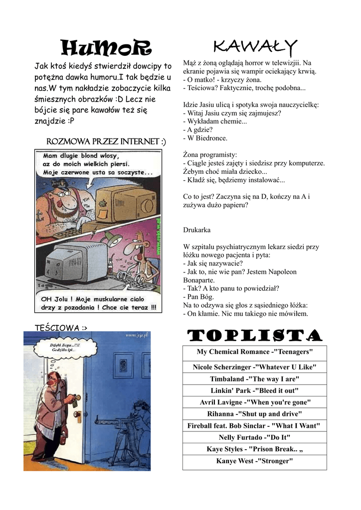 HuMoR Jak ktoś kiedyś stwierdził dowcipy to potężna dawka humoru.I tak będzie u nas.W tym nakładzie zobaczycie kilka śmiesznych obrazków :D Lecz nie bójcie się pare kawałów też się znajdzie :P Rozmowa przez Internet :) KAWAŁY Mąż z żoną oglądają horror w telewizjii. Na ekranie pojawia się wampir ociekający krwią. - O matko! - krzyczy żona. - Teściowa? Faktycznie, trochę podobna... Idzie Jasiu ulicą i spotyka swoja nauczycielkę: - Witaj Jasiu czym się zajmujesz? - Wykładam chemie... - A gdzie? - W Biedronce. Żona programisty: - Ciągle jesteś zajęty i siedzisz przy komputerze. Żebym choć miała dziecko... - Kładź się, będziemy instalować... Co to jest? Zaczyna się na D, kończy na A i zużywa dużo papieru? Drukarka W szpitalu psychiatrycznym lekarz siedzi przy łóżku nowego pacjenta i pyta: - Jak się nazywacie? - Jak to, nie wie pan? Jestem Napoleon Bonaparte. - Tak? A kto panu to powiedział? - Pan Bóg. Na to odzywa się głos z sąsiedniego łóżka: - On kłamie. Nic mu takiego nie mówiłem. TEŚCIOWA :> TOPLISTA My Chemical Romance -"Teenagers" Nicole Scherzinger -”Whatever U Like" Timbaland -"The way I are" Linkin' Park -"Bleed it out" Avril Lavigne -"When you're gone" Rihanna -"Shut up and drive" Fireball feat. Bob Sinclar - "What I Want" Nelly Furtado -"Do It" Kaye Styles - "Prison Break.. „ Kanye West -"Stronger"