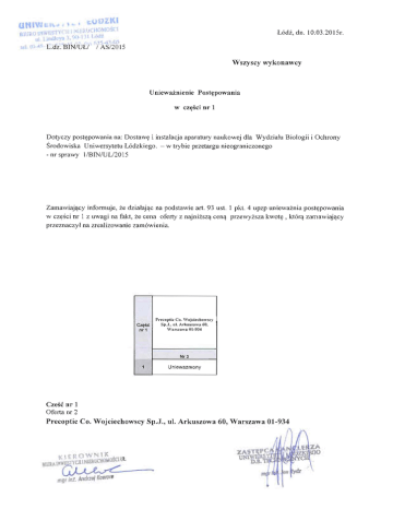 )' I II I II l'~ JI I "~ I '~'l!l IIOMDsr-L Li l~ulcl ' ,'In r I I .... Lodz, dn. 10.03.20151'. I I A r. _ " I ~ I -"L~ ~J ..· Ldz. BIN lULl i AS/20 15 Wszyscy wykonawcy U niewaznienie Postepowania w czesci nr 1 Dotyczy postepowania na: Dostawe i instalacja aparatury naukcwej dla Wydzialu Biologii i Ochrony Srodowiska Uniwersytetu L6dzkiego . - w trybie przetargu nieograniczonego - nr sprawy l/BfN/UL/2015 Zamawiajacy informuje, ze dzialajac na podstawie art. 93 LIst . 1 pkt. 4 upzp uniewaznia postepowania w czesci or 1 z uwagi na fakt, ze cena oferty z najnizsza cena przewyzsza kwote , ktora zarnawiajacy przeznaczyl na zrealizowanie zamowienia. Prc coptic Co. Wojciecbowscy Sp.J., "J. Arku szowa 60, War -szawa 01-934 CZ~SC nr 1 1 Nr3 Unlewazruony Czesc nr 1 Oferta or 2 Precoptic Co. Wojciechowscy Sp.J., ul. Arkuszowa 60, Warszawa 01-934