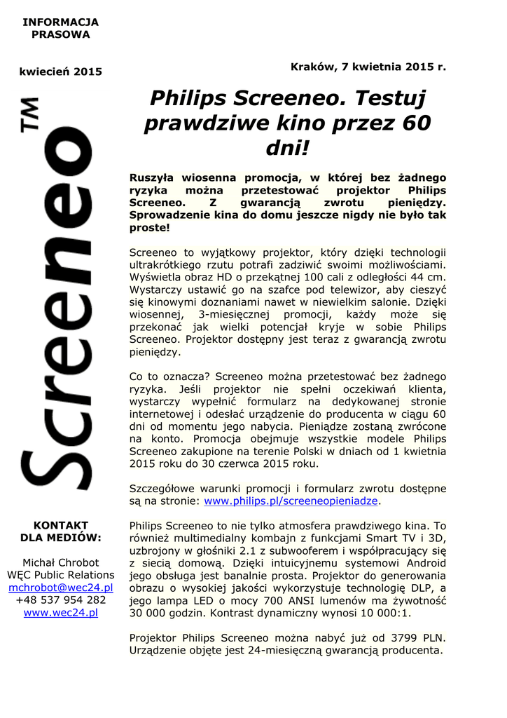 INFORMACJA PRASOWA kwiecień 2015 Kraków, 7 kwietnia 2015 r. Philips Screeneo. Testuj prawdziwe kino przez 60 dni! Ruszyła wiosenna promocja, w której bez żadnego ryzyka można przetestować projektor Philips Screeneo. Z gwarancją zwrotu pieniędzy. Sprowadzenie kina do domu jeszcze nigdy nie było tak proste! Screeneo to wyjątkowy projektor, który dzięki technologii ultrakrótkiego rzutu potrafi zadziwić swoimi możliwościami. Wyświetla obraz HD o przekątnej 100 cali z odległości 44 cm. Wystarczy ustawić go na szafce pod telewizor, aby cieszyć się kinowymi doznaniami nawet w niewielkim salonie. Dzięki wiosennej, 3-miesięcznej promocji, każdy może się przekonać jak wielki potencjał kryje w sobie Philips Screeneo. Projektor dostępny jest teraz z gwarancją zwrotu pieniędzy. Co to oznacza? Screeneo można przetestować bez żadnego ryzyka. Jeśli projektor nie spełni oczekiwań klienta, wystarczy wypełnić formularz na dedykowanej stronie internetowej i odesłać urządzenie do producenta w ciągu 60 dni od momentu jego nabycia. Pieniądze zostaną zwrócone na konto. Promocja obejmuje wszystkie modele Philips Screeneo zakupione na terenie Polski w dniach od 1 kwietnia 2015 roku do 30 czerwca 2015 roku. Szczegółowe warunki promocji i formularz zwrotu dostępne są na stronie: www.philips.pl/screeneopieniadze. KONTAKT DLA MEDIÓW: Michał Chrobot WĘC Public Relations [email protected] +48 537 954 282 www.wec24.pl Philips Screeneo to nie tylko atmosfera prawdziwego kina. To również multimedialny kombajn z funkcjami Smart TV i 3D, uzbrojony w głośniki 2.1 z subwooferem i współpracujący się z siecią domową. Dzięki intuicyjnemu systemowi Android jego obsługa jest banalnie prosta. Projektor do generowania obrazu o wysokiej jakości wykorzystuje technologię DLP, a jego lampa LED o mocy 700 ANSI lumenów ma żywotność 30 000 godzin. Kontrast dynamiczny wynosi 10 000:1. Projektor Philips Screeneo można nabyć już od 3799 PLN. Urządzenie objęte jest 24-miesięczną gwarancją producenta. INFORMACJA PRASOWA kwiecień 2015 Tagi: projektory, Philips Screeneo, kino domowe, Ultra-Short Throw, ultra krótki rzut, LED, Android, SD, HDMI, WiFi, DLNA, Miracast, projektor do domu, promocje, Sagemcom, okazje, CashBack Szczegółowe warunki oferty promocyjnej: www.philips.pl/screeneopieniadze Więcej informacji o projektorze Screeneo: www.screeneo.eu Philips Screeneo – prezentacje wideo: https://youtu.be/HLoynDI2Zes https://youtu.be/ELjLZFCMno4 O firmie Sagemcom Sagemcom to holding technologiczny o rodowodzie francuskim, działający w skali globalnej. Firma jest uznanym dostawcą nowoczesnych rozwiązań komunikacyjnych. Specjalizuje się w komunikacji szerokopasmowej oraz telekomunikacji, oferując zarówno urządzenia dla profesjonalistów, jak i ogółu społeczeństwa. Marka Philips jest własnością Koninklijke Philips Electronics N.V. i jest wykorzystywana przez Sagemcom na mocy przyznanej licencji. Pozostałe nazwy zostały użyte wyłącznie w celach informacyjnych i mogą być zastrzeżonymi znakami handlowymi ich prawnych właścicieli. KONTAKT DLA MEDIÓW: Michał Chrobot WĘC Public Relations [email protected] +48 537 954 282 www.wec24.pl