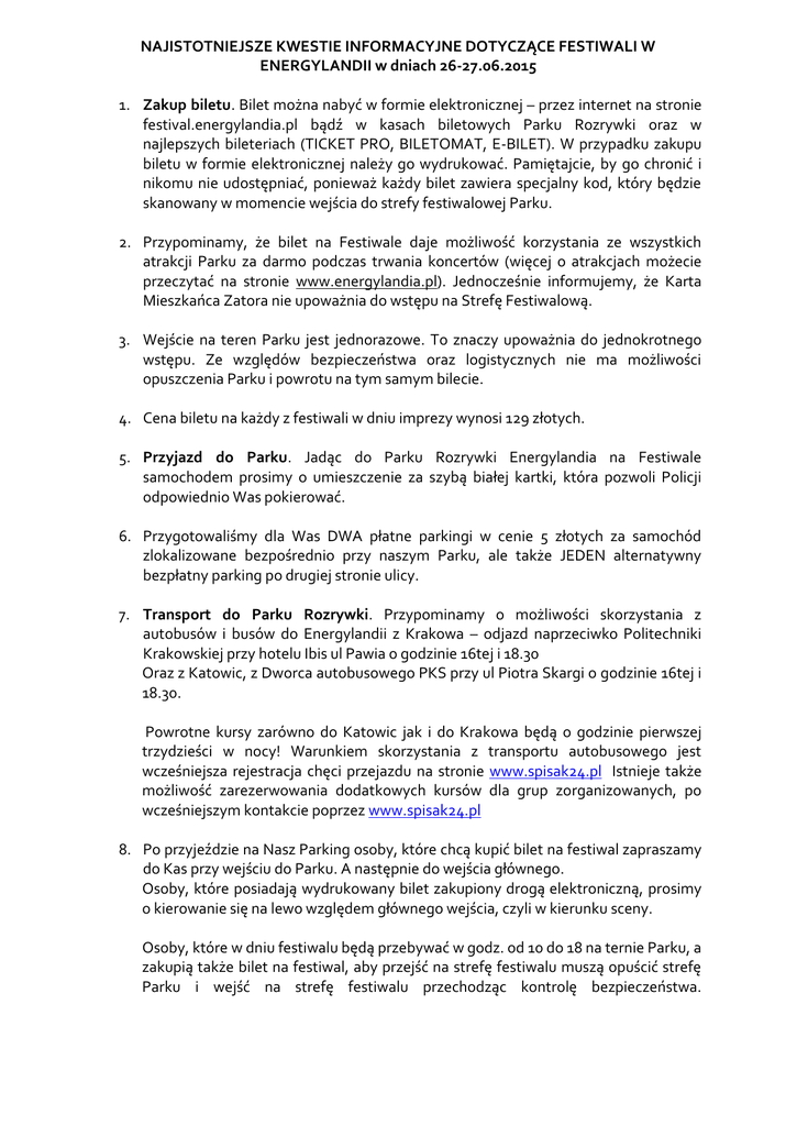 NAJISTOTNIEJSZE KWESTIE INFORMACYJNE DOTYCZĄCE FESTIWALI W ENERGYLANDII w dniach 26-27.06.2015 1. Zakup biletu. Bilet można nabyć w formie elektronicznej – przez internet na stronie festival.energylandia.pl bądź w kasach biletowych Parku Rozrywki oraz w najlepszych bileteriach (TICKET PRO, BILETOMAT, E-BILET). W przypadku zakupu biletu w formie elektronicznej należy go wydrukować. Pamiętajcie, by go chronić i nikomu nie udostępniać, ponieważ każdy bilet zawiera specjalny kod, który będzie skanowany w momencie wejścia do strefy festiwalowej Parku. 2. Przypominamy, że bilet na Festiwale daje możliwość korzystania ze wszystkich atrakcji Parku za darmo podczas trwania koncertów (więcej o atrakcjach możecie przeczytać na stronie www.energylandia.pl). Jednocześnie informujemy, że Karta Mieszkańca Zatora nie upoważnia do wstępu na Strefę Festiwalową. 3. Wejście na teren Parku jest jednorazowe. To znaczy upoważnia do jednokrotnego wstępu. Ze względów bezpieczeństwa oraz logistycznych nie ma możliwości opuszczenia Parku i powrotu na tym samym bilecie. 4. Cena biletu na każdy z festiwali w dniu imprezy wynosi 129 złotych. 5. Przyjazd do Parku. Jadąc do Parku Rozrywki Energylandia na Festiwale samochodem prosimy o umieszczenie za szybą białej kartki, która pozwoli Policji odpowiednio Was pokierować. 6. Przygotowaliśmy dla Was DWA płatne parkingi w cenie 5 złotych za samochód zlokalizowane bezpośrednio przy naszym Parku, ale także JEDEN alternatywny bezpłatny parking po drugiej stronie ulicy. 7. Transport do Parku Rozrywki. Przypominamy o możliwości skorzystania z autobusów i busów do Energylandii z Krakowa – odjazd naprzeciwko Politechniki Krakowskiej przy hotelu Ibis ul Pawia o godzinie 16tej i 18.30 Oraz z Katowic, z Dworca autobusowego PKS przy ul Piotra Skargi o godzinie 16tej i 18.30. Powrotne kursy zarówno do Katowic jak i do Krakowa będą o godzinie pierwszej trzydzieści w nocy! Warunkiem skorzystania z transportu autobusowego jest wcześniejsza rejestracja chęci przejazdu na stronie www.spisak24.pl Istnieje także możliwość zarezerwowania dodatkowych kursów dla grup zorganizowanych, po wcześniejszym kontakcie poprzez www.spisak24.pl 8. Po przyjeździe na Nasz Parking osoby, które chcą kupić bilet na festiwal zapraszamy do Kas przy wejściu do Parku. A następnie do wejścia głównego. Osoby, które posiadają wydrukowany bilet zakupiony drogą elektroniczną, prosimy o kierowanie się na lewo względem głównego wejścia, czyli w kierunku sceny. Osoby, które w dniu festiwalu będą przebywać w godz. od 10 do 18 na ternie Parku, a zakupią także bilet na festiwal, aby przejść na strefę festiwalu muszą opuścić strefę Parku i wejść na strefę festiwalu przechodząc kontrolę bezpieczeństwa. 9. Bezpieczeństwo, komfort, płatności. Teren strefy Festiwalu zostanie zaopatrzony w toalety, punkty gastronomiczne, punkty medyczne oraz szatnie w cenie 3 złotych. W szatni dostępne będą także peleryny przeciwdeszczowe w cenie 3 złotych. Przed wejściem na strefę festiwalową udostępnione zostaną szafki depozytowe w cenie 10 złotych. Na terenie strefy festiwalowej obowiązują tylko płatności ŻETONAMI. Żetony będą dostępne tylko za gotówkę, w czterech punktach zlokalizowanych w pobliżu strefy gastronomicznej. Jeden żeton kosztuje 6 złotych. Niewykorzystane ŻETONY można zwrócić w Kasach tylko i wyłącznie za okazaniem paragonu wydanego w momencie ich zakupu. Na terenie Parku Rozrywki dostępny jest także BANKOMAT znajdujący się bezpośrednio przy wejściu do Parku. W pobliżu szatni znajdziecie także, Informację, Punkt Osób i Rzeczy Zagubionych, Sklep z pamiątkami oraz Meeting Point, czyli miejsce w którym możecie umówić się ze swoimi znajomymi. 10. Prognoza pogody na 26 i 27 czerwca. Co prawda zamówiliśmy słońce i wysokie temperatury powietrza, ale Pogoda zastrzegła sobie ewentualne zmiany bez wcześniejszego informowania. To jednak nie jest dla Nas przeszkodą. Strefę Festiwalu i pieszą infrastrukturę komunikacyjną, chodniki – wyłożyliśmy kostką brukową zapewniającą Wam komfort przemieszczania się po terenie EnergyLandii. Możecie być zatem spokojni o czystość Waszego obuwia w razie deszczu. W szatniach dostępne będą także odpłatne peleryny przeciwdeszczowe. 11. Zabrania się wnoszenia na teren Strefy Festiwalowej: profesjonalnego sprzętu rejestrującego obraz i dźwięk, wnoszenia własnych napoi, zwierząt, niebezpiecznych przedmiotów czy broni. Szczegółowe zasady przeczytasz w regulaminie, który będzie dostępny na terenie Festivalu. Przypominamy także o zakazie utrwalania za pomocą dźwięku oraz obrazu artystów w czasie ich występów.