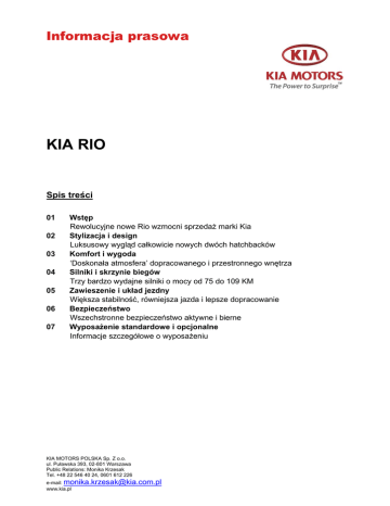 Informacja prasowa KIA RIO Spis treści 01 02 03 04 05 06 07 Wstęp Rewolucyjne nowe Rio wzmocni sprzedaż marki Kia Stylizacja i design Luksusowy wygląd całkowicie nowych dwóch hatchbacków Komfort i wygoda ‘Doskonała atmosfera’ dopracowanego i przestronnego wnętrza Silniki i skrzynie biegów Trzy bardzo wydajne silniki o mocy od 75 do 109 KM Zawieszenie i układ jezdny Większa stabilność, równiejsza jazda i lepsze dopracowanie Bezpieczeństwo Wszechstronne bezpieczeństwo aktywne i bierne Wyposażenie standardowe i opcjonalne Informacje szczegółowe o wyposażeniu KIA MOTORS POLSKA Sp. Z o.o. ul. Puławska 393, 02-801 Warszawa Public Relations: Monika Krzesak Tel. +48 22 546 40 24, 0601 612 226 e-mail: [email protected] www.kia.pl 1 WSTĘP Rewolucyjne nowe Rio wzmocni sprzedaż marki Kia • Nowy model to rewolucja, a nie ewolucja w porównaniu z poprzednikiem • Emisja CO2 gamy modeli Rio rozpoczyna się od jednego z najlepszych w branży wyników – 85 g/km. Wersja ta będzie oferowana w wybranych krajach • Po raz pierwszy dostępne w wersji pięciodrzwiowej i trzydrzwiowej Czwarta już generacja modelu Kia Rio, która miała światową premierę podczas Salonu Samochodowego w Genewie w marcu 2011, ma za zadanie wstrząsnąć segmentem samochodów kompaktowych i zintensyfikować wzrost sprzedaży marki Kia w Europie Oprócz atrakcyjnego wyglądu, odpowiadającego na estetyczne potrzeby kierowców, nowa Kia Rio wykorzystuje szereg przodujących rozwiązań proekologicznych i obniżających koszty eksploatacji. Emisja CO2 gamy tego modelu rozpoczyna się już na poziomie 85 g/km. Ten wynik sprawia, że najbardziej przyjazna ekologicznie wersja nowego modelu Kia, Rio EcoDynamics, wyprzedza wszystkich innych przedstawicieli segmentu B, sprzedawanych obecnie w Europie. Ze względu jednak na brak polityki proekologicznej w Polsce auta z rozwiązaniami EcoDynamics nie będą na razie na naszym rynku oferowane. „Nowa Kia Rio to rewolucja, a nie ewolucja w stosunku do poprzednika. Model Rio od początku osiągnął sukces komercyjny, a jego nowe wcielenie to atrakcyjny samochód o sportowym zacięciu – samochód, który kierowcy będą chcieli kupować ze względu na wygląd, ale też z powodu jego właściwości ekologicznych”, podkreśla Benny Oeyen, Wiceprezes ds. Marketingu i Planowania Produktu w Kia Motors Europe. Od premiery trzeciej generacji Rio w 2005 roku sprzedaż na całym świecie osiągnęła łącznie 860 000 egzemplarzy. To trzeci najlepszy pod względem sprzedaży samochód firmy na rynkach w 2010 roku, kiedy to jego sprzedaż przekroczyła 219 000 pojazdów. KIA MOTORS POLSKA Sp. Z o.o. ul. Puławska 393, 02-801 Warszawa Public Relations: Monika Krzesak Tel. +48 22 546 40 24, 0601 612 226 e-mail: [email protected] www.kia.pl Nowy model jest dłuższy, szerszy i niższy, a jego rozstaw osi został wydłużony o 70 mm, co znacznie zwiększa przestrzeń dostępną dla pasażerów i na bagaż. Dzięki całkowitej wysokości 1455 mm, nowe Rio ma jedną z najniżej poprowadzonych linii dachu w europejskiej gamie modeli tej marki, co podkreśla jego wyrazistą sylwetkę. Dostępne po raz pierwszy w Europie w wersji pięciodrzwiowej i trzydrzwiowej, nowe Rio ma od nowa określić swoją pozycję w jednym z najbardziej konkurencyjnych segmentów. Prowadzone przez ekspertów Kia badania rynkowe przewidują, że globalne zapotrzebowanie na samochody segmentu B znacznie wzrośnie w następnych dwóch latach. Analitycy przewidują, że globalne zapotrzebowanie na samochody tego segmentu wzrośnie do 9,2 miliona pojazdów w 2012 roku i do 14,0 milionów w roku 2014. Aby obniżyć zużycie paliwa i pomóc osiągnąć przodujący w tej klasie poziom emisji, inżynierowie firmy Kia zrealizowali zakrojony na szeroką skalę program obniżania wagi licznych komponentów. W rezultacie nowe Rio nie jest cięższe niż generacja, którą zastępuje, choć jest samochodem znacznie większym i oferuje dodatkowe wyposażenie, opcje i właściwości. Nowe Rio dostępne będzie w Europie w dwóch wersjach nadwozia: 5-drzwiowej i 3-drzwiowej. Wersja 5-drzwiowa dostępna będzie w Polsce w sprzedaży od września. Od września będzie można również składać zamówienia na wersję 3-drzwiową jednak realizacja tych zamówień nastąpi pod koniec pierwszego kwartału roku 2012. Prognozowany plan sprzedaży nowego Rio w Polsce na rok 2012 to 1600 szt. Obie odmiany będą produkowane wyłącznie w zakładzie Kia w Sohari w Korei. 2 STYLIZACJA I DESIGN Luksusowy wygląd dwóch hatchbacków • Śmiała i charakterystyczna osobowość całkowicie nowego modelu Rio • Zrównoważone proporcje tworzą dopracowaną sylwetkę, rzadko spotykaną w segmencie B KIA MOTORS POLSKA Sp. Z o.o. ul. Puławska 393, 02-801 Warszawa Public Relations: Monika Krzesak Tel. +48 22 546 40 24, 0601 612 226 e-mail: [email protected] www.kia.pl • Odnowiona paleta 10 kolorów nadwozia Nowa generacja Rio to całkowite odejście od poprzednika, doskonale wpisujące się w odnowioną rodzinę samochodów Kia. Z przodu samochód prezentuje swoją własną, unikatową interpretację charakterystycznej dla marki osłony chłodnicy, zintegrowaną z przednimi reflektorami. Z boku odpowiednia proporcja szyb do karoserii wraz z pochylonym do przodu, klinowatym kształtem pojazdu i niską linią dachu tworzą dynamiczną, sportową sylwetkę, podobnie jak miało to miejsce np. w przypadku nowego Picanto. Model podkreśla też związek z większym Sportage mocnym i stabilnym tyłem, wysoko poprowadzonymi nadkolami i ostrym kątem tylnej szyby. Rio dostępne będzie w 10 kolorach nadwozia: biały, czarny , jasnosrebrny, czerwony Signal, beżowy Fresh, niebieski Electronic, niebieski Deep, brązowy Wendy, grafitowy i żółty Carmel. 3 KOMFORT I WYGODA Udoskonalone, przestronne wnętrze • Szeroka gama opcji wyposażenia tworzy w nowym Rio atmosferę luksusu • Kompaktowa Kia oferuje właściwości ‘dużego samo