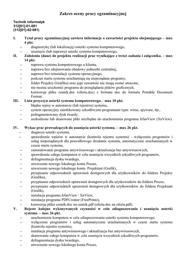 Zakres oceny pracy egzaminacyjnej Technik informatyk 312[01]-01-081 (312[01]-02-081) I. II. III. IV. V. Tytuł pracy egzaminacyjnej zawiera informacje o zawartości projektu obejmującego – max 4 pkt. diagnostykę (lub lokalizację) usterki systemu komputerowego, usunięcie (lub naprawę) usterki systemu komputerowego, Założenia (dane) do projektu realizacji prac wynikające z treści zadania i załącznika. – max 14 pkt. naprawa systemu komputerowego u klienta, naprawa bez zdejmowania obudowy jednostki centralnej, naprawa bez reinstalacji systemu operacyjnego, podczas startu systemu uruchamiają się niepożądane programy, folder Projekty (Grafika) oraz jego zawartość nie mogą zostać utracone, nie można uruchomić programu do przeglądania plików graficznych, konwersja pliku cennik.doc (oferta.doc) z formatu doc do formatu Portable Document Format. Lista przyczyn usterki systemu komputerowego. – max 10 pkt. błędne wpisy w autostarcie (lub rejestrze) systemu, system operacyjny zainfekowany szkodliwymi programami typu: wirus, spyware, itp., pofragmentowany dysk twardy, uszkodzone lub skasowane pliki niezbędne do uruchomienia programu IrfanView (XnView). Wykaz prac prowadzących do usunięcia usterki systemu. – max 26 pkt. diagnoza usterki systemu, sprawdzenie wpisów w autostarcie (kontrola rejestru systemu) - wyłączenie programów i usług niepożądanych dla prawidłowego działania systemu, automatycznie uruchamianych w czasie startu systemu, zainstalowanie programu antywirusowego i aktualizacja baz antywirusowych, sprawdzenie całego komputera w celu usunięcia wszystkich szkodliwych programów, defragmentacja dysku twardego, utworzenie nowego lokalnego konta Prezes, utworzenie nowego lokalnego konta Projektant (Grafik), przypisanie odpowiednich uprawnień dostępowych dla użytkowników do folderu Projekty (Grafika), przypisanie odpowiednich uprawnień dostępowych dla użytkowników do folderu Prezes, przypisanie odpowiednich uprawnień dostępowych dla użytkowników do folderu Projektant (Grafik), instalacja programu IrfanView / XnView, instalacja programu PDFCreator (FreePrimo), konwersja pliku cennik.doc na cennik.pdf (oferta.doc na oferta.pdf). Rejestr kolejno wykonywanych czynności w celu zdiagnozowania i usunięcia usterki systemu. – max 26 pkt. uruchomienie komputera w celu zdiagnozowania usterki systemu komputerowego, wyłączenie programów i usług automatycznie uruchamianych w czasie startu systemu (kontrola rejestru systemu), instalacja programu antywirusowego i aktualizacja baz antywirusowych, skanowanie całego komputera w celu usunięcia wszystkich szkodliwych programów, defragmentacja dysku twardego, utworzenie nowego lokalnego konta Prezes, VI. VII. utworzenie nowego lokalnego konta Projektant (Grafik), przypisanie odpowiednich uprawnień dostępowych dla użytkowników do folderu Projekty (Grafika), przypisanie odpowiednich uprawnień dostępowych dla użytkowników do folderu Prezes, przypisanie odpowiednich uprawnień dostępowych dla użytkowników do folderu Projektant (Grafik), ponowna instalacja programu IrfanView (XnView), instalacja programu PDFCreator (FreePrimo), konwersja pliku cennik.doc na cennik.pdf (oferta.doc na oferta.pdf). Wnioski o poprawności działania systemu komputerowego po usunięciu usterki, na podstawie wyników diagnozowania końcowego systemu. – max 16 pkt. uruchamia się system operacyjny, przy starcie systemu nie uruchamiają się niepożądane programy, system komputerowy jest wolny od wirusów i szkodliwych programów, zdefragmentowany dysk twardy, zostały utworzone dwa lokalne konta: Prezes, Projektant (Grafik), dane (katalogi, pliki) użytkowników są odpowiednio zabezpieczone, program IrfanView (XnView) uruchamia się, został utworzony plik cennik.pdf (oferta.pdf). Praca egzaminacyjna jako całość. – max 4 pkt. logiczna, uporządkowana, przejrzystej strukturze, poprawna językowo i terminologicznie, czytelna, estetyczna. Liczba punktów możliwych do uzyskania za pracę – 100. Próg zaliczenia - 75 pkt.