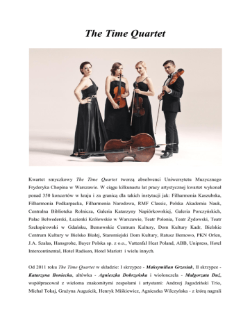 The Time Quartet Kwartet smyczkowy The Time Quartet tworzą absolwenci Uniwersytetu Muzycznego Fryderyka Chopina w Warszawie. W ciągu kilkunastu lat pracy artystycznej kwartet wykonał ponad 350 koncertów w kraju i za granicą dla takich instytucji jak: Filharmonia Kaszubska, Filharmonia Podkarpacka, Filharmonia Narodowa, RMF Classic, Polska Akademia Nauk, Centralna Biblioteka Rolnicza, Galeria Katarzyny Napiórkowskiej, Galeria Porczyńskich, Pałac Belwederski, Łazienki Królewskie w Warszawie, Teatr Polonia, Teatr Żydowski, Teatr Szekspirowski w Gdańsku, Bemowskie Centrum Kultury, Dom Kultury Kadr, Bielskie Centrum Kultury w Bielsko Białej, Staromiejski Dom Kultury, Ratusz Bemowo, PKN Orlen, J.A. Szałas, Hansgrohe, Bayer Polska sp. z o.o., Vattenfal Heat Poland, ABB, Unipress, Hotel Intercontinental, Hotel Radison, Hotel Mariott i wielu innych. Od 2011 roku The Time Quartet w składzie: I skrzypce - Maksymilian Grzesiak, II skrzypce Katarzyna Boniecka, altówka - Agnieszka Dobrzyńska i wiolonczela - Małgorzata Duź, współpracował z wieloma znakomitymi zespołami i artystami: Andrzej Jagodziński Trio, Michał Tokaj, Grażyna Auguścik, Henryk Miśkiewicz, Agnieszka Wilczyńska - z którą nagrali płytę "Tutaj mieszkam" (płyta ta w 2016 r. otrzymała nagrodę Fryderyka za fonograficzny debiut roku jazz), Maciej "Trifonidis" Bielawski - z którym nagrali już 3 płyty, Bartosz Gliniak - którego muzykę do filmów regularnie nagrywają. Uczestniczyli w kilku polskich i międzynarodowych festiwalach m.in. w XXXI Silesian Jazz Meeting 2016r., Festiwalu Muzycznym w Łańcucie, XXIII Jazz Standard's Festival, Festiwalu "Dwa Brzegi", Festiwalu Wojciecha Młynarskiego. The Time Quartet wspiera również muzycznie akcje charytatywne - w 2015 roku wraz z Dawidem Podsiadło, Derrickiem McKenzie, Wojciechem Rucińskim i Maciejem Stuhrem nagrali utwór towarzyszący klipowi promującemu program pomocy humanitarnej "Pajacyk". Muzycy The Time Quartet współpracują także z Orkiestrą Sinfonia Iuventus, World Orchestra Grzecha Piotrowskiego, Zespołem Tango Fuerte, Zespołem Ludowym Pieśni i Tańca „Mazowsze”, Trifonidis Downtown Sextet oraz 3275 kg Orchestra. Są założycielami i tworzą podstawę studyjnej orkiestry Melanidis Orchestra, z którą nagrali muzykę do 6 polskich i zagranicznych filmów. The Time Quartet to jeden z najlepszych polskich kwartetów smyczkowych, który w swoim repertuarze posiada utwory muzyki klasycznej ze wszystkich epok, wielu wybitnych kompozytorów m.in. J. S. Bach, A. Corelli, W. A. Mozart, G. F. Haendel, J. Haydn, L. van Beethoven, A. Vivaldi, R. Schumann, L. Boccherini, J. Pachelbel, A. Dvorak, A. Chaczaturian, M. Musorgski, J. Brahms, A. Borodin, C. Debussy, D. Szostakowicz, w tym również utwory czołowych kompozytorów polskich: F. Chopin, M. K. Ogiński, G. Bacewicz, K. Szymanowski czy S. Moniuszko. Odpowiadając na potrzeby szerszego grona odbiorców kwartet rozszerzył swoje działania tworząc własne oryginalne aranżacje muzyki popularnej - filmowej i rozrywkowej. Dlatego też w repertuarze The Time Quartet można odnaleźć niezapomniane tematy z filmów i musicali jak np.: "Noce i Dnie", "Dziecko Rosmery", "Skrzypek na dachu", "Zapach kobiety", "Lista Schindlera", "West side story", "Piękna i Bestia", "Ojciec Chrzestny", "Gra o tron", "James Bond", "Misja", "Piraci z Karaibów", "Amelia", a także najpopularniejsze utwory muzyki rozrywkowej takich artystów jak: Elvis Presley, Queen, The Beatles, Sinatra, ABBA, Bee Gees, Piazzolla, Sting, Metallica, Coldplay, Adele, Bruno Mars, Michael Jackson i inni. Efektem jest wydana w 2015 roku płyta "One", zawierająca utwory muzyki rozrywkowej i filmowej.