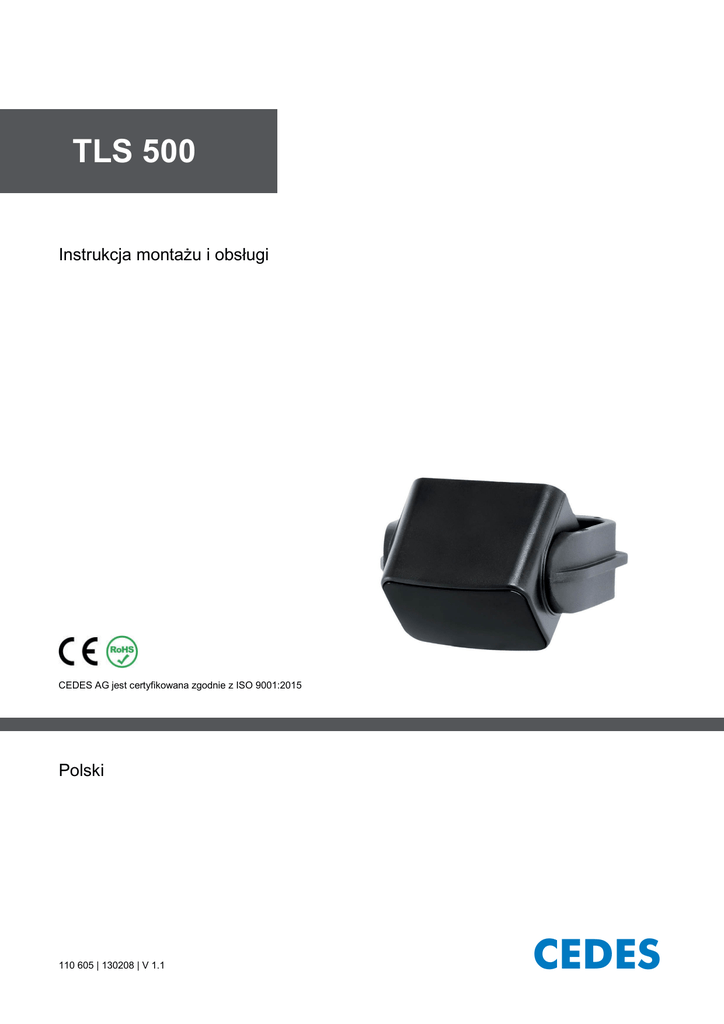 TLS 500 Instrukcja montażu i obsługi CEDES AG jest certyfikowana zgodnie z ISO 9001:2015 Polski 110 605 | 130208 | V 1.1 CEDES TLS 500 Spis treści 1. Informacje o tej instrukcji 1. Informacje o tej instrukcji 2 1.1 Jednostki miar 1.2 Powiązane dokumenty 1.3 Główna siedziba CEDES 2 2 2 2. 3 Informacje o bezpieczeństwie 2.1 Ograniczenia stosowania 3 3. 3 Symbole, ostrzeżenia 3.1 Kategorie ostrzeżeń 3 4. 4 Wprowadzenie 4.1 Przykładowe zastosowania 4.2 Własności TLS 500 4.3 Oznaczenia typów 4 4 4 5. 5 Zasada działania 5.1 Elementy dostarczanego zestawu 5.2 Opis TLS 500 5.3 Wymiary pola detekcji 5 6 6 6. Konfiguracja 6 6.1 6.2 6.3 6.4 Typ N Typ P Typ VR Współczynnik korekcji 6 6 7 7 7. Instalacja 7 8. Podłączenie elektryczne 8 8.1 Wyjście półprzewodnikowe 8.2 Wejście testu 8 8 9. 9 Przebiegi czasowe 10. Uruchomienie 9 10.1 Przeprowadzenie testu 9 11. Sygnalizacja LED 10 12. Rozwiązywanie problemów 10 13. Konserwacja 10 14. Usuwanie czujnika 10 15. Dane techniczne 11 16. Wymiary 12 16.1 Wymiary uchwytu mocującego 12 2 Niniejsza „Instrukcja montażu i obsługi TLS 500”, zawierający miary metryczne i amerykańskie, jest dokumentem źródłowym. Numer wersji jest umieszczony na dole każdej strony. Z adresu www.cedes.com można pobrać jej najnowszą wersję, wraz z powiązanymi dokumentami. 1.1 Jednostki miar O ile nie określono inaczej, jednostki miar podano w mm (liczby bez nawiasów) oraz w calach (liczby w nawiasach). 1.2 Powiązane dokumenty Specyfikacja TLS 500 Dokument nr 001 181 Skrócona instrukcja montażu TLS 500 Dokument nr 112 015 1.3 Główna siedziba CEDES CEDES AG Science Park CH-7302 Landquart Szwajcaria CEDES AG zastrzega sobie prawo do modyfikacji dokumentu lub danych technicznych bez uprzedzenia. © CEDES | V 1.1 TLS 500 2. Informacje o bezpieczeństwie WAŻNE! PRZECZYTAĆ PRZED INSTALACJĄ! Polski 3. Symbole, ostrzeżenia Symbol TLS 500 opracowano i wyprodukowano stosując najnowsze metody i technologie. Niemniej, nadal istnieje ryzyko wypadku lub uszkodzenia czujnika. 1. 2. 3. Aby warunki działania były bezpieczne, należy: • Zapoznać się ze wszystkimi znajdującymi się tu poleceniami i informacjami. Starannie wypełnić polecenia podane w tym dokumencie. Zwracać uwagę na wszelkie ostrzeżenia zawarte w dokumentacji oraz dołączone do czujnika. Nie stosować czujnika, jeśli jest w jakikolwiek sposób uszkodzony. Przechowywać tę instrukcję w miejscu instalacji. TLS 500 może być zainstalowany tylko przez uprawnione i w pełni przeszkolone osoby! Instalator lub integrator systemu jest całkowicie odpowiedzialny za bezpieczną integrację czujnika. Projektant i/lub instalator i/lub kupujący są wyłącznie odpowiedzialni za zagwarantowanie, aby ten produkt był zastosowany zgodnie ze wszystkimi odpowiednimi normami i przepisami prawa w celu zapewnienia bezpiecznego działania całej aplikacji. Każda przeróbka urządzenia przez kupującego, instalatora lub użytkownika może doprowadzić do niebezpiecznych warunków pracy. CEDES nie ponosi żadnej odpowiedzialności prawnej lub gwarancyjnej będącej skutkiem takich manipulacji. Niezastosowanie się do poleceń zawartych w tej instrukcji i/lub innych dokumentach powiązanych z TLS 500 może skutkować zgłaszaniem reklamacji przez klienta, nagłymi wezwaniami, szkodami, obrażeniami ciała lub śmiercią. 2.1 Ograniczenia stosowania Nie wolno stosować TLS 500 do: • Ochrony ludzi przy niebezpiecznych maszynach • Urządzeń w potencjalnie wybuchowych atmosferach • Urządzeń w środowiskach radioaktywnych Znaczenie Pojedyncze polecenie lub działania bez określonej kolejności Polecenia w określonej kolejności Lista, kolejność nieistotna Ważne: Odsyłacz do rozdziału, ilustracji lub tabeli w tym dokumencie Ważna informacja dotycząca prawidłowego stosowania czujnika 3.1 Kategorie ostrzeżeń Ostrzeżenie o poważnych zagrożeniach życia OSTRZEŻENIE Poważne zagrożenie życia Podkreśla istotne informacje dotyczące bezpiecznego stosowania czujnika. Zignorowanie tych ostrzeżeń może skutkować poważnymi obrażeniami ciała lub śmiercią. Wypełnić polecenia oznaczone trójkątnymi strzałkami Mieć na względzie informacje o bezpieczeństwie opisane w Rozdziale 2 niniejszej instrukcji Przestroga o możliwych zagrożeniach zdrowia PRZESTROGA Możliwe zagrożenie zdrowia Podkreśla istotne informacje dotyczące bezpiecznego stosowania czujnika. Zignorowanie tych przestróg może skutkować obrażeniami ciała. Wypełnić polecenia oznaczone trójkątnymi strzałkami Mieć na względzie informacje o bezpieczeństwie opisane w Rozdziale 2 niniejszej instrukcji Uwaga o ryzyku wystąpienia szkód UWAGA Ryzyko uszkodzenia Tylko odpowiednio atestowane urządzenia bezpieczeństwa można stosować do takich aplikacji, w przeciwnym razie można spowodować obrażenia ciała, śmierć lub szkody materialne! © CEDES | V 1.1 Zignorowanie tych uwag może doprowadzić do uszkodzenia czujnika, sterownika i/lub innych urządzeń. Wypełnić polecenia oznaczone trójkątnymi strzałkami 3 TLS 500 Polski 4. Wprowadzenie 4.2 Własności TLS 500 Skrajnie kompaktowy TLS 500, o gabarytach mniejszych niż pudełko zapałek, monitoruje strefy dostępu do drzwi automatycznych i schodów ruchomych, aby wykryć potencjalnego użytkownika i zapewnić mu ich wygodne i bezpieczne działanie. Może on być także wykorzystany do ochrony niebezpiecznego obszaru pomiędzy składanymi skrzydłami drzwi, często występującymi w pojazdach komunikacji publicznej. • Jego elegancki wygląd pozwala na idealne wkomponowanie w otoczenie każdej aplikacji. To, wraz z jego łatwym montażem i ustawieniem pozycji, czynią go idealnym czujnikiem do najprzeróżniejszych drzwi automatycznych. Jego niewiarygodna niezawodność, połączona ze zwartą konstrukcją, regulowanym zasięgiem i opcjonalnym ignorowaniem nieruchomych obiektów oznacza, że TLS 500 posiada imponujący stosunek ceny do walorów 
