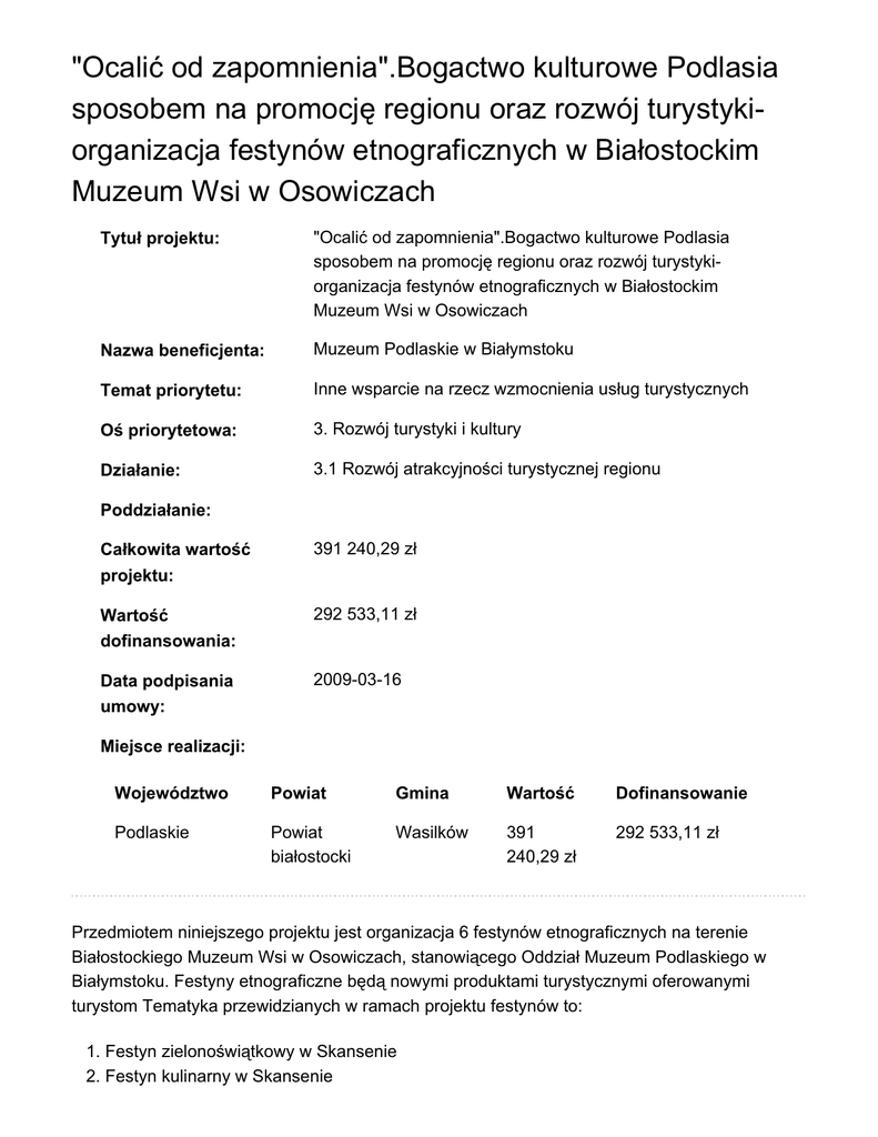 "Ocalić od zapomnienia".Bogactwo kulturowe Podlasia sposobem na promocję regionu oraz rozwój turystykiorganizacja festynów etnograficznych w Białostockim Muzeum Wsi w Osowiczach Tytuł projektu: "Ocalić od zapomnienia".Bogactwo kulturowe Podlasia sposobem na promocję regionu oraz rozwój turystykiorganizacja festynów etnograficznych w Białostockim Muzeum Wsi w Osowiczach Nazwa beneficjenta: Muzeum Podlaskie w Białymstoku Temat priorytetu: Inne wsparcie na rzecz wzmocnienia usług turystycznych Oś priorytetowa: 3. Rozwój turystyki i kultury Działanie: 3.1 Rozwój atrakcyjności turystycznej regionu Poddziałanie: Całkowita wartość projektu: 391 240,29 zł Wartość dofinansowania: 292 533,11 zł Data podpisania umowy: 2009-03-16 Miejsce realizacji: Województwo Powiat Gmina Wartość Dofinansowanie Podlaskie Powiat białostocki Wasilków 391 240,29 zł 292 533,11 zł Przedmiotem niniejszego projektu jest organizacja 6 festynów etnograficznych na terenie Białostockiego Muzeum Wsi w Osowiczach, stanowiącego Oddział Muzeum Podlaskiego w Białymstoku. Festyny etnograficzne będą nowymi produktami turystycznymi oferowanymi turystom Tematyka przewidzianych w ramach projektu festynów to: 1. Festyn zielonoświątkowy w Skansenie 2. Festyn kulinarny w Skansenie 3. Wesele w Skansenie 4. Dożynki w Skansenie 5. Festyn ziołowo ? miodowy w Skansenie 6. Festiwal Zespołów Folklorystycznych Województwo podlaskie słynie z bogatej obrzędowości, mającej charakterystyczne cechy folkloru obszarów pogranicza kulturowego. Obszar ten cechujący się wybitnymi walorami środowiska naturalnego, niespotykanym gdzie indziej bogactwem kulturowym, a więc zasobami, które wydają się być podstawą rozwoju turystyki. Jednakże region Podlasia nadal boryka się z poważnymi barierami właśnie w zakresie rozwoju turystyki. Jedną z nich jest bez wątpienia w dużej mierze niewystarczająca promocja obiektów o walorach kulturowych. Projekt jest odpowiedzią na potrzeby w zakresie promocji regionu oraz rozwoju turystyki, tworzenia nowych atrakcyjnych produktów turystycznych oraz promocji kultury Podlasia. Podlasie jak już wspomniano, jest regionem o wybitnych walorach środowiskowych, jak i kulturowych wynikających ze współistnienia od stuleci wielu nacji, styku i nakładania się różnych kultur. Stąd też nasz region jest uważany za najbardziej wielokulturowy i odznaczający się wyjątkowym bogactwem szeroko pojętej kultury i sztuki ludowej. Bogactwo kulturalne wyraża się w specyficznej obrzędowości, sztuce i rzemiośle ludowym, kulinariach i folklorze. Niestety w chwili obecnej, ze względu na miedzy innymi niewystarczające działania promocyjne, nasz region nie wykorzystuje w pełni z tego naturalnego potencjału. Stąd też niniejszy projekt zakłada skorzystanie z bogactwa, jakie posiadamy, na rzecz promocji turystycznej regionu, rozwoju funkcji turystycznych. Realizacja projektu przyczyni się do budowania pozytywnego wizerunku regionu, przyjaznego turystom i oferującego atrakcje, których nie ma nigdzie indziej. Problem niewystarczającej promocji, a co się z tym wiąże małej rozpoznawalności dotyczy również Białostockie Muzeum Wsi. Są tu zgromadzone niezwykle cenne obiekty drewnianej architektury oraz liczne eksponaty charakterystyczne dla regionu Podlasia. Białostockie Muzeum Wsi, popularnie zwane Skansenem w Jurowcach doskonale znają Białostoczanie oraz inni mieszkańcy okolicznych terenów. Natomiast Skansen jest mało znany pozostałym mieszkańcom regionu, mieszkańcom Polski oraz turystom zagranicznym. W dużej mierze jest to spowodowane brakiem ?żywych? działań promujących to miejsce. ?Żywych? to znaczy takich, które zagwarantują bezpośredni udział turystów oraz wszelkich osób zainteresowanych turystyką kulturową. Tylko takie obcowanie z kulturą wydaj się być najskuteczniejszym sposobem na ściągnięcie w to miejsce turystów. Cel ogólny projektu został zdefiniowany następująco: Celem ogólnym projektu jest promocja wielokulturowego Podlasia poprzez organizację festynów etnograficznych w Białostockim Muzeum Wsi Cele bezpośrednie projektu to: 1. utworzenie produktów turystycznych, jakim są festyny etnograficzne, 2. promocja produktów turystycznych w oparciu o kuchnię regionalną, sztukę i wytwórczość ludową oraz różnorodność kulturowo ? etniczną, 3. promocja miejsca ? Białostockiego Muzeum Wsi w Osowiczach, 4. przyciągnięcie możliwie dużej liczby turystów do Białostockiego Muzeum Wsi, 5. promocja szeroko pojętej kultury Podlasia