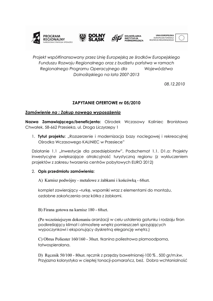 Projekt współfinansowany przez Unię Europejską ze środków Europejskiego Funduszu Rozwoju Regionalnego oraz z budŜetu państwa w ramach Regionalnego Programu Operacyjnego dla Województwa Dolnośląskiego na lata 2007-2013 08.12.2010 ZAPYTANIE OFERTOWE nr 05/2010 Zamówienie na : Zakup nowego wyposaŜenia Nazwa Zamawiającego/beneficjenta: Ośrodek Wczasowy Kaliniec Bronisława Chwałek, 58-662 Przesieka, ul. Droga Liczyrzepy 1 1. Tytuł projektu: „Rozszerzenie i modernizacja bazy noclegowej i rekreacyjnej Ośrodka Wczasowego KALINIEC w Przesiece” Działanie 1.1 „Inwestycje dla przedsiębiorstw”, Podschemat 1.1. D1.a: Projekty inwestycyjne zwiększające atrakcyjność turystyczną regionu (z wykluczeniem projektów z zakresu tworzenia centrów pobytowych EURO 2012) 2. Opis przedmiotu zamówienia: A) Karnisz podwójny - metalowe z Ŝabkami i końcówką - 68szt. komplet zawierający –rurkę, wsporniki wraz z elementami do montaŜu, ozdobne zakończenia oraz kółka z Ŝabkami. B) Firana gotowa na karnisz 180 - 68szt. (Po wcześniejszym dokonaniu aranŜacji w celu ustalenia gatunku i rodzaju firan podkreślający klimat i atmosferę wnętrz pomieszczeń sprzyjających wypoczynkowi i eksponujący dyskretną elegancję wnętrz.) C) Obrus Poliester 160/160 - 30szt. tkanina poliestrowa plamoodporna, łatwospieralana. D) Ręcznik 50/100 - 80szt. ręcznik z przędzy bawełnianej-100 % , 500 gr/m.kw. Przyjazna kolorystyka w ciepłej tonacji-pomarańcz, beŜ. Dobra wchłanialność E) Ręcznik 70/130 - 80szt. ręcznik z przędzy bawełnianej 100% , 500 gr/m.kw. Przyjazna kolorystyka w ciepłej tonacji-pomarańcz, beŜ. Dobra wchłanialność F) Pościel bawełna 160/200 + 1 poszewka - 80szt. wzór-druk-160/200+ 1 P.70/80-bawełna 100%, gramatura 135/gr/m.kw. G) Kołdra 155/200 + poduszka 70/80 Silikon - 40szt Kołdra 155/200-poszycie policottonowe , proponowany kolor ecri, wypełnienie włókna silikonowe. Kołdra o budowie dwuwarstwowej dodatkową termoizolacją w postaci poduszki powietrznej powstającej pomiędzy dwoma oddzielnie przepikowanymi warstwami. Produkt lekki, ciepły, antyalergiczny, z moŜliwością prania i dezynfekcji. Poduszka 70/80-poszycie polikottonowe, proponowany kolor ecri; wypełnienie syntetyczne, antyalergiczne, tzw. ”sztuczny puch”. Wypełnienie miękkie, spręŜyste, z moŜliwością prania i dezynfekcji. Produkt antyalergiczny. H) Koc - narzuta akryl 150/200 - 40szt. kolor beŜowy-tkanina 100% poliestrowa , łatwa w utrzymaniu , nie gniecie się, nie zaciąga, szybko schnąca. I) Prześcieradło bawełna 160/200 - 80szt. bawełna 100%, 135 gr/m. kw- kolor biały. 3. Kryteria wyboru oferty: a. W przypadku złoŜenia ofert przez więcej niŜ jednego Wykonawcę Zamawiający dokona oceny waŜnych ofert na podstawie poniŜej przedstawionych kryteriów oceny ofert: Kryterium Waga (%): Cena 80,00%, Gwarancja 20,00% b. Sposób oceny ofert Punkty za kryterium „Cena” zostaną obliczone wg następującego wzoru: Cena oferty najtańszej / Cena oferty badanej x 80% = ilość punktów Punkty za kryterium „Gwarancja” zostaną obliczone wg następującego wzoru: Liczba lat gwarancji oferty o największej liczbie lat gwarancji / Liczba lat gwarancji badanej oferty x 20% = ilość punktów Ilości punktów za poszczególne kryteria zostaną zsumowane i będą stanowić końcową ocenę oferty. Za najkorzystniejszą zostanie uznana oferta, która uzyska najwyŜszą końcową ocenę. 4. Termin i miejsce wykonywania zamówienia: Wykonawca zobowiązuje się do wykonania zamówienia w terminie od 20.12.2010 r. do dnia 30.12.2010 r. 5. Miejsce, sposób i termin składania ofert: Termin składania ofert upływa 14.12.2010 o godz. 16.00. Oferty otrzymane po tym terminie nie zostaną rozpatrzone. Wykonawca moŜe wycofać lub zmienić złoŜoną przez siebie ofertę przed terminem upływu jej składania. Oferty moŜna składać w następujący sposób: pisemnie pocztą lub osobiście – pod adresem siedziby firmy: 58-562 Podgórzyn, miejscowość: Przesieka, ul. Droga Liczyrzepy 1 (liczy się data i godzina wpłynięcia do Zamawiającego). Przez ofertę naleŜy rozumieć: a. Wypełniony i podpisany przez upowaŜnioną osobę formularz ofertowy (zał. nr 1 do zapytania), zawierający cenę całkowitą usługi. Cena całkowita podana przez Wykonawcę jest obowiązująca przez okres waŜności umowy i nie moŜe podlegać zmianom podczas jej trwania. b. Proponowany przez Wykonawcę kosztorys. c. Kserokopię aktualnego wpisu do właściwego rejestru uprawniającego Wykonawcę do występowania w obrocie prawnym (potwierdzona za zgodność przez Wykonawcę), d. Oświadczenie, Ŝe osoby, które będą uczestniczyć zamówienia posiadają wymagane uprawnienia. w wykonaniu e. Oświadczenie Wykonawcy dotyczące posiadania doświadczenia w branŜy wyposaŜenia hoteli oraz dokumenty potwierdzające doświadczenie. Warunki udziału w postępowaniu: Oferent powinien posiadać minimum 5 lat doświadczenia w branŜy wyposaŜenia hotelowego. 6. Osoba uprawniona do kontaktu: Danuta Śliwińska, 509 421 217, [email protected], 7. Oferentom nie przysługują środki ochrony prawnej, określone w ustawie Prawo Zamówień Publicznych (tekst jednolity Dz. U. Z 25 czerwca 2010 r., Nr 113, poz. 759). 8. W przypadku, gdy w określonym terminie nie wpłynie Ŝadna oferta lub wpłynie/wpłyną mniej niŜ 2 waŜne oferty, zamawiający dokonuje wyboru dowolnego wykonawcy, który spełnia wszystkie kryteria i warunki określone w zapytaniu ofertowym będącym podstawą wyłonienia wykonawcy.
