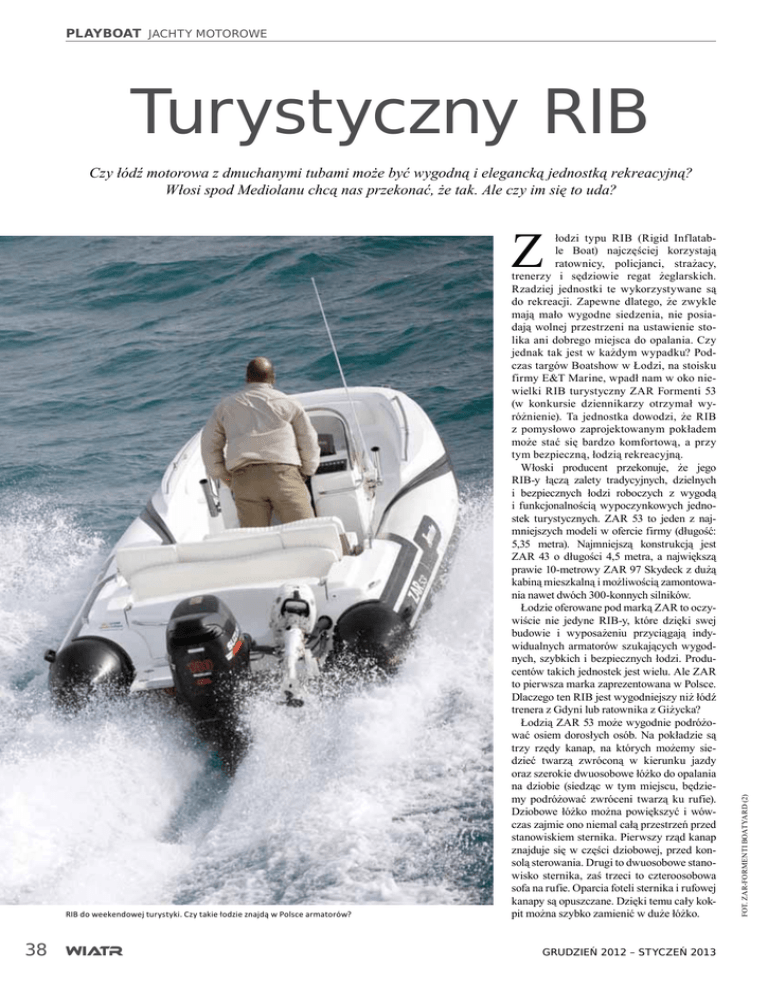 Playboat jachty motorowe Turystyczny RIB Czy łódź motorowa z dmuchanymi tubami może być wygodną i elegancką jednostką rekreacyjną? Włosi spod Mediolanu chcą nas przekonać, że tak. Ale czy im się to uda? RIB do weekendowej turystyki. Czy takie łodzie znajdą w Polsce armatorów? 38 grudzień 2012 – styczeń 2013 FOT. ZAR-FORMENTI BOATYARD (2) Z łodzi typu RIB (Rigid Inflatable Boat) najczęściej korzystają ratownicy, policjanci, strażacy, trenerzy i sędziowie regat żeglarskich. Rzadziej jednostki te wykorzystywane są do rekreacji. Zapewne dlatego, że zwykle mają mało wygodne siedzenia, nie posiadają wolnej przestrzeni na ustawienie stolika ani dobrego miejsca do opalania. Czy jednak tak jest w każdym wypadku? Podczas targów Boatshow w Łodzi, na stoisku firmy E&T Marine, wpadł nam w oko niewielki RIB turystyczny ZAR Formenti 53 (w konkursie dziennikarzy otrzymał wyróżnienie). Ta jednostka dowodzi, że RIB z pomysłowo zaprojektowanym pokładem może stać się bardzo komfortową, a przy tym bezpieczną, łodzią rekreacyjną. Włoski producent przekonuje, że jego RIB-y łączą zalety tradycyjnych, dzielnych i bezpiecznych łodzi roboczych z wygodą i funkcjonalnością wypoczynkowych jednostek turystycznych. ZAR 53 to jeden z najmniejszych modeli w ofercie firmy (długość: 5,35 metra). Najmniejszą konstrukcją jest ZAR 43 o długości 4,5 metra, a największą prawie 10-metrowy ZAR 97 Skydeck z dużą kabiną mieszkalną i możliwością zamontowania nawet dwóch 300-konnych silników. Łodzie oferowane pod marką ZAR to oczywiście nie jedyne RIB-y, które dzięki swej budowie i wyposażeniu przyciągają indywidualnych armatorów szukających wygodnych, szybkich i bezpiecznych łodzi. Producentów takich jednostek jest wielu. Ale ZAR to pierwsza marka zaprezentowana w Polsce. Dlaczego ten RIB jest wygodniejszy niż łódź trenera z Gdyni lub ratownika z Giżycka? Łodzią ZAR 53 może wygodnie podróżować osiem dorosłych osób. Na pokładzie są trzy rzędy kanap, na których możemy siedzieć twarzą zwróconą w kierunku jazdy oraz szerokie dwuosobowe łóżko do opalania na dziobie (siedząc w tym miejscu, będziemy podróżować zwróceni twarzą ku rufie). Dziobowe łóżko można powiększyć i wówczas zajmie ono niemal całą przestrzeń przed stanowiskiem sternika. Pierwszy rząd kanap znajduje się w części dziobowej, przed konsolą sterowania. Drugi to dwuosobowe stanowisko sternika, zaś trzeci to czteroosobowa sofa na rufie. Oparcia foteli sternika i rufowej kanapy są opuszczane. Dzięki temu cały kokpit można szybko zamienić w duże łóżko. jachty motorowe playboat W dziobowej części jest składany stolik, przy którym można wygodnie zjeść posiłek. Łódź może również posiadać namiot, który rozstawiamy tylko nad częścią dziobową lub nad całym pokładem, zmieniając go w wygodną letnią sypialnię. Jeżeli jednak nie planujemy spędzać nocy na łodzi, warto ją wyposażyć w składane bimini, chroniące przed deszczem lub słońcem. Co ciekawe, RIB może również posiadać prysznic, bez problemów znajdziemy też miejsce na chemiczną toaletę. Zaskoczyła nas ponadto liczba schowków oraz ich rozmiary. Poza bakistą na sprzęt cumowniczy na rufie oraz dziobowym głębokim schowkiem na kotwicę, są także ogromne schowki pod kanapami rufową, dziobową i fotelem sternika. Również w konsoli znalazło się miejsce na zamykaną szafkę. Łódź posiada po obu stronach silnika platformy kąpielowe, kończące się w tym samym miejscu, w którym kończą się tuby. To jeden z patentów firmy ZAR Formenti (zwykle na łodziach tego typu pneumatyczne poduszki wystają daleko poza rufę). Kolejnym ciekawym rozwiązaniem konstrukcyjnym cenionym przez armatorów jest niezwykła dla RIB-ów przestrzeń w części dziobowej. RIB-y to zwykle łodzie z ostrym dziobem i kadłubem o przekroju przypominającym literę V. Trudno tam znaleźć miejsce na szerokie łóżko. Pro- jektanci ZAR Formenti wpadli na pomysł, by pompowane tuby nie otaczały całej łodzi, a jedynie burty. Dzięki temu w części dziobowej jest sporo miejsca. Aby fale nie zalewały odsłoniętego dziobu, kadłub w tej części został podniesiony. Warto też zwrócić uwagę na jakość wykonania tych jednostek. Łączenia laminatu i tub są tak starannie wykonane, że trzeba się dokładnie przyjrzeć, aby je zauważyć. Choć na łodzi jest sporo elementów typowych dla jednostek rekreacyjnych, ZAR 53 wciąż pozostaje dzielnym RIB-em, w którym możemy zainstalować motor o mocy nawet 140 KM. Po obu stronach dziobowego pokładu znajdują się długie relingi z nierdzewnej stali. Producent mógł je zamontować właśnie dzięki laminatowym burtom w tej części kadłuba. Uchwyty znajdują się także przy każdym fotelu pasażerskim. Mamy jeszcze solidne rusztowanie z nierdzewnych rur otaczające owiewkę konsoli sternika. Pneumatyczne tuby z poliestru posiadają warstwy wzmacniające, które chronią je przed uszkodzeniami mechanicznymi i promieniowaniem UV. Tuby mają aż sześć komór, więc nawet w wypadku uszkodzenia jednej z nich łódź nadal będzie mogła bezpiecznie płynąć. Choć ZAR 53 swą konstrukcją przypomina jednostkę straży pożarnej lub policyjną patrolówkę, jest przede wszystkim łodzią weekendową do rodzinnego wypoczynku. Nawet jej barwy bardziej przypominają turystyczną jednostkę niż pojazd służb mundurowych. Czy takie RIB-y znajdą w Polsce armatorów? Arek Rejs ZAR Formenti 53 Długość 5,35 m Szerokość 2,39 m Waga 480 kg Średnica tub 0,52 m Zbiornik paliwa 130 l Zbiornik wody 60 l Kategoria Silniki B 70 – 140 KM