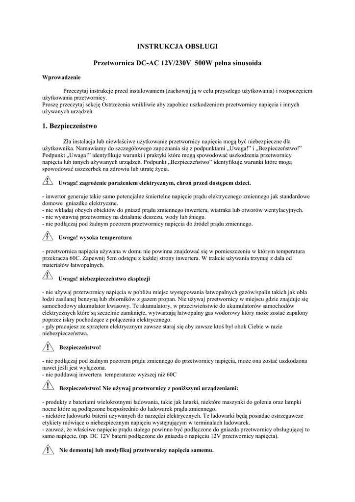 INSTRUKCJA OBSŁUGI Przetwornica DC-AC 12V/230V 500W pełna sinusoida Wprowadzenie Przeczytaj instrukcje przed instalowaniem (zachowaj ją w celu przyszłego uŜytkowania) i rozpoczęciem uŜytkowania przetwornicy. Proszę przeczytaj sekcję OstrzeŜenia wnikliwie aby zapobiec uszkodzeniom przetwornicy napięcia i innych uŜywanych urządzeń. 1. Bezpieczeństwo Zła instalacja lub niewłaściwe uŜytkowanie przetwornicy napięcia mogą być niebezpieczne dla uŜytkownika. Namawiamy do szczegółowego zapoznania się z podpunktami „Uwaga!” i „Bezpieczeństwo!” Podpunkt „Uwaga!” identyfikuje warunki i praktyki które mogą spowodować uszkodzenia przetwornicy napięcia lub innych uŜywanych urządzeń. Podpunkt „Bezpieczeństwo” identyfikuje warunki które mogą spowodować uszczerbek na zdrowiu lub utratę Ŝycia. Uwaga! zagroŜenie poraŜeniem elektrycznym, chroń przed dostępem dzieci. - inwertor generuje takie samo potencjalne śmiertelne napięcie prądu elektrycznego zmiennego jak standardowe domowe gniazdko elektryczne. - nie wkładaj obcych obiektów do gniazd prądu zmiennego inwertera, wiatraka lub otworów wentylacyjnych. - nie wystawiaj przetwornicy na działanie deszczu, wody lub śniegu. - nie podłączaj pod Ŝadnym pozorem przetwornicy napięcia do źródeł prądu zmiennego. Uwaga! wysoka temperatura - przetwornica napięcia uŜywana w domu nie powinna znajdować się w pomieszczeniu w którym temperatura przekracza 60C. Zapewnij 5cm odstępu z kaŜdej strony inwertera. W trakcie uŜywania trzymaj z dala od materiałów łatwopalnych. Uwaga! niebezpieczeństwo eksplozji - nie uŜywaj przetwornicy napięcia w pobliŜu miejsc występowania łatwopalnych gazów/spalin takich jak obła łodzi zasilanej benzyną lub zbiorników z gazem propan. Nie uŜywaj przetwornicy w miejscu gdzie znajduje się samochodowy akumulator kwasowy. Te akumulatory, w przeciwieństwie do akumulatorów samochodów elektrycznych które są szczelnie zamknięte, wytwarzają łatwopalny gas wodorowy który moŜe zostać zapalony poprzez iskry pochodzące z połączenia elektrycznego. - gdy pracujesz ze sprzętem elektrycznym zawsze staraj się aby zawsze ktoś był obok Ciebie w razie niebezpieczeństwa. Bezpieczeństwo! - nie podłączaj pod Ŝadnym pozorem prądu zmiennego do przetwornicy napięcia, moŜe ona zostać uszkodzona nawet jeśli jest wyłączona. - nie poddawaj inwertera temperaturze wyŜszej niŜ 60C Bezpieczeństwo! Nie uŜywaj przetwornicy z poniŜszymi urządzeniami: - produkty z bateriami wielokrotnymi ładowania, takie jak latarki, niektóre maszynki do golenia oraz lampki nocne które są podłączone bezpośrednio do ładowarek prądu zmiennego. - niektóre ładowarki baterii uŜywanych do narzędzi elektrycznych. Te ładowarki będą posiadać ostrzegawcze etykiety mówiące o niebezpiecznym napięciu występującym w terminalach ładowarek. - zauwaŜ, Ŝe właściwe napięcie prądu stałego powinno być podłączone do gniazda przetwornicy obsługującej to samo napięcie, (np. DC 12V baterii podłączone do gniazda o napięciu 12V przetwornicy napięcia). Nie demontuj lub modyfikuj przetwornicy napięcia samemu. 2. Zabezpieczenia - zabezpieczenia wyjść: zabezpieczenia przed odwrotną biegunowością (przepalony bezpiecznik), zbyt wysokim/niskim napięciem, rozładowaną baterią, wyłączeniem się urządzenia. - zabezpieczenia wejść: przed krótkim spięciem, przeciąŜeniem i przegrzaniem. - włączenie/wyłączenie zasilania za pomocą przycisku i sygnalizowane zapaleniem się diody. - wejścia i wyjścia w pełni zaizolowane. - mniejsze zuŜycie mocy w stanie wstrzymania. - spełnia wymagania LVD przy EN60950 i e8 - spełnia wymagania EMC przy EN61000-6-3, EN55022 3. UŜytkowanie Jeśli chcesz bezpiecznie uŜytkować i w pełni wykorzystać moŜliwości przetwornicy napięcia uŜywaj ją stosując się do poniŜszych zasad: - w suchych miejscach, z dala od źródeł wody. - w pomieszczeniach w których temperatura wacha się pomiędzy 0C – 40C. Z dala od miejsc i urządzeń o podwyŜszonej temperaturze. - w pomieszczeniach o właściwej cyrkulacji powietrza zachowując odstęp 5cm z kaŜdej strony urządzenia. - dbaj o czystość przetwornicy staraj się aby była wolna od wszelakich zabrudzeń. 4. Zasady pracy urządzenia Przetwornica napięcia pracuje w dwóch fazach. Podczas pierwszej fazy (DC – DC) przetwornica moŜe zwiększyć poziom napięcia wejściowego DC (np. z 12V baterii) do napięcia wyjściowego DC 230V. Druga faza polega na zmianie wysokiego napięcia DC na napięcie AC Tobie potrzebne, przy zastosowaniu zaawansowanych tranzystorów mocy MOSFET lub technologii IGBT. W rezultacie przetwornica radzi sobie nawet z urządzeniami wymagającymi nietypowego napięcia. 5. Instrukcja obsługi przycisków 1. przycisk włączenia/wyłączenia zasilania przetwornicy napięcia. 2. dioda która po włączeniu przetwornicy napięcia zapali się co oznacza, ze urządzenie jest gotowe do uŜytku. 3. dioda przeciąŜenia, jeśli się zapali, oznacza to Ŝe przetwornica napięcia przeszła w tryb bezpieczeństwa, i naleŜy ją jak najszybciej wyłączyć. 4. wyjście AC. 5+, 5-. zaciski podłączenia baterii. Podłącz przetwornice napięcia do baterii, uŜywając załączonych kabli, zwróć uwagę na polaryzację przy podłączeniu krokodylków do urządzenia. Czerwony terminal jest dodatni (5+), a czarny ujemny (5-) 6. wentylator chłodzi urządzenie w trakcie jego pracy. 7. kable połączeniowe, słuŜą do połączenia baterii z przetwornicą napięcia. 6. Zasilanie Źródło zasilania musi być w stanie zapewnić od 10.5V do 15V i wystarczająca ilość stałych wyjść aby urządzenie poprawnie działało. Źródłem prądu moŜe być bateria lub zasilacz DC. Aby określić ilość potrzebnego prądu (w A), podziel odpowiednią ilość wyjść (w V) uŜywanych urządzeń przez uŜywane napięcie, (12V w przypadku akumulatora samochodowego). 7 P