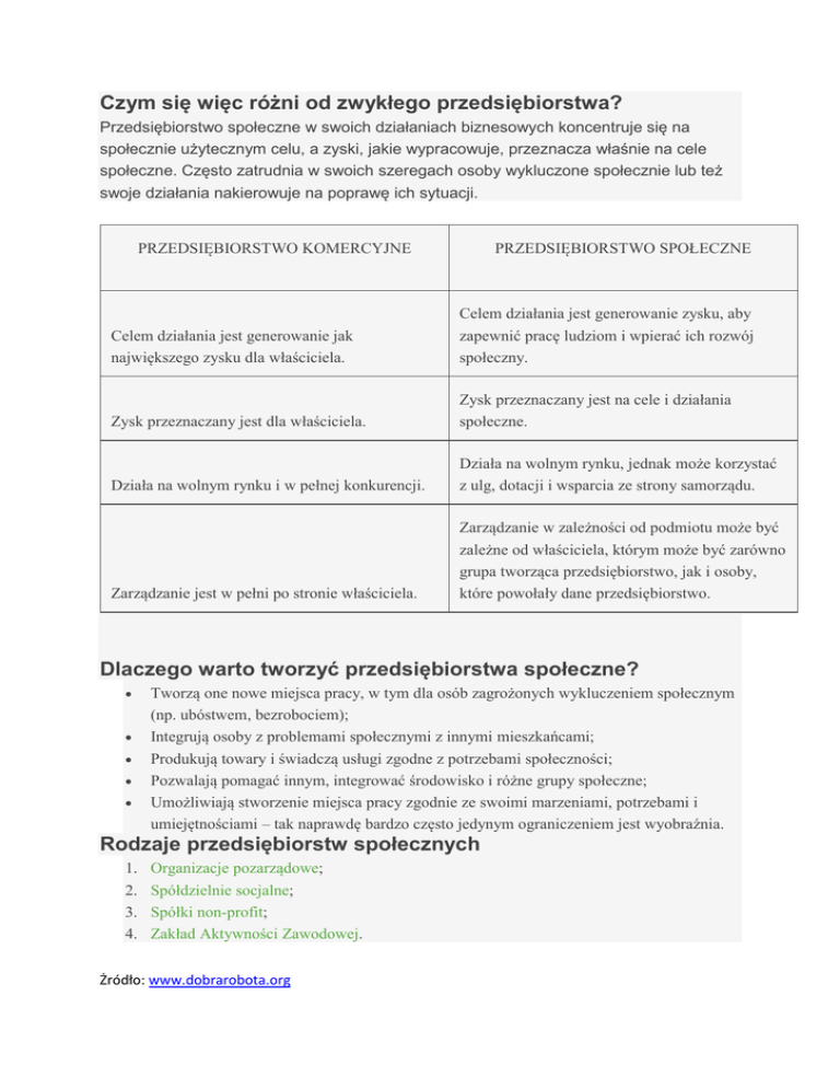 Czym się więc różni od zwykłego przedsiębiorstwa? Przedsiębiorstwo społeczne w swoich działaniach biznesowych koncentruje się na społecznie użytecznym celu, a zyski, jakie wypracowuje, przeznacza właśnie na cele społeczne. Często zatrudnia w swoich szeregach osoby wykluczone społecznie lub też swoje działania nakierowuje na poprawę ich sytuacji. PRZEDSIĘBIORSTWO KOMERCYJNE PRZEDSIĘBIORSTWO SPOŁECZNE Celem działania jest generowanie jak największego zysku dla właściciela. Celem działania jest generowanie zysku, aby zapewnić pracę ludziom i wpierać ich rozwój społeczny. Zysk przeznaczany jest dla właściciela. Zysk przeznaczany jest na cele i działania społeczne. Działa na wolnym rynku i w pełnej konkurencji. Działa na wolnym rynku, jednak może korzystać z ulg, dotacji i wsparcia ze strony samorządu. Zarządzanie jest w pełni po stronie właściciela. Zarządzanie w zależności od podmiotu może być zależne od właściciela, którym może być zarówno grupa tworząca przedsiębiorstwo, jak i osoby, które powołały dane przedsiębiorstwo. Dlaczego warto tworzyć przedsiębiorstwa społeczne? Tworzą one nowe miejsca pracy, w tym dla osób zagrożonych wykluczeniem społecznym (np. ubóstwem, bezrobociem); Integrują osoby z problemami społecznymi z innymi mieszkańcami; Produkują towary i świadczą usługi zgodne z potrzebami społeczności; Pozwalają pomagać innym, integrować środowisko i różne grupy społeczne; Umożliwiają stworzenie miejsca pracy zgodnie ze swoimi marzeniami, potrzebami i umiejętnościami – tak naprawdę bardzo często jedynym ograniczeniem jest wyobraźnia. Rodzaje przedsiębiorstw społecznych 1. 2. 3. 4. Organizacje pozarządowe; Spółdzielnie socjalne; Spółki non-profit; Zakład Aktywności Zawodowej. Żródło: www.dobrarobota.org