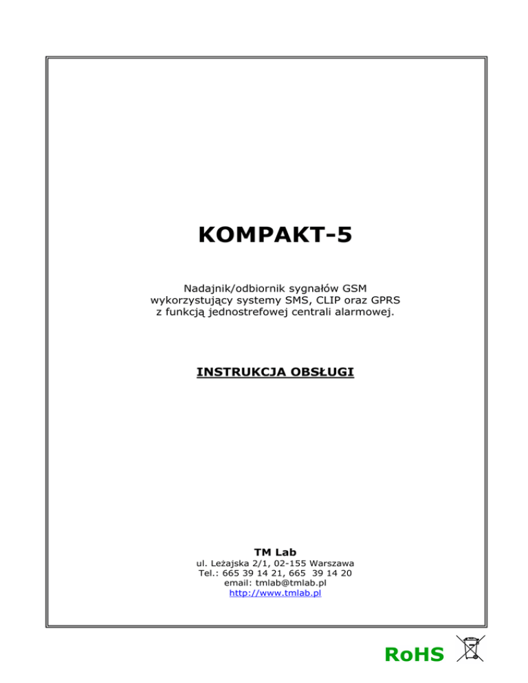 KOMPAKT-5 Nadajnik/odbiornik sygnałów GSM wykorzystujący systemy SMS, CLIP oraz GPRS z funkcją jednostrefowej centrali alarmowej. INSTRUKCJA OBSŁUGI TM Lab ul. LeŜajska 2/1, 02-155 Warszawa Tel.: 665 39 14 21, 665 39 14 20 email: [email protected] http://www.tmlab.pl KOMPAKT-5 HISTORIA Wersja dokumentu 1.0 1.1 Data publikacji 2007-04-22 2007-08-01 1.2 1.3 1.4 2007-12-28 2008-01-01 2008-11-18 Opis Przeniesienie opisu aplikacji TMProg-2 do interaktywnej pomocy w samym programie. Uzupełnienia opisu dodatkowych funkcji (Firmware 11) Uaktualnienia 1 KOMPAKT-5 Spis treści: 1. Informacje ogólne ..............................................................................3 1.1. Wstęp .........................................................................................3 1.2. Charakterystyka ogólna .................................................................3 1.3. Zastosowania ...............................................................................3 1.4. Warunki eksploatacyjne.................................................................4 2. Budowa urządzenia ............................................................................4 2.1. Wejścia modułu ............................................................................5 2.2. Funkcje wyjść / podłączanie urządzeń zewnętrznych .........................5 2.3. Kontrola napięcia akumulatora .......................................................5 2.4. Wejście TEST ...............................................................................5 2.5. Układ autonomicznego RESETU ......................................................6 2.6. Tryb SMS.....................................................................................6 2.7. Tryb CLIP ....................................................................................6 2.8. Tryb GRPS ...................................................................................6 3. Sygnalizacja stanu pracy .....................................................................7 4. Funkcja centrali alarmowej ..................................................................8 5. SMSy sterujące ..................................................................................9 6. Uruchamianie nadajnika .................................................................... 10 6.1. Programowanie ( konfiguracja ) nadajnika ..................................... 10 6.2. MontaŜ ...................................................................................... 10 7. Aplikacja programująca TM Prog2....................................................... 11 7.1. Okno główne................................................................................. 11 7.2. Zakładka: Wejścia + SMS/CLIP (Baza) .......................................... 12 7.3. Zakładka: SMS/CLIP ( PRYWATNE ) ............................................. 13 7.4. Zakładka: PARAMETY .................................................................. 14 7.5. Zakładka: GPRS ......................................................................... 16 7.6. Zakładka: Centralka + WYJŚCIA ................................................... 17 7.7. Zakładka: OPISY DODATKOWE..................................................... 18 7.8. Okno HISTORIA.......................................................................... 19 7.9. Okno MONITOR .......................................................................... 20 7.10. Okno Firmware........................................................................... 21 8. Dodatki ........................................................................................... 22 8.1. Najczęściej zadawane pytania ...................................................... 22 2 KOMPAKT-5 1. Informacje ogólne 1.1. Wstęp Niniejszy dokument zawiera opis nadajnika Kompakt-5 oraz instrukcję jego konfiguracji, montaŜu i uŜytkowania. Nadajnik do przekazywania informacji (transmisji danych) wykorzystuje sieć GSM. Firma TM Lab nie ponosi odpowiedzialności za działanie operatorów sieci komórkowych GSM. Reklamacje związane z niepoprawnym działaniem systemu monitorowania, a wynikające ze złego działania sieci, systemu lub infrastruktury operatora GSM naleŜy wyjaśniać z operatorem. 1.2. Charakterystyka ogólna Nadajnik KOMPAKT-5: • • • • • • • • • • 5 linii uniwersalnych konfigurowalnego typu NC lub NO w tym dwa z nich mogące pracować jako wejścia analogowe ( pomiar napięcia ) jedno wejście do pomiaru napięcia AC 3 wejścia logiczne: „stan akumulatora”, poziom zasięgu GSM oraz „TEST” 1 wyjście przekaźnikowe ( 5A, max 30V ) jednostrefowa centrala alarmowa zegar czasu rzeczywistego z baterią podtrzymującą. rozszerzona sygnalizacja stanu modułu na 6-ściu diodach LED układ autonomicznego RESETU (z detekcją nagłych spadków napięć) bufor zdarzeń pamiętający 200 akcji moŜliwość aktualizacji oprogramowania (firmwaru) urządzenia 1.3. Zastosowania • • • • • • • Transmisja sygnałów alarmowych przez sieć GSM Współpraca z obiektowymi urządzeniami alarmowymi Praca jako samodzielny jednostrefowy system alarmowy Ochrona obiektów Nadzór pracy maszyn Zdalne sterowanie przy pomocy SMSów Śledzenie/monitorowanie wartości napięć 3 KOMPAKT-5 1.4. Warunki eksploatacyjne • • • • 2. Temperatura pracy od -20°C do +50°C Wilgotność otoczenia do 80% (bez kondensacji pary wodnej) Napięcie zasilania 10V-14V DC Praca w miejscu pokrytym zasięgiem wybranego operatora sieci GSM. Budowa urządzenia W skład kompletnego urządzenia wchodzą: • Nadajnik w plastikowej obudowie z telefonem Simcom 300C • kabel/rozgałęziacz umoŜliwiający podłączenie do akumulatora z jednoczesną moŜliwością dalszego zasilenia na przykład centrali alarmowej • antena 3dB • uchwyt z plastrem samoprzylepnym oraz opaska umoŜliwiający przymocowanie anteny do płaskiej i gładkiej powierzchni • płyta CD 