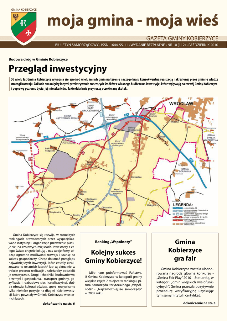 BIULETYN BIULETYN SAMORZĄDOWY SAMORZĄDOWY • ISSN:• ISSN: 1644-55-11 1644-55-11 • WYDANIE • WYDANIE BEZPŁATNE BEZPŁATNE • NR 10 • NR (112) 6 (96) • PAŹDZIERNIK • CZERWIEC 2009 2010 Budowa dróg w Gminie Kobierzyce Przegląd inwestycyjny Od wielu lat Gmina Kobierzyce wyróżnia się spośród wielu innych gmin na terenie naszego kraju konsekwentną realizacją nakreślonej przez gminne władze strategii rozwoju. Zakłada ona między innymi przekazywanie znaczących środków z własnego budżetu na inwestycje, które wpływają na rozwój Gminy Kobierzyce i poprawę poziomu życia jej mieszkańców. Takie działania przynoszą oczekiwany skutek. Gmina Kobierzyce się rozwija, w rozmaitych rankingach prowadzonych przez wyspecjalizowane instytucje i organizacje przeważnie plasuje się na czołowych miejscach. Inwestorzy z całego świata chętnie lokują u nas swoje firmy, widząc ogromne możliwości rozwoju i szansę na sukces gospodarczy. Chcąc dokonać przeglądu najważniejszych inwestycji, które zostały zrealizowane w ostatnich latach/ lub są aktualnie w trakcie procesu realizacji/ , należałoby podzielić je tematycznie. Drogi i chodniki, budownictwo, przemysł i gospodarka, transport gminny, gazyfikacja i rozbudowa sieci kanalizacyjnej, służba zdrowia, kultura i oświata, sport i rozrywka- to tylko niektóre pozycje na długiej liście inwestycji, które powstały w Gminie Kobierzyce w ostatnich latach. dokończenie na str. 6 Ranking „Wspólnoty” Kolejny sukces Gminy Kobierzyce! Miło nam poinformować Państwa, iż Gmina Kobierzyce w kategorii gminy wiejskie zajęła 7 miejsce w rankingu, pisma samorządu terytorialnego „Wspólnota” - „Najzamożniejsze samorządy” w 2009 roku. Gmina Kobierzyce gra fair Gmina Kobierzyce została uhonorowana nagrodą główną konkursu „Gmina Fair Play” 2010 – Statuetką, w kategorii „gmin wiejskich wielofunkcyjnych”. Gmina przeszła pozytywnie procedurę weryfikacyjną uzyskując tym samym tytuł i certyfikat. dokończenie na str. 3 informacje gminne moja gmina - moja wieś ŚWIADCZENIA RODZINNE 2010 r. Gminny Ośrodek Pomocy Społecznej w Kobierzycach informuje, iż od dnia 01.09.2010 r. rozpoczyna się przyjmowanie wniosków o ustalenie prawa do zasiłku rodzinnego oraz dodatków do zasiłku rodzinnego na okres zasiłkowy 2010/2011. Osoby zainteresowane prosimy o zgłaszanie się do tut. Ośrodka pokój nr 10 celem pobrania odpowiednich wniosków oraz uzyskania szczegółowych informacji. Informacje można również uzyskać pod nr tel. (71) 36 98 014 lub (71) 36 98 015. Pani Wiesławie Sucheckiej wyrazy głębokiego współczucia z powodu śmierci Ojca składają Ryszard Pacholik Wójt Gminy Kobierzyce wraz z pracownikami Urzędu Gminy Kobierzyce Radni i Przyjaciele z Gminy Kobierzyce Stowarzyszenie ,,Strefa Zdrowia” serdecznie zaprasza na Olimpiadę Rekreacyjną dla rodzin dnia 02.10.2010 r. od godz. 13.00. Impreza odbywa się w świetlicy w Pustkowie Żurawskim i na boisku wiejskim. W programie przewidziane są liczne gry i konkursy dla dzieci i ich rodziców. Poza tym rodzice ze swoimi pociechami będą mogli pobawić się na sportowo. Czekamy na wszystkie dzieci oraz dorosłych w pierwszą sobotę października. Do zobaczenia!!! Kierownik referatu Zastępca kierownika Komunikacja zbiorowa, interwencje Referat Środków Zewnętrznych i zamówień publicznych 2 Ogłoszenia drobne Zapraszamy do salonu optycznego w Kobierzycach przy ul. Spółdzielczej 4, tel. 508-327-187. Profesjonalne usługi elektryczne: instalacje, pomiary, odbiory itp. tel. 783-710-510. Sprzedam mieszkanie 38 m2. w Oławie. Stan bardzo dobry. tel. 71/390-87-21, 502-67-89-11. Sprzedam wózek dziecięcy 3 – funkcyjny w dobrym stanie. Tel. 661-082-466. Hurtownia materiałów budowlanych Cieszyce, ul. Kasztanowa 20a tel. 71/39-08-910. Sprzedam dom w Wierzbicach wraz z działką 17 arów. Telefon 71 390-89-14. Świat paneli Perfect, Wrocław ul. Braterska 6, tel. 71/790-11-95. Cyklinowanie, lakierowanie, szpachlowanie, układanie parkietu, tel. 692-109-308. Naprawa skuterów i motorowerów Cieszyce ul. Słoneczna 17, tel. 605-101-121 Projekty, nadzory sieci i przyłączy wod-kan,deszcz.,gazowych oraz przepustów-517 500 135 Montaż i serwis anten sat i rtv, domofony, alarmy, telewizja przemysłowa tel. 794 173 076 Salon finansowy przy ul. Spółdzielczej 1 w Kobierzycach, oferta wielu banków – 500100148 Ubezpieczenia Multi Stanisław Dawiec. Stacja paliw Kobierzyce. Tel. 606-131-508. Sprzedam działkę przemysłową w Wierzbicach przy Leoni Kabel pow. 40 a. tel. 696894171. Sprzedam dom wraz z budynkiem gospodarczym w Dziadowej Kłodzie, tel. 696-894-171. Sprzedam Opla Vectrę hatchbag 1996, 2.5l. 200 km, wszystkie dodatki, 6.200 zł. 696894171 Certyfikaty, świadectwa charakterystyki energetycznej. Szybko i niedrogo. Tel. 605112278 Świadectwa charakterystyki energetycznej budynków - Gmina Kobierzyce. Tel.609-653-008 Sprzedam pół domu w Wierzbicach. Dom po remoncie pow. 101 m2. tel. 509-909-383. Wynajmę mieszkanie 2-pokojowe umeblowane w Wierzbicach pow. 60 m2. tel. 509-909-383. Sprzedam bliźniaka w Pełczycach, pod działalność gosp. - punkt przedszkolny. 509-909-383. Sprzedam nowy dom w Pełczycach. Tel. 500-57-69-75. zdjęcia na www.autogielda.pl Zaopiekuję się dzieckiem w pt. i sob. wieczory. Opieka w domu opiekunki. tel. 500-57-69-75 Zapraszam do butiku Le-BonBon w Kobierzycach ul. Robotnicza 6. Kolekcja z Włoch. informacje gminne Kolejne sukcesy Gmina Kobierzyce gra fair Miło nam poinformować Państwa, że Gmina Kobierzyce została uhonorowana nagrodą główną konkursu - „ Gmina Fair Play” 2010 – Statuetką, w kategorii „gmin wiejskich wielofunkcyjnych”. Gmina przeszła pozytywnie procedurę weryfikacyjną uzyskując tym samym tytuł i certyfikat. Wyniki konkursu zostały oficjalnie ogłoszone 28 września 2010 podczas specjalnej konferencji prasowej, w której wziął udział Wójt Gminy Kobie