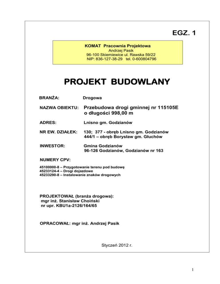 EGZ. 1 KOMAT Pracownia Projektowa Andrzej Pasik 96-100 Skierniewice ul. Rawska 59/22 NIP: 836-127-38-29 tel. 0-600804796 PROJEKT BUDOWLANY BRANŻA: Drogowa NAZWA OBIEKTU: Przebudowa drogi gminnej nr 115105E o długości 998,00 m ADRES: Lnisno gm. Godzianów NR EW. DZIAŁEK: 130; 377 - obręb Lnisno gm. Godzianów 444/1 – obręb Borysław gm. Głuchów INWESTOR: Gmina Godzianów 96-126 Godzianów, Godzianów nr 163 NUMERY CPV: 45100000-8 – Przygotowanie terenu pod budowę 45233124-4 – Drogi dojazdowe 45233290-8 – Instalowanie znaków drogowych PROJEKTOWAŁ (branża drogowa): mgr inż. Stanisław Choiński nr upr. KBU1a-2126/164/65 OPRACOWAŁ: mgr inż. Andrzej Pasik Styczeń 2012 r. 1 SPIS ZAWARTOŚCI PROJEKTU 1. Strona tytułowa – str. 1. 2. Spis zawartości projektu – str. 2. 3. Opis techniczny – str. 3 - 6. 4. Zestawienie badań geotechnicznych gruntu - str. 7 - 8 5. Informacja z zakresu bezpieczeństwa i ochrony zdrowia – str. 9 – 12. 6. Orientacja – rys. nr 1 – str. 13. 7. Projekt zagospodarowania terenu - rys. nr 2 – str. 14. 8. Plan sytuacyjny - rys. nr 3 – str. 15. 9. Profil podłużny – rys. nr 4 – str. 16. 10. Przekrój konstrukcyjny jezdni drogi – rys. nr 5 – str. 17. 11. Przepusty pod jezdnią drogi gminnej – rys. nr 6 – str. 18. 12. Uprawnienia budowlane mgr inż. Stanisława Choińskiego – str. 19. 13. Zaświadczenie o przynależności do Mazowieckiej Okręgowej Izby Inżynierów Budownictwa – str. 20. 2 OPIS TECHNICZNY 1. Przedmiot inwestycji Przedmiotem inwestycji jest przebudowa drogi gminnej relacji Byczki – Lnisno o długości 998,00 m wraz z włączeniem do drogi powiatowej nr 1303E, w miejscowości Lnisno w gminie Godzianów. Projekt opracowano na zlecenie Gminy Godzianów. 2. Materiały wyjściowe do projektu - mapa do celów projektowych w skali 1:1000, nr ew. mapy 988-22/2011 z 11.01.2012r., - Rozporządzenie Ministra Transportu i Gospodarki Morskiej z dnia 2 marca 1999r w sprawie warunków technicznych, jakim powinny odpowiadać drogi publiczne i ich usytuowanie (Dz.U. nr43/99 poz.430), - badania istniejącej nawierzchni i badania geotechniczne gruntów, - uzupełniające pomiary wysokościowe. 3. Opis stanu istniejącego zagospodarowania terenu Przedmiotowa droga leży w miejscowości Lnisno w gminie Godzianów. Droga jest drogą gminną. Odcinek drogi będący przedmiotem niniejszego opracowania znajduje się na terenie zabudowy. Droga zabezpiecza dojazd do miejscowości Lnisno, do gospodarstw i gruntów rolnych oraz łączy miejscowości Byczki i Lnisno. Odcinek drogi będący przedmiotem niniejszego projektu położony jest na działce nr 130 w obr. Lnisno 628, oraz włączony jest do drogi powiatowej nr 1303E na działce nr 444/1 w obr. Borysław gm. Głuchów. Przedmiotowa droga włącza się też do istniejącej drogi gminnej na działce nr 377. Szerokość pasa drogowego wynosi ok. 6,0 m. Orientacyjne położenie drogi na terenie gminy pokazano na rysunku nr 1. Droga wyposażona jest w: - jezdnię, o nawierzchni asfaltowej i szerokości 4,0 m - 4,5 m, - pobocza gruntowe. Pod drogą gminną istnieje 6 przepustów z rur betonowych i z tworzyw sztucznych, o średnicach od 30 cm do 45 cm. Na włączeniu drogi gminnej do drogi powiatowej istnieje przepust. Jest on zasypany i częściowo zniszczony. Wszystkie te przepusty wymagają remontu-odtworzenia. Istniejąca nawierzchnia asfaltowa ma bardzo liczne spękania siatkowe oraz miejscowe ubytki nawierzchni. W pasie drogowym przedmiotowego odcinka drogi istnieją media infrastruktury technicznej: - wodociąg, - kable telefoniczne i przyłącza telefoniczne kablowe, - słupy i przewody elektryczne naziemne, - kable elektryczne doziemne. 4. Opis stanu projektowanego 4.1. Opis stanu projektowanego drogi Droga gminna na działce nr 130 wraz z włączeniem do drogi powiatowej nr 1303E na działce nr 444/1 i włączeniem drogi gminnej na działce nr 377 ulega przebudowie. Przebudowa drogi wykonana będzie w granicach pasów drogowych dróg gminnych i drogi powiatowej. Przebudowa drogi polega na: - wykonaniu nowej nawierzchni asfaltowej, o szerokości 4,50 m i długości 998,00 m 3 (licząc od początku robót do końca robót przy drodze powiatowej wraz z długością odcinka drogi gminnej na działce nr 377), - remoncie istniejących przepustów pod drogą gminną, - wykonaniu obustronnych poboczy gruntowych. Remont przepustu na włączeniu drogi gminnej do drogi powiatowej jest przedmiotem oddzielnej dokumentacji technicznej. Nawierzchnia asfaltowa, przepusty i pobocza gruntowe będą wykonane (zlokalizowane) w granicach pasa drogowego drogi gminnej. Ze względu na wąski pas drogowy, w drodze nie będą wykonane rowy odwadniające. Projekt zagospodarowania terenu pokazano na rysunku nr 2. 4.2. Parametry geometryczne projektowanej drogi Dla określenia parametrów geometrycznych jezdni drogi przyjęto prędkość projektową V = 30 km/h, tj: jak dla drogi klasy D (dojazdowa). Odcinek drogi będący przedmiotem niniejszego opracowania znajduje się na terenie zabudowy Oś jezdni rozpięta jest między wierzchołkami od W1 do W16, których lokalizację i współrzędne geodezyjne pokazano na rysunku nr 3. Współrzędne geodezyjne wierzchołków określono poprzez odczyt z mapy numerycznej. Szerokość jezdni wynosi 4,50 m. Oś jezdni składa się z 8 łuków poziomych o wartości promienia od R=155,0 m do R=600,0 m, i 15 odcinków prostych. Tak duża liczba łuków i odcinków prostych wynika z obecnego, krętego przebiegu granic pasa drogowego oraz jego małej szerokości. Warunek ograniczenia przebudowy drogi (w tym i poboczy gruntowych) do granic pasa drogowego wpływa więc na krętość projektowanej jezdni drogi. Parametry geometryczne osi jezdni drogi pokazano na rysunku nr 3. 4.3. Posadowienie wysokościowe nawierzchni i spadki Posadowienie wysokościowe nawierzchni jezdni zaprojektowano przy uwzględnieniu: - wykorzystania istniejącej nawierzchni asfaltowej na podbu