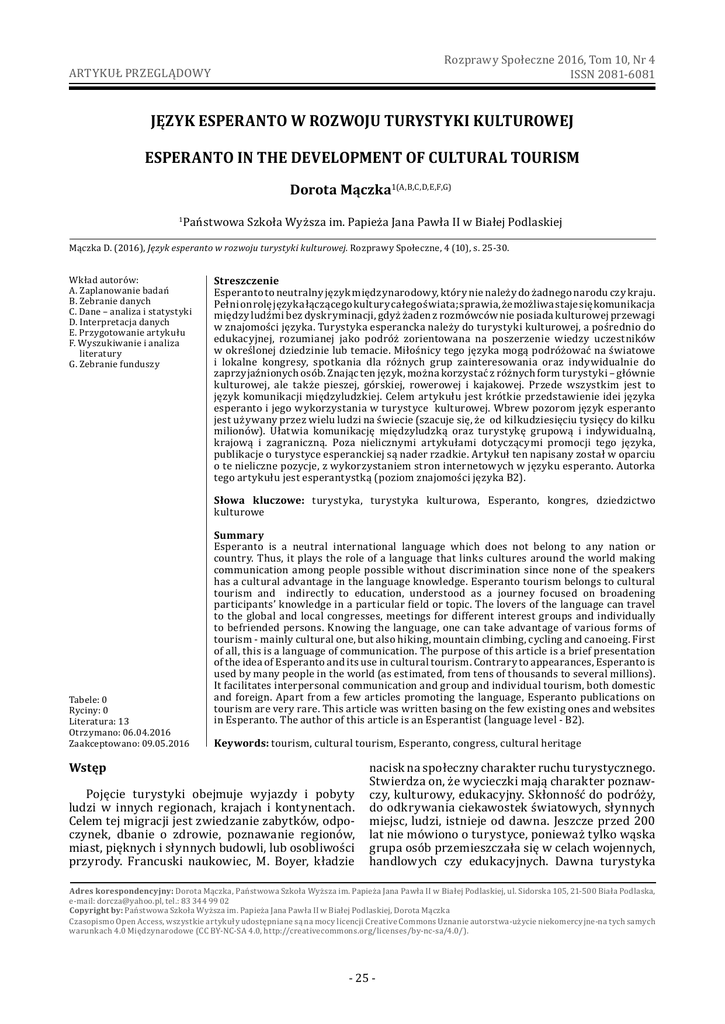 Rozprawy Społeczne 2016, Tom 10, Nr 4 ISSN 2081-6081 ARTYKUŁ PRZEGLĄDOWY JĘZYK ESPERANTO W ROZWOJU TURYSTYKI KULTUROWEJ ESPERANTO IN THE DEVELOPMENT OF CULTURAL TOURISM Dorota Mączka1(A,B,C,D,E,F,G) 1 Państwowa Szkoła Wyższa im. Papieża Jana Pawła II w Białej Podlaskiej Mączka D. (2016), Język esperanto w rozwoju turystyki kulturowej. Rozprawy Społeczne, 4 (10), s. 25-30. Wkład autorów: A. Zaplanowanie badań B. Zebranie danych C. Dane – analiza i statystyki D. Interpretacja danych E. Przygotowanie artykułu F. Wyszukiwanie i analiza literatury G. Zebranie funduszy Streszczenie Esperanto to neutralny język międzynarodowy, który nie należy do żadnego narodu czy kraju. Pełni on rolę języka łączącego kultury całego świata; sprawia, że możliwa staje się komunikacja między ludźmi bez dyskryminacji, gdyż żaden z rozmówców nie posiada kulturowej przewagi w znajomości języka. Turystyka esperancka należy do turystyki kulturowej, a pośrednio do edukacyjnej, rozumianej jako podróż zorientowana na poszerzenie wiedzy uczestników w określonej dziedzinie lub temacie. Miłośnicy tego języka mogą podróżować na światowe i lokalne kongresy, spotkania dla różnych grup zainteresowania oraz indywidualnie do zaprzyjaźnionych osób. Znając ten język, można korzystać z różnych form turystyki – głównie kulturowej, ale także pieszej, górskiej, rowerowej i kajakowej. Przede wszystkim jest to język komunikacji międzyludzkiej. Celem artykułu jest krótkie przedstawienie idei języka esperanto i jego wykorzystania w turystyce kulturowej. Wbrew pozorom język esperanto jest używany przez wielu ludzi na świecie (szacuje się, że od kilkudziesięciu tysięcy do kilku milionów). Ułatwia komunikację międzyludzką oraz turystykę grupową i indywidualną, krajową i zagraniczną. Poza nielicznymi artykułami dotyczącymi promocji tego języka, publikacje o turystyce esperanckiej są nader rzadkie. Artykuł ten napisany został w oparciu o te nieliczne pozycje, z wykorzystaniem stron internetowych w języku esperanto. Autorka tego artykułu jest esperantystką (poziom znajomości języka B2). Słowa kluczowe: turystyka, turystyka kulturowa, Esperanto, kongres, dziedzictwo kulturowe Tabele: 0 Ryciny: 0 Literatura: 13 Otrzymano: 06.04.2016 Zaakceptowano: 09.05.2016 Wstęp Summary Esperanto is a neutral international language which does not belong to any nation or country. Thus, it plays the role of a language that links cultures around the world making communication among people possible without discrimination since none of the speakers has a cultural advantage in the language knowledge. Esperanto tourism belongs to cultural tourism and indirectly to education, understood as a journey focused on broadening participants’ knowledge in a particular field or topic. The lovers of the language can travel to the global and local congresses, meetings for different interest groups and individually to befriended persons. Knowing the language, one can take advantage of various forms of tourism - mainly cultural one, but also hiking, mountain climbing, cycling and canoeing. First of all, this is a language of communication. The purpose of this article is a brief presentation of the idea of Esperanto and its use in cultural tourism. Contrary to appearances, Esperanto is used by many people in the world (as estimated, from tens of thousands to several millions). It facilitates interpersonal communication and group and individual tourism, both domestic and foreign. Apart from a few articles promoting the language, Esperanto publications on tourism are very rare. This article was written basing on the few existing ones and websites in Esperanto. The author of this article is an Esperantist (language level - B2). Keywords: tourism, cultural tourism, Esperanto, congress, cultural heritage Pojęcie turystyki obejmuje wyjazdy i pobyty ludzi w innych regionach, krajach i kontynentach. Celem tej migracji jest zwiedzanie zabytków, odpoczynek, dbanie o zdrowie, poznawanie regionów, miast, pięknych i słynnych budowli, lub osobliwości przyrody. Francuski naukowiec, M. Boyer, kładzie nacisk na społeczny charakter ruchu turystycznego. Stwierdza on, że wycieczki mają charakter poznawczy, kulturowy, edukacyjny. Skłonność do podróży, do odkrywania ciekawostek światowych, słynnych miejsc, ludzi, istnieje od dawna. Jeszcze przed 200 lat nie mówiono o turystyce, ponieważ tylko wąska grupa osób przemieszczała się w celach wojennych, handlowych czy edukacyjnych. Dawna turystyka Adres korespondencyjny: Dorota Mączka, Państwowa Szkoła Wyższa im. Papieża Jana Pawła II w Białej Podlaskiej, ul. Sidorska 105, 21-500 Biała Podlaska, e-mail: [email protected], tel.: 83 344 99 02 Copyright by: Państwowa Szkoła Wyższa im. Papieża Jana Pawła II w Białej Podlaskiej, Dorota Mączka Czasopismo Open Access, wszystkie artykuły udostępniane są na mocy licencji Creative Commons Uznanie autorstwa-użycie niekomercyjne-na tych samych warunkach 4.0 Międzynarodowe (CC BY-NC-SA 4.0, http://creativecommons.org/licenses/by-nc-sa/4.0/). - 25 - Rozprawy Społeczne 2016, Tom 10, Nr 4 Język esperanto w rozwoju turystyki kulturowej związana była z tradycją młodych przedstawicieli szlachty, którzy pod koniec studiów podróżowali do stolic i głównych miast Europy, w celach nabycia doświadczenia. Później zwyczaj zaczął rozprzestrzeniać się we wszystkich bogatych klasach społecznych, a więc termin turystyka zaczął oznaczać wspólną sferę działalności człowieka. Od XIX w. turystyka rozwinęła się, stając się obecnie zjawiskiem masowym (Gawarecki 1997). Turystyka kulturowa to nowa kategoria turystyki. Jest to jeden z tych rodzajów turystyki , który w ostatnim czasie zaczął się szybko rozwijać. Świadczy o tym m.in. dokument Tourism 2020 – Vision, opracowany przez UN WTO (Światową Organizację Turystyki), prognozujący na podstawie widocz