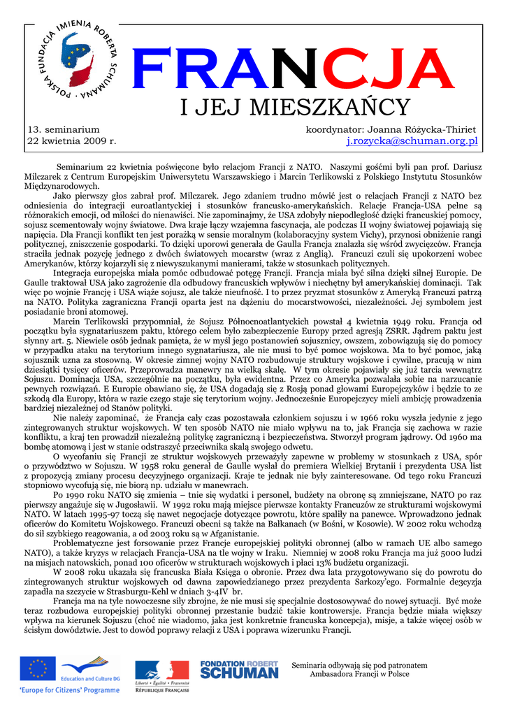 FRANCJA I JEJ MIESZKAŃCY 13. seminarium 22 kwietnia 2009 r. koordynator: Joanna Różycka-Thiriet [email protected] Seminarium 22 kwietnia poświęcone było relacjom Francji z NATO. Naszymi gośćmi byli pan prof. Dariusz Milczarek z Centrum Europejskim Uniwersytetu Warszawskiego i Marcin Terlikowski z Polskiego Instytutu Stosunków Międzynarodowych. Jako pierwszy głos zabrał prof. Milczarek. Jego zdaniem trudno mówić jest o relacjach Francji z NATO bez odniesienia do integracji euroatlantyckiej i stosunków francusko-amerykańskich. Relacje Francja-USA pełne są różnorakich emocji, od miłości do nienawiści. Nie zapominajmy, że USA zdobyły niepodległość dzięki francuskiej pomocy, sojusz scementowały wojny światowe. Dwa kraje łączy wzajemna fascynacja, ale podczas II wojny światowej pojawiają się napięcia. Dla Francji konflikt ten jest porażką w sensie moralnym (kolaboracyjny system Vichy), przynosi obniżenie rangi politycznej, zniszczenie gospodarki. To dzięki uporowi generała de Gaulla Francja znalazła się wśród zwycięzców. Francja straciła jednak pozycję jednego z dwóch światowych mocarstw (wraz z Anglią). Francuzi czuli się upokorzeni wobec Amerykanów, którzy kojarzyli się z niewyszukanymi manierami, także w stosunkach politycznych. Integracja europejska miała pomóc odbudować potęgę Francji. Francja miała być silna dzięki silnej Europie. De Gaulle traktował USA jako zagrożenie dla odbudowy francuskich wpływów i niechętny był amerykańskiej dominacji. Tak więc po wojnie Francję i USA wiąże sojusz, ale także nieufność. I to przez pryzmat stosunków z Ameryką Francuzi patrzą na NATO. Polityka zagraniczna Francji oparta jest na dążeniu do mocarstwowości, niezależności. Jej symbolem jest posiadanie broni atomowej. Marcin Terlikowski przypomniał, że Sojusz Północnoatlantyckich powstał 4 kwietnia 1949 roku. Francja od początku była sygnatariuszem paktu, którego celem było zabezpieczenie Europy przed agresją ZSRR. Jądrem paktu jest słynny art. 5. Niewiele osób jednak pamięta, że w myśl jego postanowień sojusznicy, owszem, zobowiązują się do pomocy w przypadku ataku na terytorium innego sygnatariusza, ale nie musi to być pomoc wojskowa. Ma to być pomoc, jaką sojusznik uzna za stosowną. W okresie zimnej wojny NATO rozbudowuje struktury wojskowe i cywilne, pracują w nim dziesiątki tysięcy oficerów. Przeprowadza manewry na wielką skalę. W tym okresie pojawiały się już tarcia wewnątrz Sojuszu. Dominacja USA, szczególnie na początku, była ewidentna. Przez co Ameryka pozwalała sobie na narzucanie pewnych rozwiązań. E Europie obawiano się, że USA dogadają się z Rosją ponad głowami Europejczyków i będzie to ze szkodą dla Europy, która w razie czego staje się terytorium wojny. Jednocześnie Europejczycy mieli ambicję prowadzenia bardziej niezależnej od Stanów polityki. Nie należy zapominać, że Francja cały czas pozostawała członkiem sojuszu i w 1966 roku wyszła jedynie z jego zintegrowanych struktur wojskowych. W ten sposób NATO nie miało wpływu na to, jak Francja się zachowa w razie konfliktu, a kraj ten prowadził niezależną politykę zagraniczną i bezpieczeństwa. Stworzył program jądrowy. Od 1960 ma bombę atomową i jest w stanie odstraszyć przeciwnika skalą swojego odwetu. O wycofaniu się Francji ze struktur wojskowych przeważyły zapewne w problemy w stosunkach z USA, spór o przywództwo w Sojuszu. W 1958 roku generał de Gaulle wysłał do premiera Wielkiej Brytanii i prezydenta USA list z propozycją zmiany procesu decyzyjnego organizacji. Kraje te jednak nie były zainteresowane. Od tego roku Francuzi stopniowo wycofują się, nie biorą np. udziału w manewrach. Po 1990 roku NATO się zmienia – tnie się wydatki i personel, budżety na obronę są zmniejszane, NATO po raz pierwszy angażuje się w Jugosławii. W 1992 roku mają miejsce pierwsze kontakty Francuzów ze strukturami wojskowymi NATO. W latach 1995-97 toczą się nawet negocjacje dotyczące powrotu, które spaliły na panewce. Wprowadzono jednak oficerów do Komitetu Wojskowego. Francuzi obecni są także na Bałkanach (w Bośni, w Kosowie). W 2002 roku wchodzą do sił szybkiego reagowania, a od 2003 roku są w Afganistanie. Problematyczne jest forsowanie przez Francje europejskiej polityki obronnej (albo w ramach UE albo samego NATO), a także kryzys w relacjach Francja-USA na tle wojny w Iraku. Niemniej w 2008 roku Francja ma już 5000 ludzi na misjach natowskich, ponad 100 oficerów w strukturach wojskowych i płaci 13% budżetu organizacji. W 2008 roku ukazała się francuska Biała Księga o obronie. Przez dwa lata przygotowywano się do powrotu do zintegrowanych struktur wojskowych od dawna zapowiedzianego przez prezydenta Sarkozy’ego. Formalnie de3cyzja zapadła na szczycie w Strasburgu-Kehl w dniach 3-4IV br. Francja ma na tyle nowoczesne siły zbrojne, że nie musi się specjalnie dostosowywać do nowej sytuacji. Być może teraz rozbudowa europejskiej polityki obronnej przestanie budzić takie kontrowersje. Francja będzie miała większy wpływa na kierunek Sojuszu (choć nie wiadomo, jaka jest konkretnie francuska koncepcja), misje, a także więcej osób w ścisłym dowództwie. Jest to dowód poprawy relacji z USA i poprawa wizerunku Francji. Seminaria odbywają się pod patronatem Ambasadora Francji w Polsce