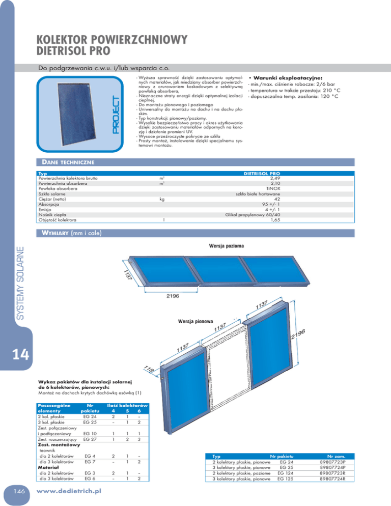 KOLEKTOR POWIERZCHNIOWY DIETRISOL PRO Do podgrzewania c.w.u. i/lub wsparcia c.o. PROJECT - Wyższa sprawność dzięki zastosowaniu optymalnych materiałów, jak miedziany absorber powierzchniowy z orurowaniem kaskadowym z selektywną powłoką absorbera, - Nieznaczne straty energii dzięki optymalnej izolacji cieplnej. - Do montażu pionowego i poziomego - Uniwersalny do montażu na dachu i na dachu płaskim. - Typ konstrukcji: pionowy/poziomy. - Wysokie bezpieczeństwo pracy i okres użytkowania dzięki zastosowaniu materiałów odpornych na korozję i działanie promieni UV. - Wysoce przeźroczyste pokrycie ze szkła - Prosty montaż, instalowanie dzięki specjalnemu systemowi montażu. DANE • Warunki eksploatacyjne: - min./max. ciśnienie robocze: 2/6 bar - temperatura w trakcie przestoju: 210 °C - dopuszczalna temp. zasilania: 120 °C TECHNICZNE Typ Powierzchnia kolektora brutto Powierzchnia absorbera Powłoka absorbera Szkło solarne Ciężar (netto) Absorpcja Emisja Nośnik ciepła Objętość kolektora DIETRISOL PRO 2,49 2,10 TiNOX szkło białe hartowane 42 95 +/- 1 4 +/- 1 Glikol propylenowy 60/40 1,65 m2 m2 kg l WYMIARY (mm i cale) 7 113 SYSTEMY SOLARNE Wersja pozioma 2196 37 11 Wersja pionowa 11 37 96 21 37 14 11 1 1 9 Wykaz pakietów dla instalacji solarnej do 6 kolektorów, pionowych: Montaż na dachach krytych dachówką esówką (1) Poszczególne Nr elementy pakietu 2 kol. płaskie EG 24 3 kol. płaskie EG 25 Zest. połączeniowy i podłączeniowy EG 10 Zest. rozszerzający EG 27 Zest. montażowy teownik dla 2 kolektorów EG 4 dla 3 kolektorów EG 7 Materiał dla 2 kolektorów EG 3 dla 3 kolektorów EG 6 146 www.dedietrich.pl Ilość kolektorów 4 5 6 2 1 – – 1 2 1 1 1 2 1 3 2 – 1 1 – 2 2 – 1 1 – 2 Typ Nr pakietu 2 kolektory płaskie, pionowe EG 24 3 kolektory płaskie, pionowe EG 25 2 kolektory płaskie, poziome EG 124 3 kolektory płaskie, pionowe EG 125 Nr zam. 89807723P 89807724P 89807723R 89807724R KOLEKTOR POWIERZCHNIOWY DIETRISOL PRO Płaskie kolektory poziome Dietrisol Pro 2 kolektory płaskie poziome Dietrisol Pro EG 124 3 kolektory płaskie poziome Dietrisol Pro EG 125 Zestawy do montażu na dach płaski Belka pozioma do 1 kol. Poziomego (2 szt.)EG 104 Regulowane rusztowanie do 1 kol. Poziomego (2 szt.) EG134 Zestaw do montażu na dach skośny Belka pozioma do 1 kolektora poziomego (2 szt.) EG 104 Materiał do dachówek ceramicznych (oprócz karpiówki i łupku) do 2 kol. EG 3 Materiał do dachówki karpiówki lub łupku do 2 kol. EG 18 Materiał do blachodachówki i blachy falistej lub trapezowej do 2 kol. EG 19 Materiał do blachy łączonej na rąbek stojący do 2 kol. EG 20 89807723R 89807724R 89807703R 89807703R 89807703R 89807702P 89807717P 89807718P 89807719P Płaskie kolektory pionowe Dietrisol Pro 2 kolektory płaskie pionowe Dietrisol Pro EG 24 3 kolektory płaskie pionowe Dietrisol Pro EG 25 89807723P 89807724P Zestawy do montażu na dach płaski Belka pozioma do 2 kolektorów (2 szt.) Regulowane rusztowanie do 2 kol. (2 szt.) Belka pozioma do 3 kolektorów (2 szt.) Regulowane rusztowanie do 3 kol. (3 szt.) EG 4 EG 5 EG 7 EG 8 89807703P 89807704P 89807706P 89807707P EG 4 EG 7 89807703P 89807706P EG 3 89807702P EG 6 89807705P EG 18 89807717P EG 21 89807720P EG 19 89807718P EG 22 89807721P EG 20 89807719P EG 23 89807722P Zestaw do montażu na dach skośny Belka pozioma do 2 kolektorów (2 szt.) Belka pozioma do 3 kolektorów (2 szt.) Materiał do dachówek ceramicznych (oprócz karpiówki i łupku) do 2 kol. Materiał do dachówek ceramicznych (oprócz karpiówki i łupku) do 3 kol. Materiał do dachówki karpiówki lub łupku do 2 kol. Materiał do dachówki karpiówki lub łupku do 3 kol. Materiał do blachodachówki i blachy falistej lub trapezowej do 2 kol. Materiał do blachodachówki i blachy falistej lub trapezowej do 3 kol. Materiał do blachy łączonej na rąbek stojący do 2 kol. Materiał do blachy łączonej na rąbek stojący do 3 kol. Zestaw połączeniowy i podłączeniowy Złączka EG 27 Zestaw połączeniowy do 2 kol. pakiet EG 27 EG 9 Nr zam. 89807726P 89807708P Grupy pompowe Flow Box (RS 25/4) Flow Box (RS 25/6) Flow Box (Top S 25/7) EC 195 EC 196 EC 197 100002281P 100002282P 100002283P Regulatory PS 5510 M PS 5511 S PS 5511 S-1 PS 5511 S-Z EC 191 EC 192 EC 193 EC 194 100002264P 100002265P 100002266P 100002267P Naczynia przeponowe Naczynie o pojemności 18 l. Naczynie o pojemności 25 l. Naczynie o pojemności 35 l. Naczynie o pojemności 50 l. Naczynie o pojemności 80 l. Naczynie o pojemności 110 l. EG 14 EG 82 EG 83 EG 84 EG 95 EG 96 89807713P 89807771P 89807772P 89807773P 89807784P 89807785P Nośnik ciepła Koncentrat płynu do instalacji solarnej – 10 l. EG 11 89807710P (Do regulacji inst. wspomagającej tylko c.w.u.) (Do reg. inst. wspomagającej tylko c.w.u. lub tylko c.o.) (Do reg. inst. wspomagającej c.w.u. i c.o. lub tylko basen (Do regulacji inst. wspomagającej c.w.u., c.o. i basen) www.dedietrich.pl SYSTEMY SOLARNE ELEMENTY SKŁADOWE INSTALACJI SOLARNYCH Z KOLEKTORAMI POWIERZCHNIOWYMI 14 147 AKCESORIA DLA INSTALACJI SOLARNYCH ZBIORCZYCH Akcesoria g³ówne dla instalacji solarnych zbiorczych REGULATORY SOLARNE PAKIET Do regulacji instalacji solarnych z 1 lub 2 polami kolektorów oraz 1 lub 2 podgrzewaczami solarnymi (w tym 1 może służyć do przestawienia strefy ogrzewania) lub 1 podgrzewaczem solarnym i 1 basenem ze sterowaniem ładowania lub rozładowania i zmianą temperatury powrotu. Dostarczany z 4 czujnikami (TC, TS, TP i TE). Wyposa¿enie dodatkowe : Zestaw 2 zaworów + czujnik do regulacji instalacji z 2 polami kolektorów wschód/zachód przy pomocy DIEMASOL C. DIEMASOL C Regulacja uniwersalna dla wszystkich typów instalacji solarnych z więcej niż 2 obiegami pierwotnymi i wtórnymi i wymiennikiem płytowym DELTASOL M EC 161 EC 432 EC 159 STACJE SOLARNE 8980F075 DKS 9-20 8980F169 8980F170A SYSTEMY SOLARNE DKC 6-30 LF 8980F169 DKCS 12-150 LF 8980F170A 14 Stacje te są wyposażone we wszystki