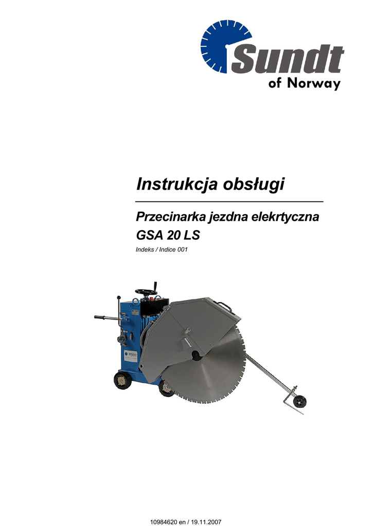 Instrukcja obsługi Przecinarka jezdna elekrtyczna GSA 20 LS Indeks / Indice 001 10984620 en / 19.11.2007 Adres producenta: Luftfiltrering Sikkerhet AS Hummefjellvien 27 NO-2550 Os I Øsrerdalen Luftfiltrering Sikkerhet AS zastrzega sobie prawo dokonywania zmian technicznych bez uprzedzenia. Copyright © 2005 Luftfiltrering Sikkerhet AS Hummefjellvien 27 NO-2550 Os I Øsrerdalen Wszystkie prawa zastrzeżone, w szczególności prawo do kopiowania i tłumaczenia. Drukowanie niniejszego podręcznika obsługi, a także jakichkolwiek jego fragmentów, jest zabronione. Żadna część podręcznika nie może być powielana lub przetwarzana przy wykorzystaniu systemów elektronicznych, ani też kopiowana lub rozprowadzana bez pisemnego pozwolenia firmy Luftfiltrering Sikkerhet AS 2 2 Przedmowa do podręcznika obsługi Niniejszy podręcznik obsługi ułatwia zaznajomienie się z maszyną i jej poprawne użytkowanie. Podręcznik zawiera istotne informacje dotyczące bezpiecznej, prawidłowej i wydajnej obsługi maszyny. Postępowanie zgodnie z zaleceniami podręcznika pomaga uniknąć niebezpieczeństwa, zaoszczędzić na kosztach naprawy, ograniczyć okresy przestoju, a także zwiększyć niezawodność maszyny i przedłużyć jej żywotność. Podręcznik obsługi musi zostać uzupełniony o instrukcję opartą na krajowych przepisach BHP i ochrony środowiska. Podręcznik obsługi musi być zawsze łatwo dostępny w miejscu użytkowania maszyny. Podręcznik musi zostać przeczytany i być używany przez każdą osobę, której zlecone będzie wykonywanie różnych zadań za pomocą maszyny, takich jak: • Obsługa, włączając w to instalację, drobne naprawy w trakcie obsługi, oraz usuwanie odpadów powstałych przy pracy, • Konserwacja, usuwanie odpadów, • Konserwacja (serwis, przegląd lub naprawa) i/lub • Transport Poza podręcznikiem i przepisami BHP obowiązującymi w kraju i miejscu użytkowania maszyny należy także przestrzegać powszechnie stosowanych zasad technicznych bezpiecznej i prawidłowej obsługi. Spis treści 1. Podstawowe zasady bezpieczeństwa 2. Opis maszyny 3. Uruchomienie maszyny 4. Transport 5. Obsługa 6. Naprawa usterek 3 1. Podstawowe zasady bezpieczeństwa 1.1 Ostrzeżenia i oznaczenia w podręczniku Niebezpieczeństwo! Ostrzega przed odniesieniem poważnych a nawet śmiertelnych obrażeń w przypadku zlekceważenia znaku. Ostrożnie! Uwaga! Ostrzega przed odniesieniem obrażeń w wypadku zlekceważenia znaku. Ostrzega przed uszkodzeniem maszyny lub innego sprzętu w wypadku zlekceważenia znaku. 1.2 Zasada planowanego użytkowania 1.2.1 Opisywana tu maszyna została skonstruowana z wykorzystaniem najnowszych technologii i w zgodzie z powszechnie uznanymi standardami bezpieczeństwa. Niemniej jednak użytkowanie maszyny może wciąż narazić użytkownika lub stronę trzecią na ryzyko obrażeń i śmierci, a maszynę i surowce na uszkodzenia. 1.2.2 Maszyna może być używana tylko, jeśli jest w odpowiednim do tego stanie i tylko zgodnie ze swoim przeznaczeniem. Obsługujący maszynę musi postępować zgodnie ze wskazówkami zawartymi w podręczniku i w pełni zdawać sobie sprawę z wymogów bezpieczeństwa i zagrożeń, jakie stwarza obsługa maszyny. Co szczególnie ważne, wszelkie usterki mogące wpływać na bezpieczeństwo pracy przecinarki muszą zostać natychmiast naprawione. 1.2.3 Przecinarka jezdna przeznaczona jest wyłącznie do cięcia betonu i asfaltu. Cięcie drewna, plastiku lub metalu (z wyjątkiem wzmocnień w betonie) jest zabronione! Jakikolwiek dodatkowe lub alternatywne zastosowanie jest nieprawidłowe. Producent/ dostawca nie jest odpowiedzialny za uszkodzenia wynikające z nieprawidłowego użytkowania. Postępowanie zgodne z podręcznikiem użytkowania i przestrzeganie wymogów przeglądów i serwisowania to najistotniejsze czynniki prawidłowego użytkowania. 1.3 Działania organizacyjne 1.3.1 Zawsze pamiętaj o udostępnieniu podręcznika w miejscu użytkowania maszyny! 1.3.2 Poza zaleceniami podręcznika, przestrzegaj także i informuj innych użytkowników o wszystkich mających zastosowanie ogólnych przepisach prawnych i innych obowiązujących zasadach BHP i ochrony środowiska! 1.3.3 Personel przydzielony do pracy z maszyną musi przed jej rozpoczęciem przeczytać instrukcję użytkownika, w szczególności rozdział dotyczący zasad bezpieczeństwa. Czytanie podręcznika po raz pierwszy w momencie, kiedy już pracuje się z maszyną, to zbyt późno. Odnosi się to zwłaszcza do osób pracujących z maszyną tylko okazjonalnie, np. tych, które dokonują instalacji i konserwacji. 1.3.4 Sprawdzaj przynajmniej od czasu do czasu, czy personel pracuje zgodnie z podręcznikiem obsługi i czy zwraca uwagę na czynniki ryzyka i bezpieczeństwa! 1.3.5 Używaj osobistego wyposażenia ochronnego, jeśli jest to konieczne lub wymagane przez przepisy! 1.3.6 Przestrzegaj wszystkich ostrzeżeń znajdujących się na maszynie! 1.3.7 1.3.8 W wypadku jakichkolwiek zmian w maszynie lub jej działaniu mogących mieć wpływ na bezpieczeństwo, natychmiast zatrzymaj maszynę i zgłoś usterkę osobie upoważnionej! 1.3.9 Nie wprowadzaj do maszyny żadnych przeróbek, nie instaluj dodatkowych elementów, nie zmieniaj jej konfiguracji bez zgody dostawcy! 1.3.10 Korzystaj jedynie z oryginalnych części producenta! 1.3.11 Przestrzegaj wcześniej ustalonych lub wymienionych w podręczniku obsługi terminów kontroli! 1.3.12 Odpowiedni sprzęt i narzędzia są absolutnie konieczne do wykonywania prac konserwacyjnych. 1.4 Wybór i szkolenie personelu; 1.4.1 Jedynie przeszkoleni pracownicy mogą pracować z maszyną. Przestrzegaj minimum wiekowego ustalonego przez prawo dla tego rodzaju pracy. 1.4.2 Korzystaj wyłącznie z przeszkolonego lub poinstruowanego personelu. Ustal jasny zakres obowiązków dla poszczególnych osób zajmujących się obsługą, instalacją, konserwacją i naprawami! 1.4.3 Upewnij się, że z maszyną pracuje jedynie