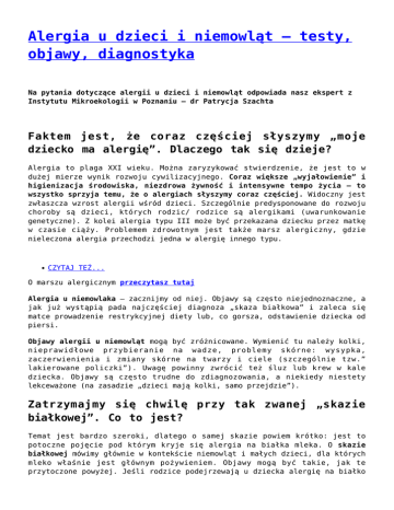 Alergia u dzieci i niemowląt – testy, objawy, diagnostyka Na pytania dotyczące alergii u dzieci i niemowląt odpowiada nasz ekspert z Instytutu Mikroekologii w Poznaniu – dr Patrycja Szachta Faktem jest, że coraz częściej słyszymy „moje dziecko ma alergię”. Dlaczego tak się dzieje? Alergia to plaga XXI wieku. Można zaryzykować stwierdzenie, że jest to w dużej mierze wynik rozwoju cywilizacyjnego. Coraz większe „wyjałowienie” i higienizacja środowiska, niezdrowa żywność i intensywne tempo życia – to wszystko sprzyja temu, że o alergiach słyszymy coraz częściej. Widoczny jest zwłaszcza wzrost alergii wśród dzieci. Szczególnie predysponowane do rozwoju choroby są dzieci, których rodzic/ rodzice są alergikami (uwarunkowanie genetyczne). Z kolei alergia typu III może być przekazana dziecku przez matkę w czasie ciąży. Problemem zdrowotnym jest także marsz alergiczny, gdzie nieleczona alergia przechodzi jedna w alergię innego typu. CZYTAJ TEŻ... O marszu alergicznym przeczytasz tutaj Alergia u niemowlaka – zacznijmy od niej. Objawy są często niejednoznaczne, a jak już wystąpią pada najczęściej diagnoza „skaza białkowa” i zaleca się matce prowadzenie restrykcyjnej diety lub, co gorsza, odstawienie dziecka od piersi. Objawy alergii u niemowląt mogą być zróżnicowane. Wymienić tu należy kolki, nieprawidłowe przybieranie na wadze, problemy skórne: wysypka, zaczerwienienia i zmiany skórne na twarzy i ciele (szczególnie tzw.” lakierowane policzki”). Uwagę powinny zwrócić też śluz lub krew w kale dziecka. Objawy są często trudne do zdiagnozowania, a niekiedy niestety lekceważone (na zasadzie „dzieci mają kolki, samo przejdzie”). Zatrzymajmy się chwilę przy tak zwanej „skazie białkowej”. Co to jest? Temat jest bardzo szeroki, dlatego o samej skazie powiem krótko: jest to potoczne pojęcie pod którym kryje się alergia na białka mleka. O skazie białkowej mówimy głównie w kontekście niemowląt i małych dzieci, dla których mleko właśnie jest głównym pożywieniem. Objawy mogą być takie, jak te przytoczone powyżej. Jeśli rodzice podejrzewają u dziecka alergię na białko mleka, należy przestrzegać następujących wskazówek: Nie stawiać diagnozy samodzielnie, udać się na konsultację do specjalisty (pediatra, alergolog)! Nie wprowadzać diety eliminacyjnej na własną rękę! Dotyczy to zarówno diety dziecka jak i matki, która karmi piersią. Nieprawidłowo prowadzona dieta eliminacyjna może przynieść więcej szkody niż pożytku. Po drugie często rodzice nie zdają sobie sprawy w jak wielu produktach ukrywa się mleko. Wydaje im się, że stosują dietę, a tak naprawdę dostarczają dziecku alergenów np. z serwatki ukrytej w składzie chleba z piekarni. Nie odstawiać od razu dziecka od piersi, nie zmieniać mleka na mleko dla alergików bez diagnozy lekarskiej Dlaczego tak bardzo podkreślam, żeby nie działać na własną rękę? Ponieważ dieta niemowlaka, starszego dziecka czy mamy karmiącej musi być zrównoważona, zbilansowana, dostarczać wszystkich niezbędnych składników odżywczych. W diecie eliminacyjnej uczulające produkty muszą być we właściwy sposób eliminowane i zastępowane. Podejrzewam alergię u mojego dziecka – co mam zrobić? Udać się do pediatry, lub pediatry alergologa. W zależności od wyników wywiadu lekarskiego lekarz powinien zalecić odpowiednie postępowanie. Najczęściej stosuje się takie metody oceny jak: W przypadku niemowląt: diagnoza na podstawie wywiadu lekarskiego, obserwacji rodzica, korelacji typ spożytego pokarmu – pojawienie się objawów wdrożenie diety eliminacyjnej u matki (jeśli karmi piersią) wykonanie badania krwi w kierunku alergii IgE — zależnej CZYTAJ TEŻ... O rodzajach alergii i testach alergicznych czytaj tutaj U dziecka po pierwszym roku życia: testy z krwi na alergię IgE zależną testy z krwi na alergię IgG zależną (do pierwszego roku życia dziecka wykonujemy badanie krwi mamy i na tej podstawie wdrażamy dietę dziecku lub matce – jeśli nadal karmi) dieta eliminacyjna na podstawie wywiadu lekarskiego i objawów Dlaczego nie powinno się lekceważyć objawów alergii pokarmowej u dziecka? Po pierwsze, jeśli właściwie zdiagnozujemy i będziemy leczyć alergię pokarmową, dziecko ma dużą szansę, że po prostu z niej „wyrośnie” i problemy nie będą powtarzać się w przyszłości. Alergia może być bowiem trwała, ale także czasowa. Z kolei jeśli zaniedbamy problem może pojawić się tak zwany „marsz alergiczny”, który w konsekwencji może prowadzić nawet do astmy. CZYTAJ TEŻ... Przeczytaj też artykuł o ukrytych alergenach