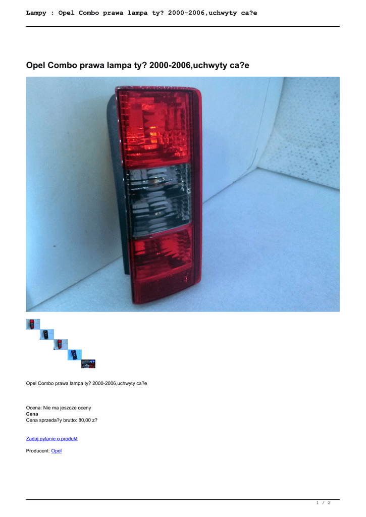 Lampy : Opel Combo prawa lampa ty? 2000-2006,uchwyty ca?e Opel Combo prawa lampa ty? 2000-2006,uchwyty ca?e Opel Combo prawa lampa ty? 2000-2006,uchwyty ca?e Ocena: Nie ma jeszcze oceny Cena Cena sprzeda?y brutto: 80,00 z? Zadaj pytanie o produkt Producent: Opel 1 / 2 Lampy : Opel Combo prawa lampa ty? 2000-2006,uchwyty ca?e Szczegó?y produktu MODEL: Opel Combo NR MAGAZYNOWY: A3-257 OPIS: Opel Combo prawa lampa ty? 2000-2006,uchwyty ca?e CENA:80 SZTUK: 1 DOST?PNO??: TAK Po zakupie Twoja lampa zostanie wys?ana jeszcze tego samego dnia. Ka?da paczka jest dobrze zabezpieczona i nadana PRIORYTETEM, dostarczana za po?rednictwem Poczty Polskiej. Do wysy?ki do??czamy paragon lub na ?yczenie rachunek. Mo?liwy równie? odbiór osobisty. Paczka pocztowa priorytetowa- 25 z? Przesy?ka pobraniowa- 35 z? Magazyn jest stale zaopatrywany w nowe reflektory, dlatego je?li nie wida? na stanie danej lampy- warto zadzwoni? do doradcy i zapyta? o to, co Pa?stwa interesuje. 513-531-967 Jako konsumentowi przys?uguje Ci prawo do zwrotu towaru w ci?gu 10 dni. Nie musisz podawa? przyczyny. Gwarantujemy zwrot pieni?dzy. Jedynych koszty, których nie zwracamy to koszty wysy?ki. Wykonane zdj?cia nie podlegaj? ?adnej obróbce, co przek?ada si? na 100% pewno?ci, ?e zakupiony towar jest zgodny z towarem przedstawionym w ofercie. ZAPRASZAMY 2 / 2 Powered by TCPDF (www.tcpdf.org)