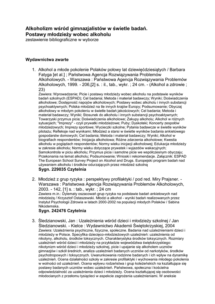 Alkoholizm wśród gimnazjalistów w świetle badań. Postawy młodzieży wobec alkoholu zestawienie bibliograficzne w wyborze Wydawnictwa zwarte 1. Alkohol a młode pokolenie Polaków połowy lat dziewięćdziesiątych / Barbara Fatyga [et al.] ; Państwowa Agencja Rozwiązywania Problemów Alkoholowych. - Warszawa : Państwowa Agencja Rozwiązywania Problemów Alkoholowych, 1999. - 206,[2] s. : il., tab., wykr. ; 24 cm. - (Alkohol a zdrowie ; 23) Zawiera: Wprowadzenie; Picie i postawy młodzieży wobec alkoholu na podstawie wyników badań szkolnych (ESPAD); Cel badania; Metoda i materiał badawczy; Wyniki; Doświadczenia alkoholowe; Dostępność napojów alkoholowych; Postawy wobec alkoholu i innych substancji psychoaktywnych; Polska młodzież na tle innych krajów Europy; Podsumowanie; Obyczaj alkoholowy w młodym pokoleniu w świetle badań jakościowych; Cel badania; Metoda i materiał badawczy; Wyniki; Stosunek do alkoholu i innych substancji psychoaktywnych; Towarzyski przymus picia; Doświadczenia alkoholowe; Zakupy alkoholu; Alkohol w różnych sytuacjach; "Imprezy" - czyli prywatki młodzieżowe; Puby; Dyskoteki; Koncerty zespołów młodzieżowych; Imprezy sportowe; Wycieczki szkolne; Pytania badawcze w świetle wyników pilotażu; Refleksje nad wynikami; Młodzież a starsi w świetle wyników badania ankietowego gospodarstw domowych; Cel badania; Metoda i materiał badawczy; Wyniki; Alkohol w biografiach respondentów; Inicjacja alkoholowa; Różne zdarzenia alkoholowe; Kwestia alkoholu w poglądach respondentów; Normy wieku inicjacji alkoholowej; Edukacja młodzieży w zakresie alkoholu; Normy wieku dotyczące prywatek i wyjazdów wakacyjnych; Samokontrola w piciu alkoholu; Przymus picia i samotne picie we współczesnym obyczaju; Przekonania na temat alkoholu; Podsumowanie; Wnioski i rekomendacje. Załącznik: ESPAD The European School Survey Project on Alcohol and Drugs. Europejski program badań nad używaniem alkoholu i środków odurzających przez młodzież szkolną Sygn. 229035 Czytelnia 2. Młodzież z grup ryzyka : perspektywy profilaktyki / pod red. Miry Prajsner. Warszawa : Państwowa Agencja Rozwiązywania Problemów Alkoholowych, 2003. - 142, [1] s. : tab., wykr. ; 24 cm Zawiera m.in.: Dylematy oszacowań grup ryzyka na podstawie badań ankietowych nad młodzieżą / Krzysztof Ostaszewski. Młodzi a alkohol - wyniki badań realizowanych przez Instytut Psychologii Zdrowia w latach 2000-2002 na populacji młodych Polaków / Sabina Nikodemska. Sygn. 242476 Czytelnia 3. Śledzianowski, Jan : Uzależnienia wśród dzieci i młodzieży szkolnej / Jan Śledzianowski. - Kielce : Wydawnictwo Akademii Świętokrzyskiej, 2004 Zawiera: Uzależnienia psychiczne, fizyczne, społeczne. Badania nad uzależnieniami dzieci i młodzieży w Polsce. Specyfika dziecięco-młodzieżowych uzależnień: uzależnienia od nikotyny, alkoholu, środków toksycznych. Charakterystyka środków toksycznych. Rozmiary uzależnień wśród dzieci i młodzieży na przykładzie województwa świętokrzyskiego: nikotynizm wśród dzieci i młodzieży szkolnej, picie i upajanie się alkoholem uczniów gimnazjów i szkół średnich, analiza uzależnień badanych uczniów od narkotyków, środków psychotropowych i toksycznych. Uwarunkowania rodzinne badanych i ich wpływ na dynamikę uzależnień. Ocena działalności szkoły w zakresie profilaktyki i wychowania młodego pokolenia w wolności od uzależnień. Ocena wpływu rodzeństwa i grup koleżeńskich na kształtujące się postawy badanych uczniów wobec uzależnień. Państwowa, społeczna i kościelna odpowiedzialność za uzależnienia dzieci i młodzieży. Ocena kształtującej się osobowości młodocianych z przełomu tysiącleci w aspekcie zagrożenia uzależnieniami. W aneksie zamieszczono kwestionariusz ankiety, którą wypełniali badani respondenci. Sygn. 238185 Czytelnia Sygn. 238216 Wypożyczalnia 4. Zajęcka, Beata : Rozmiary, struktura i wzory spożywania napojów alkoholowych przez młodzież // W: Psychopatologia i psychoprofilaktyka : przejawy narkomanii, alkoholizmu, przemocy, zaburzeń psychicznych w rodzinie i szkole oraz możliwości im przeciwdziałania : materiały z ogólnopolskiej sesji naukowej zorganizowanej przez Instytut Pedagogiki Społecznej Wyższej Szkoły Pedagogicznej w Częstochowie, 19-21.10.1999 r. / red. Andrzej Margasiński, Beata Zajęcka. - Kraków : „Impuls”, 2000. - S. 295301 Sygn. 229745 Czytelnia Sygn. 229589, 229590 Wypożyczalnia Wydawnictwa ciągłe 5. Bobrowski, Krzysztof : Czas wolny a zachowania ryzykowne młodzieży / Krzysztof Bobrowski // „Alkoholizm i Narkomania”. - 2007, nr 3, s. 267-287 Artykuł dostępny w Internecie. Badania mające na celu analizę związków pomiędzy sposobem spędzania wolnego czasu przez młodzież, a jej zachowaniami ryzykownymi. 6. Bobrowski, Krzysztof : Fazy używania nielegalnych substancji psychoaktywnych a picie alkoholu wśród młodzieży i młodych dorosłych / Krzysztof Bobrowski // 7. „Alkoholizm i Narkomania”. - 2008, nr 4, s. 341-[362] Artykuł dostępny w Internecie. Analiza różnic pomiędzy grupami osób znajdujących się w różnych fazach używania narkotyków (używanie okazjonalne, problemowe i uzależnienie), rozpatrywana z punktu widzenia picia alkoholu czy charakterystyki demograficznej - wyniki badań przeprowadzonych wśród osób w wieku 13-24 lata, głównie mężczyzn wcześniej używających nielegalnych substancji psychoaktywnych. 8. Bobrowski, Krzysztof : Rozpowszechnianie używania substancji psychoaktywnych wśród młodzieży gimnazjalnej w Iławie, 2001-2005-2010 / Krzysztof Bobrowski // „Alkoholizm i Narkomania”. - 2012, nr 1, s. 37-56 Prezentacja wyników trzeciej edycji badań młodzieży iławskiej, których głównym celem badań była ocena zmian w rozpowszechnianiu używania substancji psychoaktywnych wśród uczniów pierwszych i trzecich klas gimnazjów. 9. Bobrowski, Krzysztof : Zmiany w rozpows