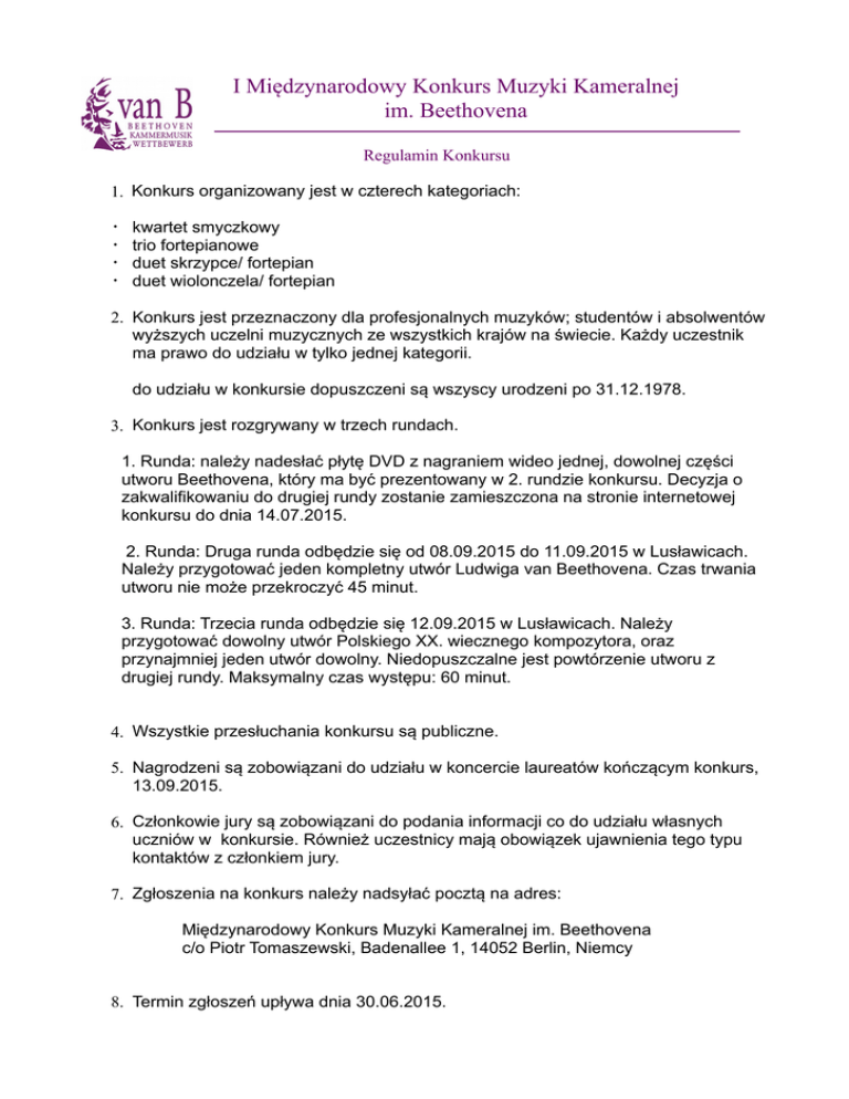 I Międzynarodowy Konkurs Muzyki Kameralnej im. Beethovena Regulamin Konkursu 1. Konkurs organizowany jest w czterech kategoriach: ・ ・ ・ ・ kwartet smyczkowy trio fortepianowe duet skrzypce/ fortepian duet wiolonczela/ fortepian 2. Konkurs jest przeznaczony dla profesjonalnych muzyków; studentów i absolwentów wyższych uczelni muzycznych ze wszystkich krajów na świecie. Każdy uczestnik ma prawo do udziału w tylko jednej kategorii. do udziału w konkursie dopuszczeni są wszyscy urodzeni po 31.12.1978. 3. Konkurs jest rozgrywany w trzech rundach. 1. Runda: należy nadesłać płytę DVD z nagraniem wideo jednej, dowolnej części utworu Beethovena, który ma być prezentowany w 2. rundzie konkursu. Decyzja o zakwalifikowaniu do drugiej rundy zostanie zamieszczona na stronie internetowej konkursu do dnia 14.07.2015. 2. Runda: Druga runda odbędzie się od 08.09.2015 do 11.09.2015 w Lusławicach. Należy przygotować jeden kompletny utwór Ludwiga van Beethovena. Czas trwania utworu nie może przekroczyć 45 minut. 3. Runda: Trzecia runda odbędzie się 12.09.2015 w Lusławicach. Należy przygotować dowolny utwór Polskiego XX. wiecznego kompozytora, oraz przynajmniej jeden utwór dowolny. Niedopuszczalne jest powtórzenie utworu z drugiej rundy. Maksymalny czas występu: 60 minut. 4. Wszystkie przesłuchania konkursu są publiczne. 5. Nagrodzeni są zobowiązani do udziału w koncercie laureatów kończącym konkurs, 13.09.2015. 6. Członkowie jury są zobowiązani do podania informacji co do udziału własnych uczniów w konkursie. Również uczestnicy mają obowiązek ujawnienia tego typu kontaktów z członkiem jury. 7. Zgłoszenia na konkurs należy nadsyłać pocztą na adres: Międzynarodowy Konkurs Muzyki Kameralnej im. Beethovena c/o Piotr Tomaszewski, Badenallee 1, 14052 Berlin, Niemcy 8. Termin zgłoszeń upływa dnia 30.06.2015. 9. Rozpatrywane będą tylko wnioski wypełnione poprawie i czytelnie 10. Do zgłoszenia należy dołączyć : ・ ・ ・ ・ ・ ・ kopie dowodu osobistego lub paszportu (dla każdego członka zespołu) CV (dla każdego członka zespołu) polecenie, opinie odpowiedniej osoby, n.p. profesora (jedno dla zespołu) kopie potwierdzenia wniesienia opłaty wpisowej aktualna fotografie zespołu DVD z utworem 1. rundy. 11. Jury konkursu ma prawo oddalić zgłoszenie bez podania powodów. 12. Oplata wpisowa wynosi 80,00 € od osoby w zespole. Opłata wpisowa nie podlega zwrotowi. 13. Zgłoszenie pisemne jest wiążące. Program podany w formularzu zgłoszeniowym nie podlega zmianom. 14. Uczestnicy wybrani przez jury są zobowiązani do udziału w kolejnej rundzie. Uczestnicy zobowiązują się do udziału we wszystkich próbach i koncertach związanych z konkursem, łącznie z występami dla sponsorów. 15. Na żądanie są wydawane dyplomy udziału. 16. Jury ma prawo do łączenia bądź dzielenia poszczególnych nagród. Decyzje jury są wiążące. 17. Międzynarodowy Konkurs Muzyki Kameralnej im Beethovena, i jego organizatorzy mają prawo zlecić nagranie i emisje części, bądź całości przesłuchań konkursu stacji radiowej bądź TV, a także we własnym zakresie sporządzić nagrania audio, wideo, cyfrowe i analogowe. Całość konkursu będzie nagrana w celach archiwalnych. Uczestnicy nie mają prawa do honorarium z tytułu tych nagrań. . 18. Laureaci zobowiązują się do podawania przez dwa lata informacji, że są zwycięzcami I Międzynarodowego Konkursu Muzyki Kameralnej im. Beethovena. 19. W przypadku wątpliwości co do interpretacji treści tego regulaminu, ważna jest tylko wersja polska. 20. Podpisem pod wnioskiem uczestnicy zobowiązują się do przestrzegania regulaminu.