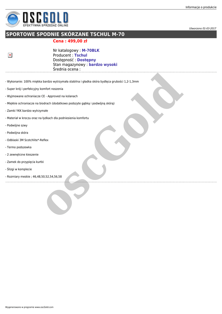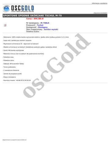Informacje o produkcie Utworzono 01-03-2017 SPORTOWE SPODNIE SKÓRZANE TSCHUL M-70 Cena : 499,00 zł Nr katalogowy : M-70BLK Producent : Tschul Dostępność : Dostępny Stan magazynowy : bardzo wysoki Średnia ocena : - Wykonanie: 100% miękka bardzo wytrzymała stabilna i gładka skóra bydlęca grubości 1,2-1,3mm - Wyjmowane ochraniacze CE - Approved na kolanach - Miękkie ochraniacze na biodrach (dodatkowo podszyte gąbką i podwójną skórą) - Materiał w kroczu oraz na łydkach dla podniesienia komfortu - Podwójne szwy - Podwójna skóra - Termo podszewka - 2 zewnętrzne kieszenie - Zamek do przypięcia kurtki - Ślizgi w komplecie cG - Odblaski 3M Scotchlite*-Reflex ol - Zamki YKK bardzo wytrzymałe os - Rozmiary meskie ; 46,48,50,52,54,56,58 Wygenerowano w programie www.oscGold.com d - Super krój i perfekcyjny komfort noszenia