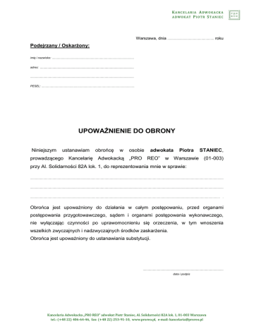 KANCELARIA ADWOKACKA ADWOKAT PIOTR STANIEC Warszawa, dnia ........................................................ roku Podejrzany / Oskarżony: imię i nazwisko: ................................................................................................... adres: ................................................................................................................. ............................................................................................................................. PESEL: ................................................................................................................ UPOWAŻNIENIE DO OBRONY Niniejszym ustanawiam prowadzącego Kancelarię obrońcę w Adwokacką osobie adwokata „PRO REO” Piotra w Warszawie STANIEC, (01-003) przy Al. Solidarności 82A lok. 1, do reprezentowania mnie w sprawie: ......................................................................................................................................................................................................................................... ......................................................................................................................................................................................................................................... ..................................................................................................................................................................................................................................... . Obrońca jest upoważniony do działania w całym postępowaniu, przed organami postępowania przygotowawczego, sądem i organami postępowania wykonawczego, nie wyłączając czynności po uprawomocnieniu się orzeczenia, w tym wnoszenia wszelkich zwyczajnych i nadzwyczajnych środków zaskarżenia. Obrońca jest upoważniony do ustanawiania substytucji. ................................................................................................. data i podpis Kancelaria Adwokacka „PRO REO” adwokat Piotr Staniec, Al. Solidarności 82A lok. 1, 01-003 Warszawa tel.: (+48 22) 406-64-46, fax: (+48 22) 253-91-10, www.proreo.pl, e-mail: [email protected]