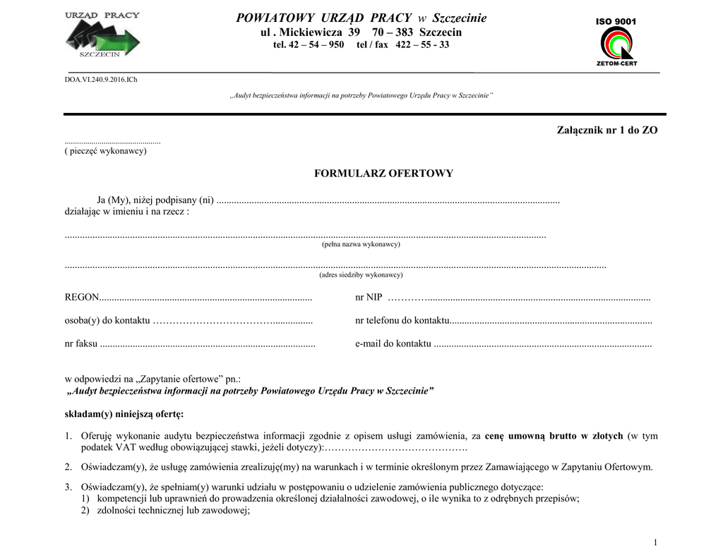 POWIATOWY URZĄD PRACY w Szczecinie ul . Mickiewicza 39 tel. 42 – 54 – 950 70 – 383 Szczecin tel / fax 422 – 55 - 33 DOA.VI.240.9.2016.ICh „Audyt bezpieczeństwa informacji na potrzeby Powiatowego Urzędu Pracy w Szczecinie” Załącznik nr 1 do ZO ............................................... ( pieczęć wykonawcy) FORMULARZ OFERTOWY Ja (My), niżej podpisany (ni) ......................................................................................................................................... działając w imieniu i na rzecz : ................................................................................................................................................................................................ (pełna nazwa wykonawcy) ........................................................................................................................................................................................................................ (adres siedziby wykonawcy) REGON..................................................................................... nr NIP …………......................................................................................... osoba(y) do kontaktu ………………………………................ nr telefonu do kontaktu................................................................................. nr faksu ...................................................................................... e-mail do kontaktu ....................................................................................... w odpowiedzi na „Zapytanie ofertowe” pn.: „Audyt bezpieczeństwa informacji na potrzeby Powiatowego Urzędu Pracy w Szczecinie” składam(y) niniejszą ofertę: 1. Oferuję wykonanie audytu bezpieczeństwa informacji zgodnie z opisem usługi zamówienia, za cenę umowną brutto w złotych (w tym podatek VAT według obowiązującej stawki, jeżeli dotyczy):……………………………………. 2. Oświadczam(y), że usługę zamówienia zrealizuję(my) na warunkach i w terminie określonym przez Zamawiającego w Zapytaniu Ofertowym. 3. Oświadczam(y), że spełniam(y) warunki udziału w postępowaniu o udzielenie zamówienia publicznego dotyczące: 1) kompetencji lub uprawnień do prowadzenia określonej działalności zawodowej, o ile wynika to z odrębnych przepisów; 2) zdolności technicznej lub zawodowej; 1 POWIATOWY URZĄD PRACY w Szczecinie ul . Mickiewicza 39 tel. 42 – 54 – 950 70 – 383 Szczecin tel / fax 422 – 55 - 33 DOA.VI.240.9.2016.ICh „Audyt bezpieczeństwa informacji na potrzeby Powiatowego Urzędu Pracy w Szczecinie” 3) sytuacji ekonomicznej i finansowej. 4. Oświadczam(y), że jesteśmy związani niniejszą ofertą przez okres 30 dni od upływu terminu składania ofert. 5. Oświadczam(y), że w razie wybrania naszej oferty zobowiązujemy się do podpisania umowy na warunkach zawartych w załączniku nr 2 do ZO oraz w miejscu i terminie określonym przez Zamawiającego. 6. Oświadczam(y), że do realizacji zamówienia wskazujemy następujące osoby: 1) Audytor Wiodący: Imię i nazwisko Posiadane uprawnienia (co najmniej certyfikat Audytora Wiodącego ISO 27001) Doświadczenie Podmiot na rzecz, którego wykonana została praca podobna Zakres wykonanych czynności, w celu oceny zgodności wykazanej pracy podobnej z wymaganiami ZO Okres realizacji (dd/mm/rrrr) Termin rozpoczęcia:...................................... Termin zakończenia:..................................... Termin rozpoczęcia:...................................... Termin zakończenia:..................................... Termin rozpoczęcia:...................................... Termin zakończenia:..................................... Termin rozpoczęcia:...................................... Termin zakończenia:..................................... Termin rozpoczęcia:...................................... Termin zakończenia:..................................... Termin rozpoczęcia:...................................... Termin zakończenia:..................................... 2 POWIATOWY URZĄD PRACY w Szczecinie ul . Mickiewicza 39 tel. 42 – 54 – 950 70 – 383 Szczecin tel / fax 422 – 55 - 33 DOA.VI.240.9.2016.ICh „Audyt bezpieczeństwa informacji na potrzeby Powiatowego Urzędu Pracy w Szczecinie” Termin rozpoczęcia:...................................... Termin zakończenia:..................................... Termin rozpoczęcia:...................................... Termin zakończenia:..................................... Termin rozpoczęcia:...................................... Termin zakończenia:..................................... Termin rozpoczęcia:...................................... Termin zakończenia:..................................... 2) Audytor Wewnętrzny: Imię i nazwisko Posiadane uprawnienia (co najmniej certyfikat Audytora Wewnętrznego ISO 27001) Doświadczenie Podmiot na rzecz, którego wykonana została praca podobna Zakres wykonanych czynności, w celu oceny zgodności wykazanej pracy podobnej z wymaganiami ZO Okres realizacji (dd/mm/rrrr) Termin rozpoczęcia:...................................... Termin zakończenia:..................................... Termin rozpoczęcia:...................................... Termin zakończenia:..................................... Termin rozpoczęcia:...................................... Termin zakończenia:..................................... Termin rozpoczęcia:...................................... Termin zakończenia:..................................... 3 POWIATOWY URZĄD PRACY w Szczecinie ul . Mickiewicza 39 tel. 42 – 54 – 950 70 – 383 Szczecin tel / fax 422 – 55 - 33 DOA.VI.240.9.2016.ICh „Audyt bezpieczeństwa informacji na potrzeby Powiatowego Urzędu Pracy w Szczecinie” Termin rozpoczęcia:...................................... Termin zakończenia:..................................... Termin rozpoczęcia