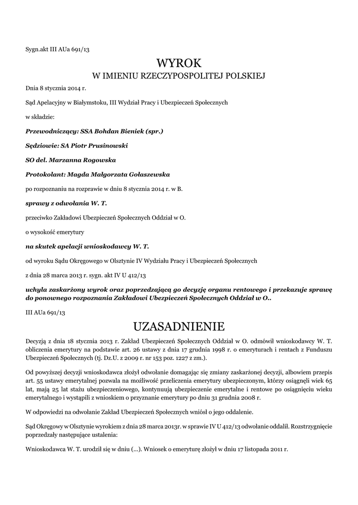 Sygn.akt III AUa 691/13 WYROK W IMIENIU RZECZYPOSPOLITEJ POLSKIEJ Dnia 8 stycznia 2014 r. Sąd Apelacyjny w Białymstoku, III Wydział Pracy i Ubezpieczeń Społecznych w składzie: Przewodniczący: SSA Bohdan Bieniek (spr.) Sędziowie: SA Piotr Prusinowski SO del. Marzanna Rogowska Protokolant: Magda Małgorzata Gołaszewska po rozpoznaniu na rozprawie w dniu 8 stycznia 2014 r. w B. sprawy z odwołania W. T. przeciwko Zakładowi Ubezpieczeń Społecznych Oddział w O. o wysokość emerytury na skutek apelacji wnioskodawcy W. T. od wyroku Sądu Okręgowego w Olsztynie IV Wydziału Pracy i Ubezpieczeń Społecznych z dnia 28 marca 2013 r. sygn. akt IV U 412/13 uchyla zaskarżony wyrok oraz poprzedzającą go decyzję organu rentowego i przekazuje sprawę do ponownego rozpoznania Zakładowi Ubezpieczeń Społecznych Oddział w O.. III AUa 691/13 UZASADNIENIE Decyzją z dnia 18 stycznia 2013 r. Zakład Ubezpieczeń Społecznych Oddział w O. odmówił wnioskodawcy W. T. obliczenia emerytury na podstawie art. 26 ustawy z dnia 17 grudnia 1998 r. o emeryturach i rentach z Funduszu Ubezpieczeń Społecznych (tj. Dz.U. z 2009 r. nr 153 poz. 1227 z zm.). Od powyższej decyzji wnioskodawca złożył odwołanie domagając się zmiany zaskarżonej decyzji, albowiem przepis art. 55 ustawy emerytalnej pozwala na możliwość przeliczenia emerytury ubezpieczonym, którzy osiągnęli wiek 65 lat, mają 25 lat stażu ubezpieczeniowego, kontynuują ubezpieczenie emerytalne i rentowe po osiągnięciu wieku emerytalnego i wystąpili z wnioskiem o przyznanie emerytury po dniu 31 grudnia 2008 r. W odpowiedzi na odwołanie Zakład Ubezpieczeń Społecznych wniósł o jego oddalenie. Sąd Okręgowy w Olsztynie wyrokiem z dnia 28 marca 2013r. w sprawie IV U 412/13 odwołanie oddalił. Rozstrzygnięcie poprzedzały następujące ustalenia: Wnioskodawca W. T. urodził się w dniu (...). Wniosek o emeryturę złożył w dniu 17 listopada 2011 r. Decyzją z dnia 4 stycznia 2012 r. przyznano wnioskodawcy emeryturę od 1 listopada 2011 r. Wnioskodawca pozostawał w zatrudnieniu do 10 listopada 2011 r. i z tym dniem rozwiązał umowę o pracę w trybie porozumienia stron. Od 1 stycznia 2013 r. podjął kolejne zatrudnienie. W dniu 8 stycznia 2013 r. wnioskodawca złożył wniosek o obliczenie emerytury w sposób określony w art. 26 ustawy emerytalnej. Zaskarżoną decyzją odmówiono wnioskodawcy prawa do obliczenia emerytury w sposób określony w art. 26 ustawy emerytalnej wskazując, iż nie spełnia on przesłanek do tak obliczonej emerytury. W ocenie Sądu I instancji odwołanie nie jest zasadne. Po pierwsze wnioskodawca miał przyznaną emeryturę na podstawie art. 29 ustawy emerytalnej i pobierał świadczenie emerytalne Nie budzi także wątpliwości fakt, iż wnioskodawca pobierał tę emeryturę. Sąd I instancji dalej wywiódł, że przepis art. 55 ustawy emerytalnej wyraźnie stwierdza, że ubezpieczonemu spełniającemu warunki do uzyskania emerytury na podstawie art. 27 ustawy emerytalnej który kontynuował ubezpieczenie emerytalne, rentowe po osiągnięciu przewidzianego w tym przepisie wieku emerytalnego i wystąpił z wnioskiem o przyznanie emerytury po dniu 31 grudnia 208 r. może być obliczona emerytura na podstawie art. 26 jeżeli jest wyższa od obliczonej zgodnie z art. 53 tej ustawy. W tej sytuacji stanowisko pozwanego jest prawidłowe. Ustawodawca wyraźnie w przepisach ustawy emerytalnej różnicuje stany „ustalone prawo do emerytury lub renty” od „spełnienia warunków do uzyskania emerytury lub renty”. We wskazanym wyżej przepisie wyraźnie zapisał: „ubezpieczonemu spełniającemu warunki do uzyskania emerytury” zawężając tę dyspozycję do uzyskania emerytury na podstawie art. 27 ustawy emerytalnej. Wnioskodawca nie spełnia tych przesłanek, gdyż miał przyznaną emeryturę na podstawie art. 29 ustawy emerytalnej i tak ustaloną emeryturę oraz obliczoną według zasad wynikających z art. 53 ustawy wnioskodawca pobiera od 1 listopada 2011 r. Stanowisko takie można również zauważyć w orzecznictwie sądowym (patrz. – wyrok SA we Wrocławiu z dnia 9 sierpnia 2012 r. – III AUa 699/12 – LEX 1220398) oraz w literaturze (Służba Pracownicza 2011 r. nr 7 str. 9 – kapitałowa emerytura dla niektórych urodzonych przed 1949 r.). Powyższe przepisy pozwalają w ocenie Sądu Okręgowego na stwierdzenie, że osoby które po przyznaniu emerytury – według starego systemu emerytalnego tj. według zasad z art. 46 ustawy, złożą wniosek o przeliczenie świadczenia w związku z osiągnięciem powszechnego wieku emerytalnego i kontynuowaniem ubezpieczenia mają prawo do przeliczenia świadczenia również według starych zasad. W tych warunkach odwołanie wnioskodawcy należy uznać za nieuzasadnione. Mając na uwadze powyższe Sąd Okręgowy na podstawie art. 47714 § 1 kpc odwołanie oddalił. Od powyższego wyroku apelację wywiódł W. T., zaskarżając w całości rozstrzygnięcie Sądu I instancji i zarzucając orzeczeniu naruszenie prawa materialnego, a mianowicie art. 55 ustawy z dnia 17.12.1998r. o emeryturach i rentach z Funduszu Ubezpieczeń Społecznych. W ocenie skarżącego nie ma przepisów uwarunkowujących prawo do przeliczenia emerytury tylko do osób, które pierwszy wniosek o świadczenie złożyły po dniu 31.12.2008r. Nie można też negować prawa ubezpieczonego do stosownego przeliczenia tylko dlatego, że wcześniej miał ustalone prawo do emerytury w oparciu o art. 29 ustawy emerytalnej. Powyższej oceny nie zmienia przytoczone przez Sąd Okręgowy orzecznictwo Sądu Apelacyjnego, bowiem zostały wydane także rozstrzygnięcia dopuszczające możliwość przeliczenia emerytury w takim stanie faktycznym, jak skarżącego [vide wyrok SA w Rzeszowie z dnia 4.12.2012r. w sprawie III Aua 876/12]. Z tych względów apelacja jest zasadna. Sąd Apelacyjny zważył, co następuje : Apelacja wnioskodawcy jest zasadna. W pierwszej kolejności trzeba zauwa