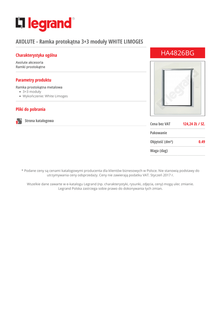 AXOLUTE - Ramka protokątna 3+3 moduły WHITE LIMOGES Charakterystyka ogólna HA4826BG Axolute akcesoria Ramki prostokątne Parametry produktu Ramka prostokątna metalowa 3+3 moduły Wykończenie: White Limoges Pliki do pobrania Strona katalogowa Cena bez VAT 124,24 ZŁ / SZ. Pakowanie Objętość (dm³) 0.49 Waga (dag) * Podane ceny są cenami katalogowymi producenta dla klientów biznesowych w Polsce. Nie stanowią podstawy do utrzymywania ceny odsprzedaży. Ceny nie zawierają podatku VAT. Styczeń 2017 r. Wszelkie dane zawarte w e-katalogu Legrand (np. charakterystyki, rysunki, zdjęcia, ceny) mogą ulec zmianie. Legrand Polska zastrzega sobie prawo do dokonywania tych zmian.