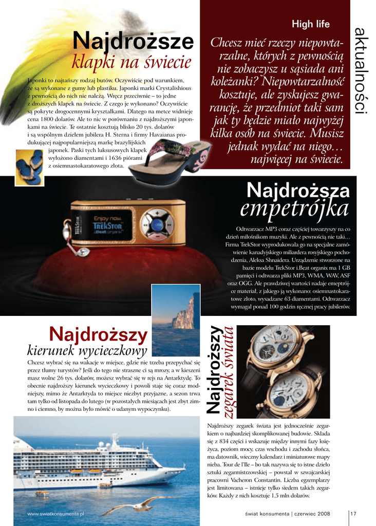 klapki na świecie Japonki to najtańszy rodzaj butów. Oczywiście pod warunkiem, że są wykonane z gumy lub plastiku. Japonki marki Crystalishious z pewnością do nich nie należą. Wręcz przeciwnie – to jedne z droższych klapek na świecie. Z czego je wykonano? Oczywiście są pokryte drogocennymi kryształkami. Dlatego na metce widnieje cena 1800 dolarów. Ale to nic w porównaniu z najdroższymi japonkami na świecie. Te ostatnie kosztują blisko 20 tys. dolarów i są wspólnym dziełem jubilera H. Sterna i firmy Havaianas produkującej najpopularniejszą markę brazylijskich japonek. Paski tych luksusowych klapek wyłożono diamentami i 1636 piórami z osiemnastokaratowego złota. aktualności Najdroższe High life Chcesz mieć rzeczy niepowtarzalne, których z pewnością nie zobaczysz u sąsiada ani koleżanki? Niepowtarzalność kosztuje, ale zyskujesz gwarancję, że przedmiot taki sam jak ty będzie miało najwyżej kilka osób na świecie. Musisz jednak wydać na niego… najwięcej na świecie. Najdroższa empetrójka Najdroższy kierunek wycieczkowy Chcesz wybrać się na wakacje w miejsce, gdzie nie trzeba przepychać się przez tłumy turystów? Jeśli do tego nie straszne ci są mrozy, a w kieszeni masz wolne 26 tys. dolarów, możesz wybrać się w rejs na Antarktydę. To obecnie najdroższy kierunek wycieczkowy i powoli staje się coraz modniejszy, mimo że Antarktyda to miejsce niezbyt przyjazne, a sezon trwa tam tylko od listopada do lutego (w pozostałych miesiącach jest zbyt zimno i ciemno, by można było mówić o udanym wypoczynku). Najdroższy zegarek świata Odtwarzacz MP3 coraz częściej towarzyszy na co dzień miłośnikom muzyki. Ale z pewnością nie taki… Firma TrekStor wyprodukowała go na specjalne zamówienie kanadyjskiego miliardera rosyjskiego pochodzenia, Aleksa Shnaidera. Urządzenie stworzone na bazie modelu TrekStor i.Beat organix ma 1 GB pamięci i odtwarza pliki MP3, WMA, WAV, ASF oraz OGG. Ale prawdziwej wartości nadaje emeptrójce materiał, z jakiego ją wykonano: osiemnastokaratowe złoto, wysadzane 63 diamentami. Odtwarzacz wymagał ponad 100 godzin ręcznej pracy jubilerów. Najdroższy zegarek świata jest jednocześnie zegarkiem o najbardziej skomplikowanej budowie. Składa się z 834 części i wskazuje między innymi fazy księżyca, poziom mocy, czas wschodu i zachodu słońca, ma datownik, wieczny kalendarz i miniaturowe mapy nieba. Tour de l’Ile – bo tak nazywa się to istne dzieło sztuki zegarmistrzowskiej – powstał w szwajcarskiej pracowni Vacheron Constantin. Liczba egzemplarzy jest limitowana – istnieje tylko siedem takich zegarków. Każdy z nich kosztuje 1,5 mln dolarów. www.swiatkonsumenta.pl świat konsumenta | czerwiec 2008 17