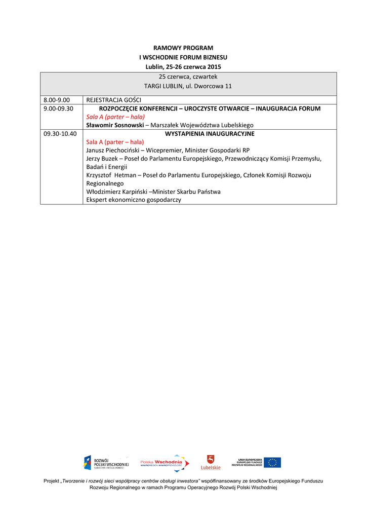 RAMOWY PROGRAM I WSCHODNIE FORUM BIZNESU Lublin, 25