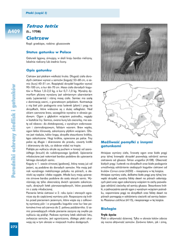Ptaki (cz´Êç I) Tetrao tetrix A409 (L., 1758) Cietrzew Rzàd: grzebiàce, rodzina: g∏uszcowate Status gatunku w Polsce Gatunek l´gowy, zimujàcy, w skali kraju bardzo nieliczny, lokalnie nieliczny lub Êrednio liczny. Poradniki ochrony siedlisk i gatunków Opis gatunku 272 Cietrzew jest ptakiem wielkoÊci kruka. D∏ugoÊç cia∏a doros∏ych cietrzewi wynosi u samców (koguty) 53–68 cm, a samic (kury) 40–51 cm. Rozpi´toÊç skrzyde∏ kogutów wynosi 90–100 cm, a kur 66–70 cm. Masa cia∏a doros∏ych kogutów w Polsce 1,0–2,0 kg, a kur 0,7–1,0 kg. Wyraêny dymorfizm p∏ciowy wyra˝ony jest odmiennym ubarwieniem szaty (upierzenia) i ró˝nà masà cia∏a. Samiec ma szat´ z dominacjà czerni, z granatowym po∏yskiem. Kontrastuje z nià biel piór podogonia oraz lusterek (plam) i pr´g na skrzyd∏ach, które widoczne sà z du˝ej odleg∏oÊci. Nad okiem czerwona brew, szczególnie wyraêna w okresie godowym. Ogon z g∏´bokim wci´ciem poÊrodku, wygi´ty w kszta∏cie liry. Samica, zwana kurà lub cieciorkà, ma szat´ od rdzawo– do z∏otobràzowej, z wyraênym srebrnoszarym i ciemnobràzowym, falistym wzorem. Brew wàska, ogon lekko klinowaty, zakoƒczony p∏ytkim wci´ciem. G∏owa jest niedu˝a, tu∏ów kr´py, skrzyd∏a stosunkowo krótkie, t´po zakoƒczone. Nogi krótkie, opierzone po palce. Trzy palce sà d∏ugie i skierowane do przodu, czwarty krótki i skierowany do ty∏u, co dobrze widaç na tropie. Piskl´ta po wykluciu okryte sà puchem w tonacji od szaro˝ó∏tego (brzuch) do rudobràzowego (grzbiet). Upierzenie m∏odociane jest natomiast bardzo podobne do upierzenia letniego doros∏ych samic. Koguty w 1. szacie zimowej (godowej), którà noszà ju˝ od jesieni, sà podobne do doros∏ych samców. Nie majà jednak wyraênego metalicznego po∏ysku na piórach, a sterówki sà wàskie i s∏abo wygi´te. M∏ode kury majà upierzenie zimowe bardzo podobne do szaty starych samic. Wyró˝niajà si´ tylko obecnoÊcià dwóch spiczasto zakoƒczonych, skrajnych lotek pierwszorz´dowych, które pozosta∏y im z szaty m∏odocianej. Pierzenie letnie cietrzewi w 2. roku ˝ycia i starszych ogranicza si´ do cz´Êciowej wymiany piór. Rozpoczyna si´ krótko przed pierzeniem jesiennym, które wià˝e si´ z ca∏kowità wymianà piór i w przypadku kogutów oraz kur bez potomstwa trwa od czerwca do 2. po∏owy paêdziernika. U samic prowadzàcych m∏ode pierzenie zaczyna si´ zwykle po wykluciu si´ pisklàt. Podczas wymiany lotek zdolnoÊç lotu, zw∏aszcza samców, jest ograniczona, dlatego ptaki ukrywajà si´ w tym okresie w miejscach trudno dost´pnych. cietrzew Mo˝liwoÊç pomy∏ki z innymi gatunkami Mniejsze wymiary cia∏a, lirowaty ogon oraz bia∏e pr´gi przy tylnej kraw´dzi skrzyde∏ pozwalajà odró˝niç samca cietrzewia od g∏uszca Tetrao urogallus (A108). ObecnoÊç bia∏ych pr´g i lusterek na skrzyd∏ach oraz bia∏e podogonie umo˝liwiajà odró˝nienie siedzàcych kogutów cietrzewi od kruków Corvus corax (A350) – nieopisany w tej ksià˝ce. Mniejsze wymiary cia∏a, delikatne bia∏e pr´gi przy tylnej kraw´dzi skrzyde∏, wyraêny falisty deseƒ na piórach os∏aniajàcych pierÊ oraz ogon zakoƒczony wci´ciem to cechy pozwalajàce odró˝niç cieciork´ od samicy g∏uszca. Stosunkowo krótki, a jednoczeÊnie szeroki ogon z wyraênym wci´ciem poÊrodku, wspomniane pr´gi na skrzyd∏ach oraz falisty deseƒ na piórach pomagajà w odró˝nieniu cieciorki od samicy ba˝anta Phasianus colchicus (A115), nieopisanego w tej ksià˝ce. Biologia Tryb ˝ycia Ptaki o aktywnoÊci dziennej. Tylko w okresie toków zdarza si´ nocna aktywnoÊç samców. Zarówno latem, jak i zimà, Tetrao tetrix (Cietrzew) L´gi Okres godowy (toki) trwa od po∏owy marca do poczàtków czerwca (pozorne toki odbywajà si´ tak˝e jesienià). Miejscem toków sà ÊródleÊne halizny lub uprawy, a tak˝e torfowiska lub zagospodarowane ∏àki, a nawet oziminy. Spotyka si´ tam od jednego do kilkunastu (kilkudziesi´ciu) samców, które walczà o rewiry po∏o˝one w centralnej cz´Êci tokowiska, tam bowiem samice wybierajà swoich partnerów. Elementem godów sà charakterystyczne odg∏osy: czuszykanie i be∏kotanie. Pierwszy z nich wydajà zarówno koguty stare, jak i jednoroczne. Jest on s∏yszalny w sprzyjajàcych warunkach z odleg∏oÊci do 1 km. Pojedyncza faza tej pieÊni godowej brzmi jak „czhu-szy” lub „czuh- szyy szy sz sz” i trwa ok. sekundy. Be∏kotanie w cichy poranek s∏ychaç z odleg∏oÊci do 3–4 km. Przypomina ono odg∏os bulgotania wody w garnku, a z daleka gruchanie go∏´bia grzywacza. Be∏koczà tylko koguty aktywnie uczestniczàce w tokach. Poszczególne zwrotki be∏kotania trwajà 3–4 sekundy, przy czym roztokowany kogut mo˝e powtarzaç zwrotk´ za zwrotkà przez kilkadziesiàt minut. Gniazdo stanowi p∏ytki do∏ek wygrzebany w ziemi i wy∏o˝ony suchymi êdêb∏ami traw, mchem, liÊçmi i pojedynczymi piórami, dobrze ukryty wÊród traw lub wrzosów, nierzadko pod nawisem ga∏´zi. Mo˝e ono byç usytuowane w m∏odniku, na uprawie leÊnej, na ∏àce, skraju torfowiska lub ÊródleÊnej haliênie. Jaja sà ochrowo˝ó∏te, g´sto nakrapiane bràzowymi, nieregularnymi plamkami lub drobnymi kropkami. Sk∏adanie jaj rozpoczyna si´ na prze∏omie kwietnia i maja. Pe∏ne zniesienie zawiera najcz´Êciej 7–10 jaj. Kura wysiaduje l´g samotnie przez 24–26 dni. Zniesienia powtórne, mniej liczne, zdarzajà si´ w przypadku, gdy pierwszy l´g zosta∏ zniszczony na etapie sk∏adania jaj lub na poczàtku ich wysiadywania. Samice w okresie l´gów nie sà terytorialne, a ich area∏y mogà nak∏adaç si´. Piskl´ta wykluwajà si´ w czerwcu lub na poczàtku lipca i sà typowymi zagniazdownikami. Po 10–14 dniach zaczynajà lataç, a w wieku 4–5 miesi´cy osiàgajà mas´ ptaków doros∏ych. Stadko rodzinne (samica i m∏ode) trzyma si´ razem do jesiennej wymiany upierzenia. Zag´szc