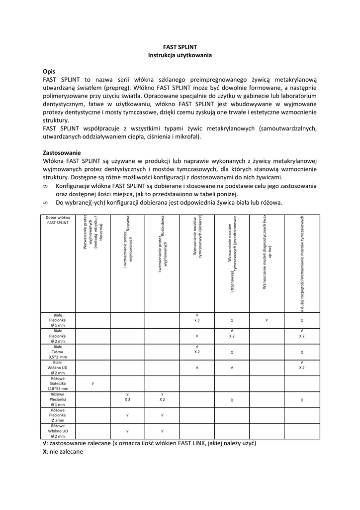 FAST SPLINT Instrukcja użytkowania Opis FAST SPLINT to nazwa serii włókna szklanego preimpregnowanego żywicą metakrylanową utwardzaną światłem (prepreg). Włókno FAST SPLINT może być dowolnie formowane, a następnie polimeryzowane przy użyciu światła. Opracowane specjalnie do użytku w gabinecie lub laboratorium dentystycznym, łatwe w użytkowaniu, włókno FAST SPLINT jest wbudowywane w wyjmowane protezy dentystyczne i mosty tymczasowe, dzięki czemu zyskują one trwałe i estetyczne wzmocnienie struktury. FAST SPLINT współpracuje z wszystkimi typami żywic metakrylanowych (samoutwardzalnych, utwardzanych oddziaływaniem ciepła, ciśnienia i mikrofal). o dużej rozpiętościWzmacnianie mostów tymczasowych Wzmacnianie mostów tymczasowych (przedtrzonowce i trzonowce) Wzmacnianie mostów tymczasowych (siekacze) i wzmacnianie protez Rozbudowa wyjmowanych Wzmacnianie modeli diagnostycznych (wax up-ów) Białe Plecionka Ø 1 mm Białe Plecionka Ø 2 mm Białe Taśma 0,5*2 mm Białe Włókno UD Ø 2 mm Różowe Siateczka 118*53 mm Różowe Plecionka Ø 1 mm Różowe Plecionka Ø 2mm Różowe Włókno UD Ø 2 mm i wzmacnianie protez Naprawa wyjmowanych Dobór włókna FAST SPLINT Wytwarzanie protez wyjmowanych (metodą wtrysku / tłoczenia) Zastosowanie Włókna FAST SPLINT są używane w produkcji lub naprawie wykonanych z żywicy metakrylanowej wyjmowanych protez dentystycznych i mostów tymczasowych, dla których stanowią wzmocnienie struktury. Dostępne są różne możliwości konfiguracji z dostosowanymi do nich żywicami. • Konfiguracje włókna FAST SPLINT są dobierane i stosowane na podstawie celu jego zastosowania oraz dostępnej ilości miejsca, jak to przedstawiono w tabeli poniżej. • Do wybranej(-ych) konfiguracji dobierana jest odpowiednia żywica biała lub różowa. √ χ √ x3 χ √ √ X2 √ X2 √ X2 χ χ √ √ √ X2 χ χ √ √ X3 √ X2 √ √ √ √ √: zastosowanie zalecane (x oznacza ilość włókien FAST LINK, jakiej należy użyć) Χ: nie zalecane Przeciwwskazania Alergie na metakrylany Efekty uboczne Według obecnego stanu wiedzy brak znanych efektów ubocznych. Środki ostrożności • Zawsze należy nakładać rękawice, aby unikać bezpośredniego kontaktu skóry rąk z włóknami FAST SPLINT: nie utwardzona żywica może wywoływać podrażnienie skóry rąk i oczu. Nie można również wśród możliwych zagrożeń wykluczyć uczuleń wskutek kontaktu długotrwałego. • Należy unikać kontaktu nie utwardzonego włókna FAST SPLINT z tkanką śluzową. • Przygotowywanie włókna FAST SPLINT musi odbywać się poza jamą ustną pacjenta. • Utwardzanie włókna FAST SPLINT powinno być prowadzone zgodnie z instrukcją, aż do jego całkowitego utwardzenia. • Podczas docinania lub doszlifowywania utwardzonych szyn należy zakładać okulary ochronne, maski i rękawice oraz używać odpowiednio wydajnego wyciągu: cząsteczki włókna szklanego mogą drażnić skórę. W przypadku podrażnienia nieprzyjemne uczucie można zlikwidować zmywając powierzchnię skóry wodą z łagodnym mydłem (delikatnie trąc). • Po otwarciu opakowania włókno FAST SPLINT musi zostać szybko zużyte bez narażania na oddziaływanie światła (np. słonecznego): zachodzi ryzyko przedwczesnego utwardzenia żywicy. Skład (% wagowo) Włókno szklane Dimetakrylan uretanu Dimetakrylan glikolu trietylenowegoy Pierwiastki nieorganiczne i barwniki Katalizatory/stabilizatory włókna preformowane 45-55% 30-40% 3-4% 4-5% <1% żywica w strzykawce 0% 70%-85% 8%-12% 8%-12% <1% Stosowanie FAST SPLINT A. Wytwarzanie protezy wyjmowanej z metakrylanu metylu: technika wtrysku. 1) Siateczkę FAST SPLINT koniecznie należy przymocować do modelu gipsowego, aby podczas procesu wtrysku siateczka nie przemieszczała się. W tym celu w środkowej części modelu należy nawiercić 2 małe (2 mm głębokości) otwory służące do zamocowania siateczki. 2) Na model gipsowy i otwory należy nałożyć separator wosku. Pozostawić do całkowitego wyschnięcia. 3) Rozgrzać i dopasować do modelu arkusz wosku (0,2 – 0,8 mm). W wosku wykonać 8 otworów wzdłuż grzbietu dziąsła i podstawy modelu. Otwory te będą wykorzystywane do wykonania łączników, które są niezbędne do uzyskania właściwego odstępu siateczki FAST SPLINT podczas procesu wtrysku. 4) Chroniąc przed światłem, przepełnić 8 otworów w wosku różową żywicą FAST SPLINT. 5) Chroniąc przed światłem, wyjąć siateczkę FAST SPLINT z opakowania blistrowego. Dociąć do rozmiaru zbliżonego do docelowego, nie zdejmując jeszcze folii ochronnej. Następnie zdjąć folię ochronną. 6) Siateczkę FAST SPLINT nałożyć na wosk na modelu. Upewnić się, że jest prawidłowo wyśrodkowana. 7) Model umieścić w aparacie SPLINTVAC i wyregulować wysokość, zgodnie z instrukcją aparatu. Zgodnie ze wskazaniami instrukcji aparatu, zamknąć SPLINTVAC i przy użyciu pompy próżniowej uformować siateczkę FAST SPLINT dopasowując ją do powierzchni modelu. SPLINTVAC i model umieścić w komorze do utwardzania światłem i utwardzić żywicę FAST SPLINT. Czas utwardzania dobrać według instrukcji zamieszczonej poniżej. 8) Wyjąć model z aparatu SPLINTVAC. Utwardzoną siateczkę FAST SPLINT zdjąć z modelu i usunąć z modelu i siateczki wszelkie pozostałości wosku (przy użyciu wrzącej wody/pary). Pozostawić do całkowitego wyschnięcia. 9) Upewnić się, że wszystkie szpary siateczki są wolne od żywicy. Jeżeli to konieczne, przebić otworki narzędziem. 10) Jeżeli to konieczne, odciąć wszystkie nieuformowane części siateczki. Aby efekt estetyczny był optymalny, siateczkę należy odciąć tuż przed linią graniczną zęby – brzeg dziąsła. Siateczkę należy dociąć przy użyciu krótkich, mocnych nożyczek. Dociętą siateczkę odłożyć. 11) Unieść model i, stosując standardową technikę, nałożyć powłokę separatora wosku. Pozostawić do całkowite