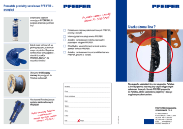 Pozostałe produkty serwisowe PFEIFER – przegląd eślij znacz i prz a z u t s ro Po p 69 - 39 8 07 1 7 m e s k fa Smarowanie środkiem smarującym PFEIFER-RL-S zwiększa znacznie żywotność liny ! Uszkodzona lina ? FF P otrzebujemy naprawy zakończeń linowych PFEIFER, prosimy o kontakt. FF Interesują nas inne usługi serwisu PFEIFER. Zużyte rowki kół linowych są główną przyczyną przedwcze snego zużycia liny. Regularna kontrola może temu zapobiec – mierniki do rowków PFEIFER „Worker“ dla wszystkich średnic! FF J esteśmy zainteresowani mobilną naprawą lin i pozostałymi usługami PFEIFER. FF C hcielibyśmy więcej informacji na temat systemu zamków linowych PFEIFER. FF J esteśmy zainteresowani innymi produktami serwisu PFEIFER, prosimy o kontakt. Oferujemy krótkie czasy dostawy lin pasujących do Państwa zastosowań. W przypadku uszkodzeń liny nie rezygnujcie Państwo z prostej i pewnej naprawy przy użyciu oryginalnych zakończeń linowych. Serwis PFEIFER przyjedzie do Państwa, skróci uszkodzoną część liny i zastąpi oryginalnym zakończeniem. Nr klienta Firma Osoba kontaktowa aństwu owiemy P Chetnie op liwościach o moz amków ystemu z naszego s FEIFER ! linowych P Dział Telefon PFEIFER Technika Linowa i Dzwigowa Sp. z o.o. Adres E-Mail DataPodpis 11.13.4c WA/Polen Nie stosowali Państwo jeszcze systemu zamków linowych PFEIFER? UL. WROCŁAWSKA 6 PL-55330 KrĘpice k/Wrocławia TELEFON +48-71-3 98 07 60 TELEFAKS+48-71-3 98 07 69 E-MAIL [email protected] INTERNET www.pfeifer.pl Nasze usługi dają doskonałe wyniki PFEIFER-Serwis zakończeń linowych JJ U stalenie, oznaczenie i profesjonalne usunięcie uszkodzonego miejsca. Liny podnoszenia i zmiany wysięgu w nowoczesnych żurawiach mobilnych i gąsienicowych są wyposażone w zaprasowane zakończenia linowe dla łatwiejszej wymiany oraz przelinowania. JJ D la osiągnięcia optymal nego rezultatu proces zalania zakończenia odbywa się przy użyciu specjalnej ramy serwisowej PFEIFER. Kiedy lina jest uszkodzona, oferujemy klientowi naprawy przy użyciu oryginalnych zakończeń linowych. Ten proces gwarantuje Państwu dalsze bezpieczne używanie liny z systemem zamków linowych. Zalane na zimno zakończenie linowe wykonane przez naszych certyfikowanych serwisantów osiąga 100 % wartości minimalnej siły zrywającej liny, którą w krótkim czasie można w pełni obciążać. Mogą Państwo zaufać naszemu doświadczeniu – dla Państwa bezpieczeństwa i komfortu. Serwis PFEIFER przyjeżdża na miejsca użytkowania żurawia. Serwis PFEIFER gwa JJ U sługa naprawy jest dokumentowana i potwierdzana odpo wiednim certyfikatem. ! Mobilne naprawy zakoń czeń linowych wymagają właściwej wiedzy oraz doświadczenia. Dlatego naprawy muszą być przeprowadzane przez regularnie szkolonych i sprawdzanych serwisantów. Każdy nasz autoryzo wany serwisant posiada odpowiedni certyfikat, który może chętnie Państwu okazać. rantuje Państwu naprawę według fabrycznych standardów. Po krótkim czasie naprawy można bezpiecznie używać liny. Naprawa lin producentów: • LIEBHERR • TEREX nowość! Oczywiście możliwa jest również naprawa lin z oryginalnym systemem zamków linowych PFEIFER. Orygina lne! Szybkie i bezpieczne przelinowanie lin zamontowanych w żurawiach gwarantuje tylko dopuszczony przez producenta ORYGINALNY system zamków linowych.
