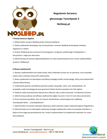 Regulamin Serwera głosowego TeamSpeak 3 NoSleep.pl