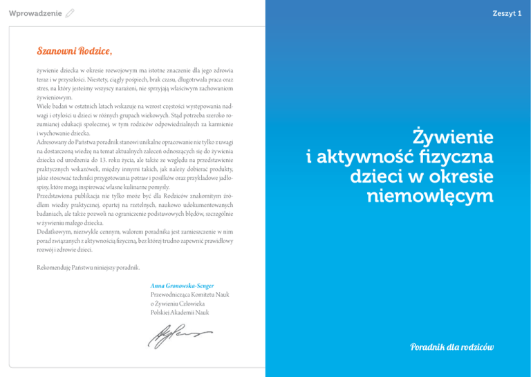 Wprowadzenie Zeszyt 1 Szanowni Rodzice, żywienie dziecka w okresie rozwojowym ma istotne znaczenie dla jego zdrowia teraz i w przyszłości. Niestety, ciągły pośpiech, brak czasu, długotrwała praca oraz stres, na który jesteśmy wszyscy narażeni, nie sprzyjają właściwym zachowaniom żywieniowym. Wiele badań w ostatnich latach wskazuje na wzrost częstości występowania nadwagi i otyłości u dzieci w różnych grupach wiekowych. Stąd potrzeba szeroko rozumianej edukacji społecznej, w tym rodziców odpowiedzialnych za karmienie i wychowanie dziecka. Adresowany do Państwa poradnik stanowi unikalne opracowanie nie tylko z uwagi na dostarczoną wiedzę na temat aktualnych zaleceń odnoszących się do żywienia dziecka od urodzenia do 13. roku życia, ale także ze względu na przedstawienie praktycznych wskazówek, między innymi takich, jak należy dobierać produkty, jakie stosować techniki przygotowania potraw i posiłków oraz przykładowe jadłospisy, które mogą inspirować własne kulinarne pomysły. Przedstawiona publikacja nie tylko może być dla Rodziców znakomitym źródłem wiedzy praktycznej, opartej na rzetelnych, naukowo udokumentowanych badaniach, ale także pozwoli na ograniczenie podstawowych błędów, szczególnie w żywieniu małego dziecka. Dodatkowym, niezwykle cennym, walorem poradnika jest zamieszczenie w nim porad związanych z aktywnością fizyczną, bez której trudno zapewnić prawidłowy rozwój i zdrowie dzieci. Żywienie i aktywność fizyczna dzieci w okresie niemowlęcym Rekomenduję Państwu niniejszy poradnik. Anna Gronowska-Senger Przewodnicząca Komitetu Nauk o Żywieniu Człowieka Polskiej Akademii Nauk Poradnik dla rodziców Spis treści Żywienie i aktywność fizyczna dzieci w okresie niemowlęcym ABC żywienia niemowląt 8 Karmienie piersią złotym standardem 9 Czym jest karmienie piersią i pokarm matki Halina Weker, Marta Barańska, Hanna Dyląg Kiedy i jak wprowadzać pokarmy uzupełniające Rozwój preferencji pokarmowych dziecka w 1. roku życia Pojęcie laktacji – podstawowe informacje Jak wygląda prawidłowe karmienie Znaczenie karmienia piersią dla rozwoju Z jakiej żywności korzystać w żywieniu niemowląt psychofizycznego dziecka oraz pogłębienia Charakterystyka podstawowych produktów w diecie bliskości matki i jej dziecka 6 9 10 11 Ważność karmienia piersią dla rozwoju odporności dziecka Medyczne rekomendacje karmienia piersią Najczęstsze problemy i okresy newralgiczne dla karmienia piersią Produkty zastępujące pokarm matki Kodeks marketingu produktów zastępujących mleko kobiece Upowszechnianie karmienia piersią Dlaczego upowszechnienie karmienia piersią napotyka trudności 13 14 niemowląt – uwagi praktyczne Jak gotować Najczęstsze problemy zdrowotne i błędy obserwowane 26 27 29 30 36 7 w żywieniu dzieci w 1. roku życia 41 Aktywność ruchowa dziecka – naturalną potrzebą 44 Maria Jodkowska, Anna Oblacińska 15 15 Rola aktywności ruchowej dzieci w wieku niemowlęcym 45 16 17 Umiejętności motoryczne 45 Potrzeby niemowląt 46 Rady dla rodziców 47 47 48 48 48 18 Najczęstsze przyczyny niepowodzeń w karmieniu i praktyki rodzicielskie związane z żywieniem dziecka 24 12 Medyczne przeciwwskazania do karmienia piersią i mlekiem matki dla dziecka i matki 12 Jak kontrolować, czy ilość pokarmu jest wystarczająca 11 22 Halina Weker, Marta Barańska, Hanna Dyląg Rozszerzanie diety niemowląt Barbara Kowalewska-Kantecka dla noworodka i niemowlęcia ywienie niemowląt niekarmionych piersią Ż – aktualne zalecenia / schemat 18 Dzieci w wieku 0–3 miesięce Dzieci w wieku 4–6 miesięcy Dzieci w wieku 7–9 miesięcy Dzieci w wieku 10–12 miesięcy ABC żywienia niemowląt ABC żywienia niemowląt 8 Karmienie piersią złotym standardem Karmienie piersią to zgodny z odwiecznym prawem naturalnym sposób odżywiania noworodków i niemowląt. Pokarm matki zapewnia wszelkie niezbędne dla życia i rozwoju dziecka składniki pokarmowe, budulcowe i ogólnorozwojowe, warunkujące właściwe dojrzewanie narządów i ochronę immunologiczną. Karmienie wpływa również na pogłębianie więzi, bliskości uczuciowej oraz emocjonalnej matki i jej dziecka. Karmienie piersią jest instynktownym, wręcz pozarozumowym działaniem wszystkich matek od zarania dziejów. Czym jest karmienie piersią i pokarm matki dla noworodka i niemowlęcia Karmienie naturalne jest złotym standardem żywienia dzieci w wieku noworodkowym i niemowlęcym. Pokarm kobiecy jest substancją gatunkowo swoistą, zawierającą wszystkie niezbędne dla organizmu dziecka składniki odżywcze, budulcowe i mineralne, energię, hormony i enzymy. Wyposażony jest też we właściwości odpornościowe oraz czynniki wzrostu. Te ostatnie wpływają na prawidłowe procesy dojrzewania tkankowego, w tym przede wszystkim układu nerwowego, siatkówki oka czy przewodu pokarmowego. Składniki pokarmu kobiecego zapewniają karmionemu nim dziecku najlepszy możliwy rozwój wszystkich narządów. Ogromną rolę odgrywają właściwości odpornościowe, które chronią całkowicie bezbronnego wobec zakażenia noworodka, i czynniki wzrostu tkankowego dla tak ważnych narządów, jak ośrodkowy układ nerwowy w jego zdolnościach asocjacyjnych, siatkówka oka czy narządy zmysłów, w tym słuchu oraz równowagi. Dziecko karmione piersią otrzymuje biologiczne bogactwo niemożliwe do zastąpienia przez mieszanki przygotowane z mleka krowiego. Unikalność pokarmu wobec substytutów mleka kobiecego polega na 9 ABC żywienia niemowląt 10 wartościach niemożliwych do odtworzenia w warunkach laboratoryjnych i przemysłowych, związanych zarówno ze składem samego pokarmu, jak i z aktem karmienia piersią. Żadne modyfikacje i „upodabniania” nie są w stanie odwzorować idealnego dzieła natury, jakim jest pokarm kobiecy. Istnieje jeszcze jeden niezwykle ważny argument popierający karmienie naturalne. Ma on działanie dalekosiężne. 
