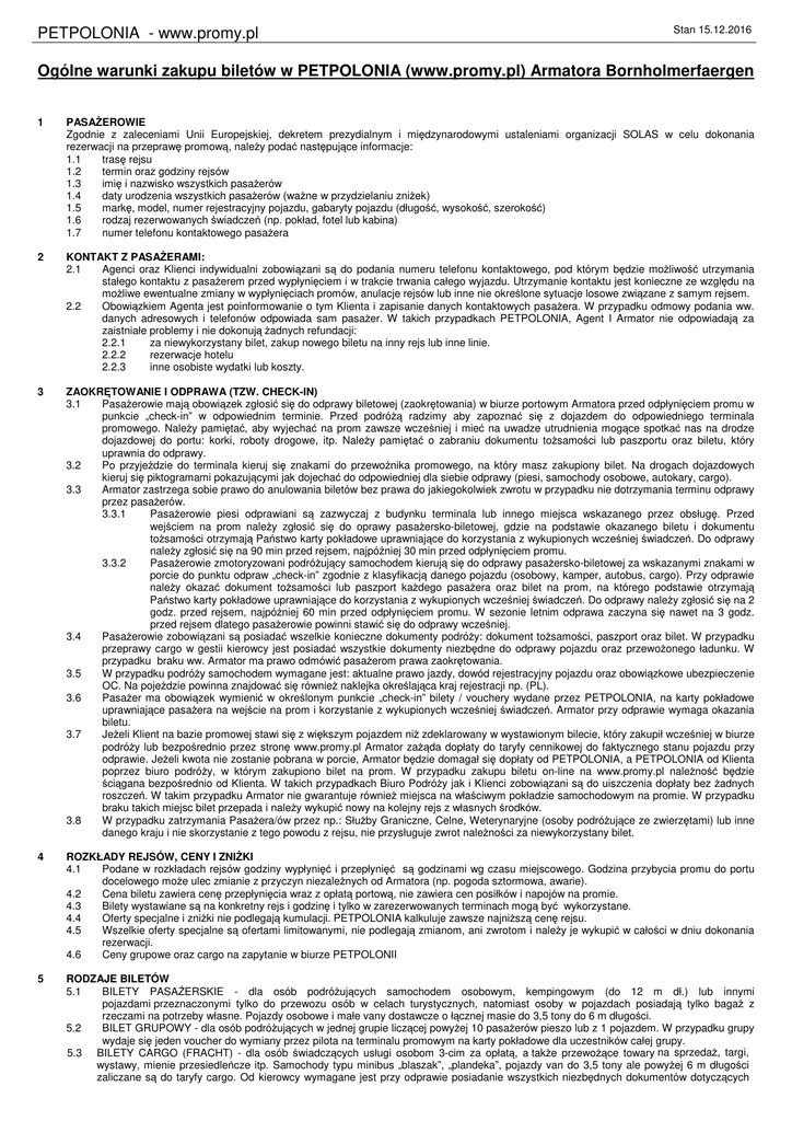 PETPOLONIA - www.promy.pl Stan 15.12.2016 Ogólne warunki zakupu biletów w PETPOLONIA (www.promy.pl) Armatora Bornholmerfaergen 1 PASAŻEROWIE Zgodnie z zaleceniami Unii Europejskiej, dekretem prezydialnym i międzynarodowymi ustaleniami organizacji SOLAS w celu dokonania rezerwacji na przeprawę promową, należy podać następujące informacje: 1.1 trasę rejsu 1.2 termin oraz godziny rejsów 1.3 imię i nazwisko wszystkich pasażerów 1.4 daty urodzenia wszystkich pasażerów (ważne w przydzielaniu zniżek) 1.5 markę, model, numer rejestracyjny pojazdu, gabaryty pojazdu (długość, wysokość, szerokość) 1.6 rodzaj rezerwowanych świadczeń (np. pokład, fotel lub kabina) 1.7 numer telefonu kontaktowego pasażera 2 KONTAKT Z PASAŻERAMI: 2.1 Agenci oraz Klienci indywidualni zobowiązani są do podania numeru telefonu kontaktowego, pod którym będzie możliwość utrzymania stałego kontaktu z pasażerem przed wypłynięciem i w trakcie trwania całego wyjazdu. Utrzymanie kontaktu jest konieczne ze względu na możliwe ewentualne zmiany w wypłynięciach promów, anulacje rejsów lub inne nie określone sytuacje losowe związane z samym rejsem. 2.2 Obowiązkiem Agenta jest poinformowanie o tym Klienta i zapisanie danych kontaktowych pasażera. W przypadku odmowy podania ww. danych adresowych i telefonów odpowiada sam pasażer. W takich przypadkach PETPOLONIA, Agent I Armator nie odpowiadają za zaistniałe problemy i nie dokonują żadnych refundacji: 2.2.1 za niewykorzystany bilet, zakup nowego biletu na inny rejs lub inne linie. 2.2.2 rezerwacje hotelu 2.2.3 inne osobiste wydatki lub koszty. 3 ZAOKRĘTOWANIE I ODPRAWA (TZW. CHECK-IN) 3.1 Pasażerowie mają obowiązek zgłosić się do odprawy biletowej (zaokrętowania) w biurze portowym Armatora przed odpłynięciem promu w punkcie „check-in” w odpowiednim terminie. Przed podróżą radzimy aby zapoznać się z dojazdem do odpowiedniego terminala promowego. Należy pamiętać, aby wyjechać na prom zawsze wcześniej i mieć na uwadze utrudnienia mogące spotkać nas na drodze dojazdowej do portu: korki, roboty drogowe, itp. Należy pamiętać o zabraniu dokumentu tożsamości lub paszportu oraz biletu, który uprawnia do odprawy. 3.2 Po przyjeździe do terminala kieruj się znakami do przewoźnika promowego, na który masz zakupiony bilet. Na drogach dojazdowych kieruj się piktogramami pokazującymi jak dojechać do odpowiedniej dla siebie odprawy (piesi, samochody osobowe, autokary, cargo). Armator zastrzega sobie prawo do anulowania biletów bez prawa do jakiegokolwiek zwrotu w przypadku nie dotrzymania terminu odprawy 3.3 przez pasażerów. 3.3.1 Pasażerowie piesi odprawiani są zazwyczaj z budynku terminala lub innego miejsca wskazanego przez obsługę. Przed wejściem na prom należy zgłosić się do oprawy pasażersko-biletowej, gdzie na podstawie okazanego biletu i dokumentu tożsamości otrzymają Państwo karty pokładowe uprawniające do korzystania z wykupionych wcześniej świadczeń. Do odprawy należy zgłosić się na 90 min przed rejsem, najpóźniej 30 min przed odpłynięciem promu. 3.3.2 Pasażerowie zmotoryzowani podróżujący samochodem kierują się do odprawy pasażersko-biletowej za wskazanymi znakami w porcie do punktu odpraw „check-in” zgodnie z klasyfikacją danego pojazdu (osobowy, kamper, autobus, cargo). Przy odprawie należy okazać dokument tożsamości lub paszport każdego pasażera oraz bilet na prom, na którego podstawie otrzymają Państwo karty pokładowe uprawniające do korzystania z wykupionych wcześniej świadczeń. Do odprawy należy zgłosić się na 2 godz. przed rejsem, najpóźniej 60 min przed odpłynięciem promu. W sezonie letnim odprawa zaczyna się nawet na 3 godz. przed rejsem dlatego pasażerowie powinni stawić się do odprawy wcześniej. 3.4 Pasażerowie zobowiązani są posiadać wszelkie konieczne dokumenty podróży: dokument tożsamości, paszport oraz bilet. W przypadku przeprawy cargo w gestii kierowcy jest posiadać wszystkie dokumenty niezbędne do odprawy pojazdu oraz przewożonego ładunku. W przypadku braku ww. Armator ma prawo odmówić pasażerom prawa zaokrętowania. 3.5 W przypadku podróży samochodem wymagane jest: aktualne prawo jazdy, dowód rejestracyjny pojazdu oraz obowiązkowe ubezpieczenie OC. Na pojeździe powinna znajdować się również naklejka określająca kraj rejestracji np. (PL). 3.6 Pasażer ma obowiązek wymienić w określonym punkcie „check-in” bilety / vouchery wydane przez PETPOLONIA, na karty pokładowe uprawniające pasażera na wejście na prom i korzystanie z wykupionych wcześniej świadczeń. Armator przy odprawie wymaga okazania biletu. 3.7 Jeżeli Klient na bazie promowej stawi się z większym pojazdem niż zdeklarowany w wystawionym bilecie, który zakupił wcześniej w biurze podróży lub bezpośrednio przez stronę www.promy.pl Armator zażąda dopłaty do taryfy cennikowej do faktycznego stanu pojazdu przy odprawie. Jeżeli kwota nie zostanie pobrana w porcie, Armator będzie domagał się dopłaty od PETPOLONIA, a PETPOLONIA od Klienta poprzez biuro podróży, w którym zakupiono bilet na prom. W przypadku zakupu biletu on-line na www.promy.pl należność będzie ściągana bezpośrednio od Klienta. W takich przypadkach Biuro Podróży jak i Klienci zobowiązani są do uiszczenia dopłaty bez żadnych roszczeń. W takim przypadku Armator nie gwarantuje również miejsca na właściwym pokładzie samochodowym na promie. W przypadku braku takich miejsc bilet przepada i należy wykupić nowy na kolejny rejs z własnych środków. 3.8 W przypadku zatrzymania Pasażera/ów przez np.: Służby Graniczne, Celne, Weterynaryjne (osoby podróżujące ze zwierzętami) lub inne danego kraju i nie skorzystanie z tego powodu z rejsu, nie przysługuje zwrot należności za niewykorzystany bilet. 4 ROZKŁADY REJSÓW, CENY I ZNIŻKI 4.1 Podane w rozkładach rejsów godziny wypłynięć i przepłynięć są godzinam