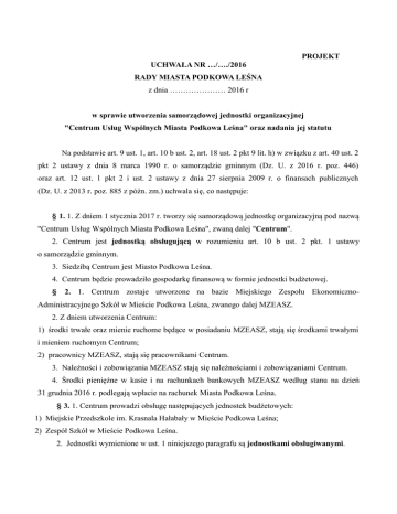 PROJEKT UCHWAŁA NR …/…./2016 RADY MIASTA PODKOWA LEŚNA z dnia ………………… 2016 r w sprawie utworzenia samorządowej jednostki organizacyjnej "Centrum Usług Wspólnych Miasta Podkowa Leśna" oraz nadania jej statutu Na podstawie art. 9 ust. 1, art. 10 b ust. 2, art. 18 ust. 2 pkt 9 lit. h) w związku z art. 40 ust. 2 pkt 2 ustawy z dnia 8 marca 1990 r. o samorządzie gminnym (Dz. U. z 2016 r. poz. 446) oraz art. 12 ust. 1 pkt 2 i ust. 2 ustawy z dnia 27 sierpnia 2009 r. o finansach publicznych (Dz. U. z 2013 r. poz. 885 z późn. zm.) uchwala się, co następuje: § 1. 1. Z dniem 1 stycznia 2017 r. tworzy się samorządową jednostkę organizacyjną pod nazwą "Centrum Usług Wspólnych Miasta Podkowa Leśna", zwaną dalej "Centrum". 2. Centrum jest jednostką obsługującą w rozumieniu art. 10 b ust. 2 pkt. 1 ustawy o samorządzie gminnym. 3. Siedzibą Centrum jest Miasto Podkowa Leśna. 4. Centrum będzie prowadziło gospodarkę finansową w formie jednostki budżetowej. § 2. 1. Centrum zostaje utworzone na bazie Miejskiego Zespołu Ekonomiczno- Administracyjnego Szkół w Mieście Podkowa Leśna, zwanego dalej MZEASZ. 2. Z dniem utworzenia Centrum: 1) środki trwałe oraz mienie ruchome będące w posiadaniu MZEASZ, stają się środkami trwałymi i mieniem ruchomym Centrum; 2) pracownicy MZEASZ, stają się pracownikami Centrum. 3. Należności i zobowiązania MZEASZ stają się należnościami i zobowiązaniami Centrum. 4. Środki pieniężne w kasie i na rachunkach bankowych MZEASZ według stanu na dzień 31 grudnia 2016 r. podlegają wpłacie na rachunek Miasta Podkowa Leśna. § 3. 1. Centrum prowadzi obsługę następujących jednostek budżetowych: 1) Miejskie Przedszkole im. Krasnala Hałabały w Mieście Podkowa Leśna; 2) Zespół Szkół w Mieście Podkowa Leśna. 2. Jednostki wymienione w ust. 1 niniejszego paragrafu są jednostkami obsługiwanymi. 3. Jednostka obsługująca zapewnia jednostkom obsługiwanym obsługę administracyjną, finansową i organizacyjną oraz z zakresu rachunkowości i sprawozdawczości. 4. Zakres obowiązków powierzonych jednostce obsługiwanej w ramach wspólnej obsługi został określony w statucie Centrum. § 4. Centrum nadaje się statut, który stanowi załącznik do niniejszej uchwały. § 5. Wykonanie uchwały powierza się Burmistrzowi Miasta Podkowa Leśna. § 6. Uchwała wchodzi w życie po upływie 14 dni od ogłoszenia w Dzienniku Urzędowym Województwa Mazowieckiego. Radca prawny /-/ Monika Płaszewska-Opalińska PROJEKT Załącznik do Uchwały Nr .................... Rady Miasta Podkowa Leśna z dnia ……………….. Statut Centrum Usług Wspólnych Rozdział 1. Postanowienia ogólne § 1. 1. „Centrum Usług Wspólnych Miasta Podkowa Leśna”, zwane dalej Centrum, jest jednostką organizacyjną Miasta Podkowa Leśna, działającą w formie jednostki budżetowej. 2. Centrum utworzono w celu prowadzenia wspólnej obsługi administracyjnej, finansowej i organizacyjnej jednostek, o których mowa w art. 10 a ustawy o samorządzie gminnym. 3. Centrum działa w szczególności na podstawie: 1) ustawy z dnia 8 marca 1990 r. o samorządzie gminnym (Dz. U. z 2016 r. poz. 446); 2) ustawy z dnia 27 sierpnia 2009 r. o finansach publicznych (Dz. U. z 2013 r. poz. 885 z późn. zm.); 3) ustawy z dnia 29 września 1994 r. o rachunkowości (Dz. U. z 2016 r. poz. 1047); 4) niniejszego statutu. § 2. 1. Siedzibą Centrum jest Miasto Podkowa Leśna. 2. Obszarem działania Centrum jest Miasto Podkowa Leśna, zwana dalej Miastem. 3. Centrum może używać skrótu „CUW”. Rozdział 2. Zadania Centrum Usług Wspólnych § 3. 1. Centrum Usług Wspólnych wykonuje zadania w stosunku do jednostek obsługiwanych w zakresie rachunkowości i sprawozdawczości, zgodnie z ustawą o rachunkowości, o finansach publicznych oraz przepisach wykonawczych dotyczących jednostek budżetowych. 2. Działania Centrum w zakresie obsługi finansowo – rachunkowej Centrum i jednostek obsługiwanych oraz w zakresie prowadzenia gospodarki finansowo-księgowej Centrum oraz jednostek obsługiwanych zgodnie z obowiązującymi przepisami prawa, w szczególności z ustawą o rachunkowości, ustawą o finansach publicznych oraz z przepisami wykonawczymi dotyczącymi jednostek budżetowych, obejmują w szczególności: a) prowadzenie, na podstawie dowodów księgowych, ksiąg rachunkowych, ujmujących zapisy zdarzeń w porządku chronologicznym i systematycznym, b) okresowe ustalanie lub sprawdzanie drogą inwentaryzacji rzeczywistego stanu aktywów i pasywów, c) wycenę aktywów i pasywów oraz ustalanie wyniku finansowego, d) opracowywanie planów finansowych Centrum oraz współpraca z kierownikami jednostek obsługiwanych w zakresie sporządzania planów finansowych tych jednostek, e) sporządzanie sprawozdań finansowych, f) gromadzenie i przechowywanie dowodów księgowych oraz pozostałej dokumentacji przewidzianej ustawą, g) sporządzanie list wynagrodzeń i innych świadczeń ze stosunku pracy, dokonywanie ich wypłat, h) naliczanie i odprowadzanie należnych świadczeń na rzecz ZUS i urzędu skarbowego, i) ewidencjonowanie danych o zatrudnieniu i wynagrodzeniu, j) prowadzenie obsługi rachunków bankowych, k) obsługę finansowo-księgowa zakładowego funduszu świadczeń socjalnych, l) rozliczanie inwentaryzacji składników majątkowych, ł) obsługę finansowo - księgowa dofinansowania dokształcania i doskonalenia zawodowego nauczycieli, m) obsługę finansowo - księgowa funduszu zdrowotnego dla nauczycieli, n) rozliczanie delegacji krajowych i zagranicznych pracowników, o) przygotowanie materiałów niezbędnych do sporządzania projektu uchwały budżetowej Miasta Podkowa Leśna, p) rozliczanie średniego wynagrodzenia nauczycieli zgodnie z art. 30 a ustawy Karta Nauczyciela. 3. Do zadań Centrum Usług Wspólnych należy obsługa administracyjno-organizacyjna jednostek obsługiwanych, a w szczególności: a) prowadzenie teczek akt 