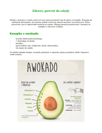 Zdrowy powrót do szkoły Myśląc o jedzeniu w szkole, pierwsza rzecz jaka przychodzi nam do głowy to kanapki. Wracając do szkolnych obowiązków, nie musimy jednak wracać do starych nawyków żywieniowych. Wręcz przeciwnie, jest to odpowiedni moment na zmiany. Dlatego poniżej przedstawiam 3 przepisy na kanapki w zdrowym wydaniu. Kanapka z awokado • • • • • kromka chleba pełnoziarnistego, ¼ dojrzałego awokado, pomidor, garść kiełków (np. rzodkiewki, fasoli, słonecznika), sól, pieprz do smaku Na chlebie układać kolejno: awokado pokrojone w plasterki, plastry pomidora, kiełki. Doprawić wedle uznania. Na słodko • kromka chleba razowego, • • • • masło orzechowe, banan (pokrojony w plasterki), pokruszone orzechy włoskie, miód do polania (opcjonalnie). , Z łososiem • • • • • • kromka chleba pełnoziarnistego, łyżka twarożku śmietankowego, plasterek łososia wędzonego, szczypiorek, mała szalotka, pieprz, sól (opcjonalnie). Serek wymieszać ze szczypiorkiem, posmarować nim chleb. Na wierzch ułożyć łososia oraz pokrojoną szalotkę, doprawić. Przygotowała Izabela Sieg, klasa 1a